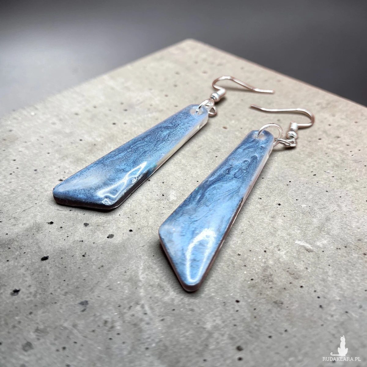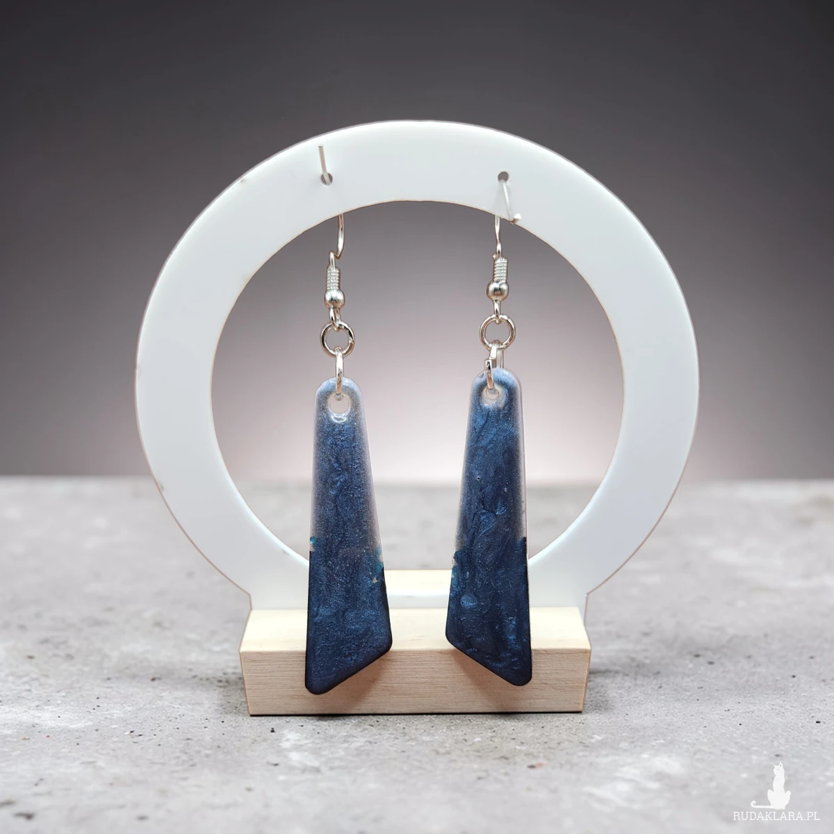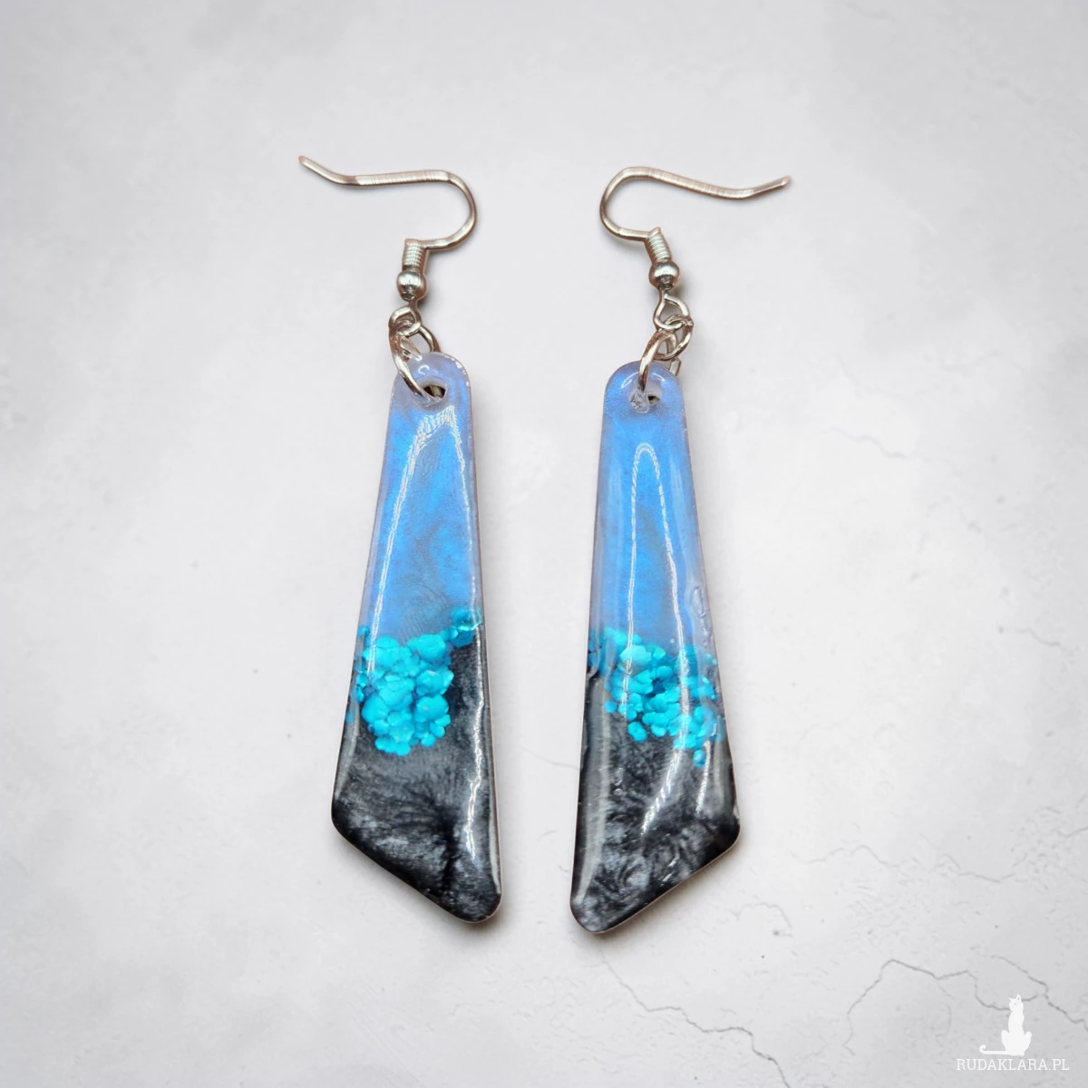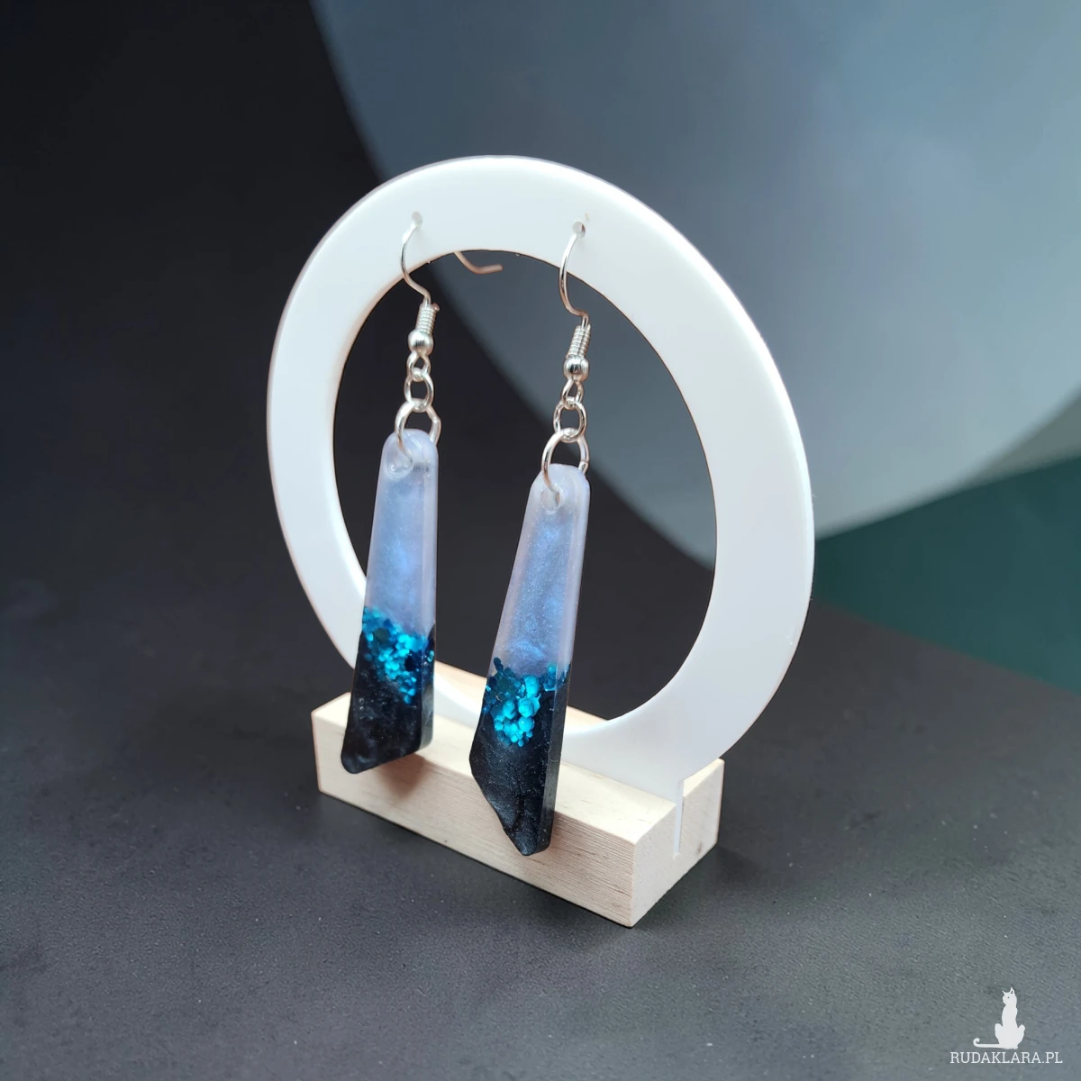 Kolczyki zachwycają wyjątkowym przejściem kolorów – od delikatnego, półtransparentnego błękitu po głęboki, ciemny dół z zatopionymi, mieniącymi się drobinkami przypominającymi morskie kryształki. Efekt zmienia się w zależności od światła, co jest charakterystyczne dla biżuterii z żywicy .