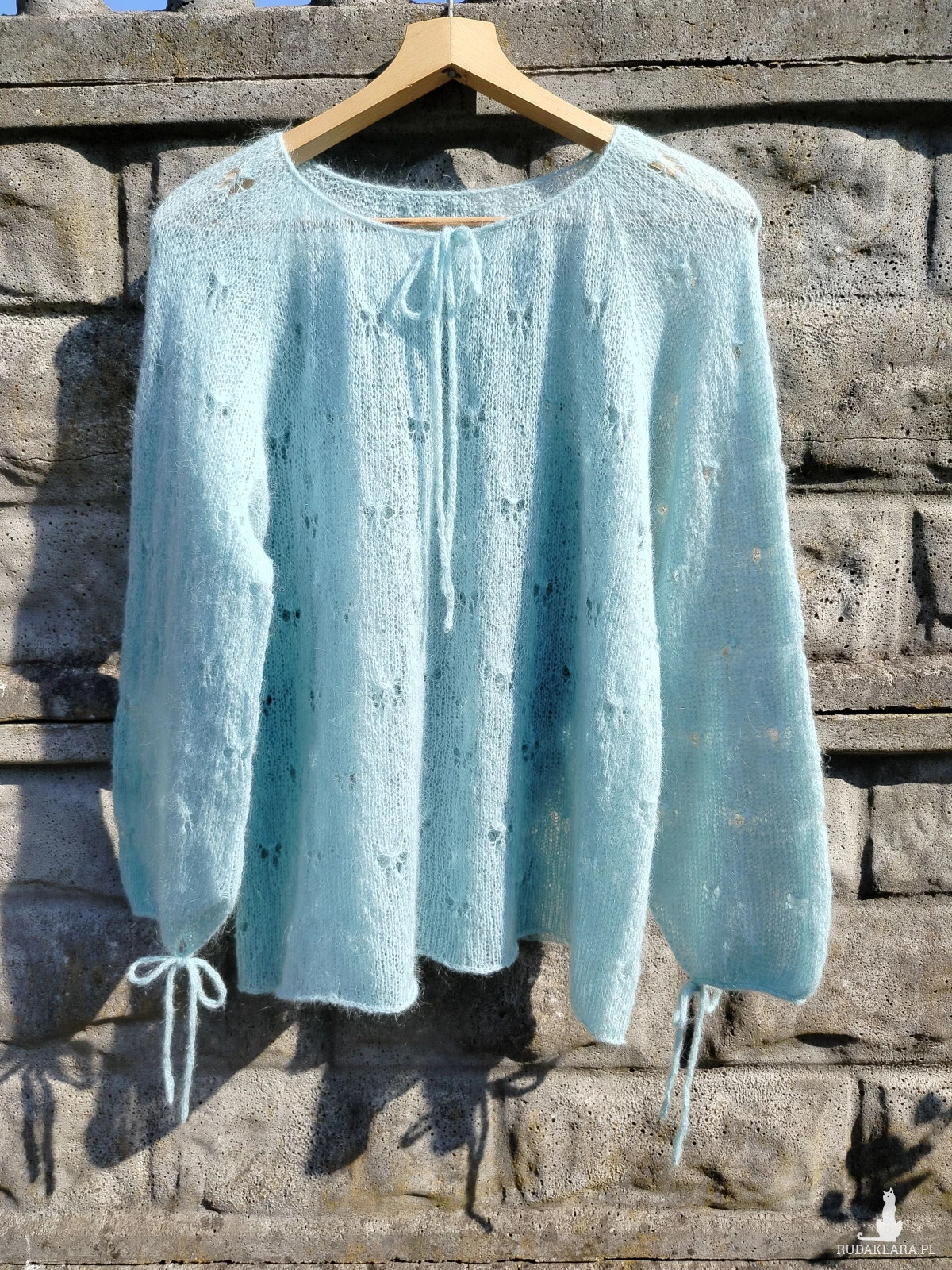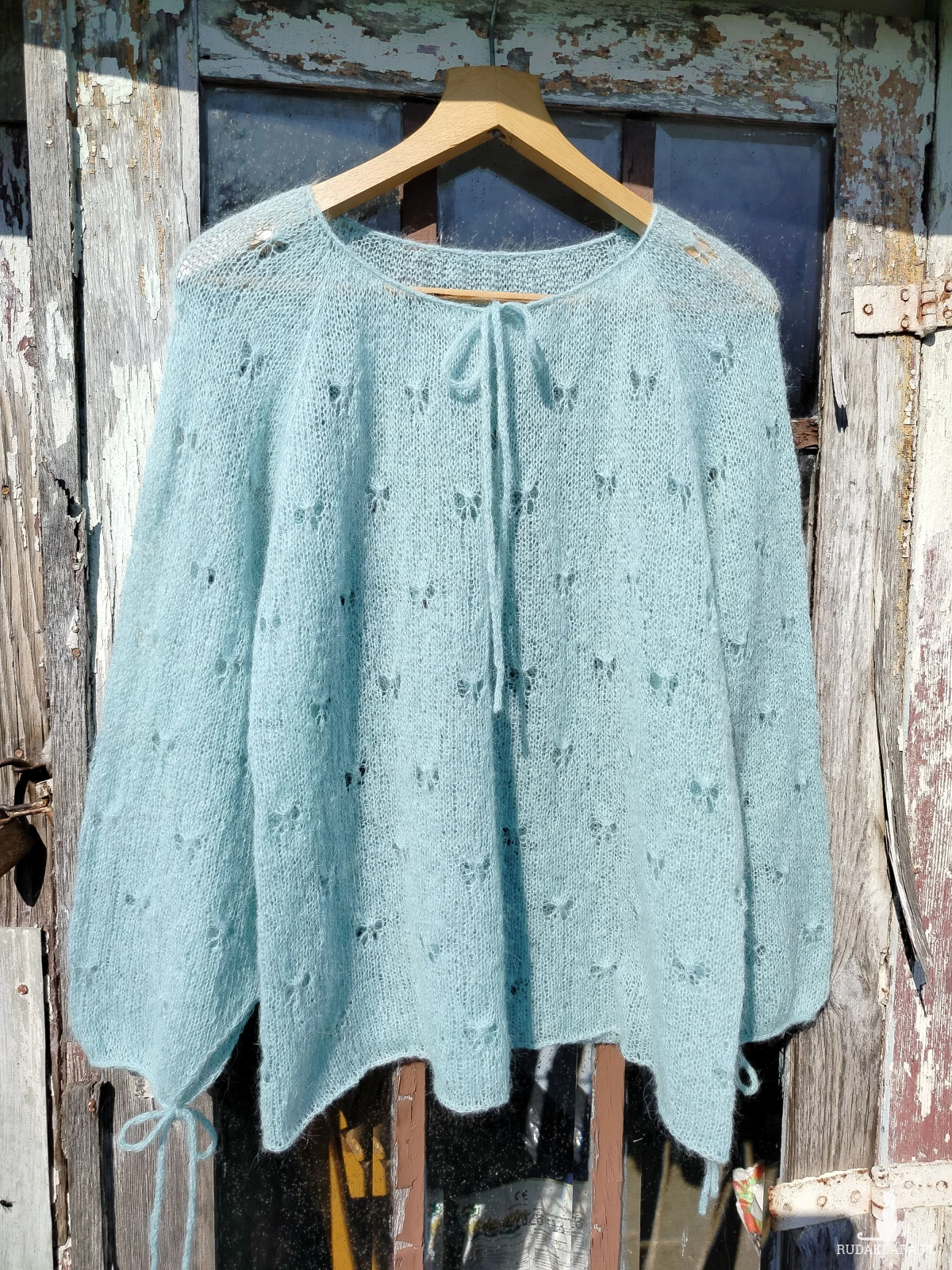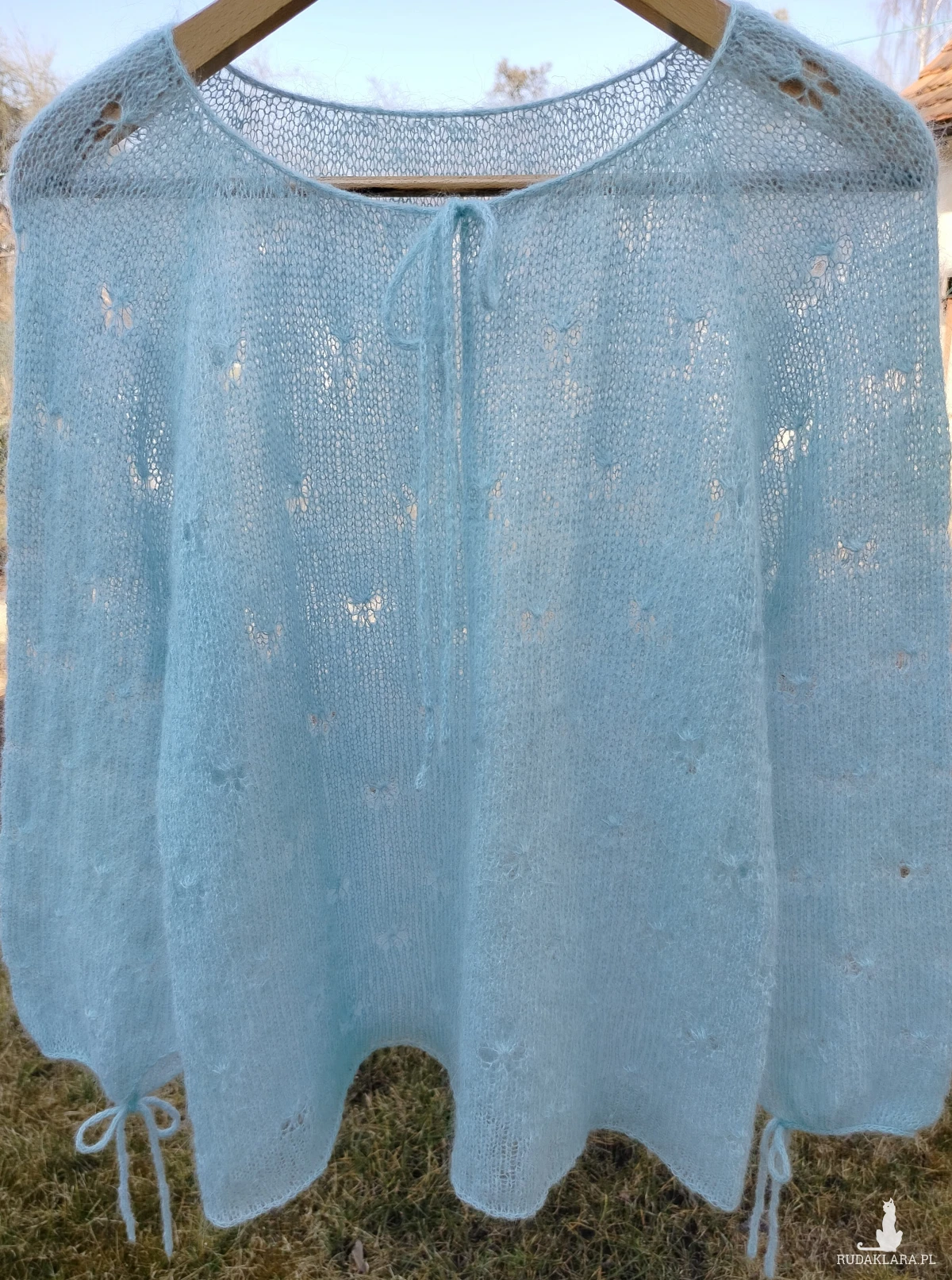 Ręcznie wykonana bluzka we wzory motylków z wysokiej jakości moheru – miękka, lekka i bardzo przyjemna w dotyku. Idealna na różne okazji. Spraw sobie przyjemność.