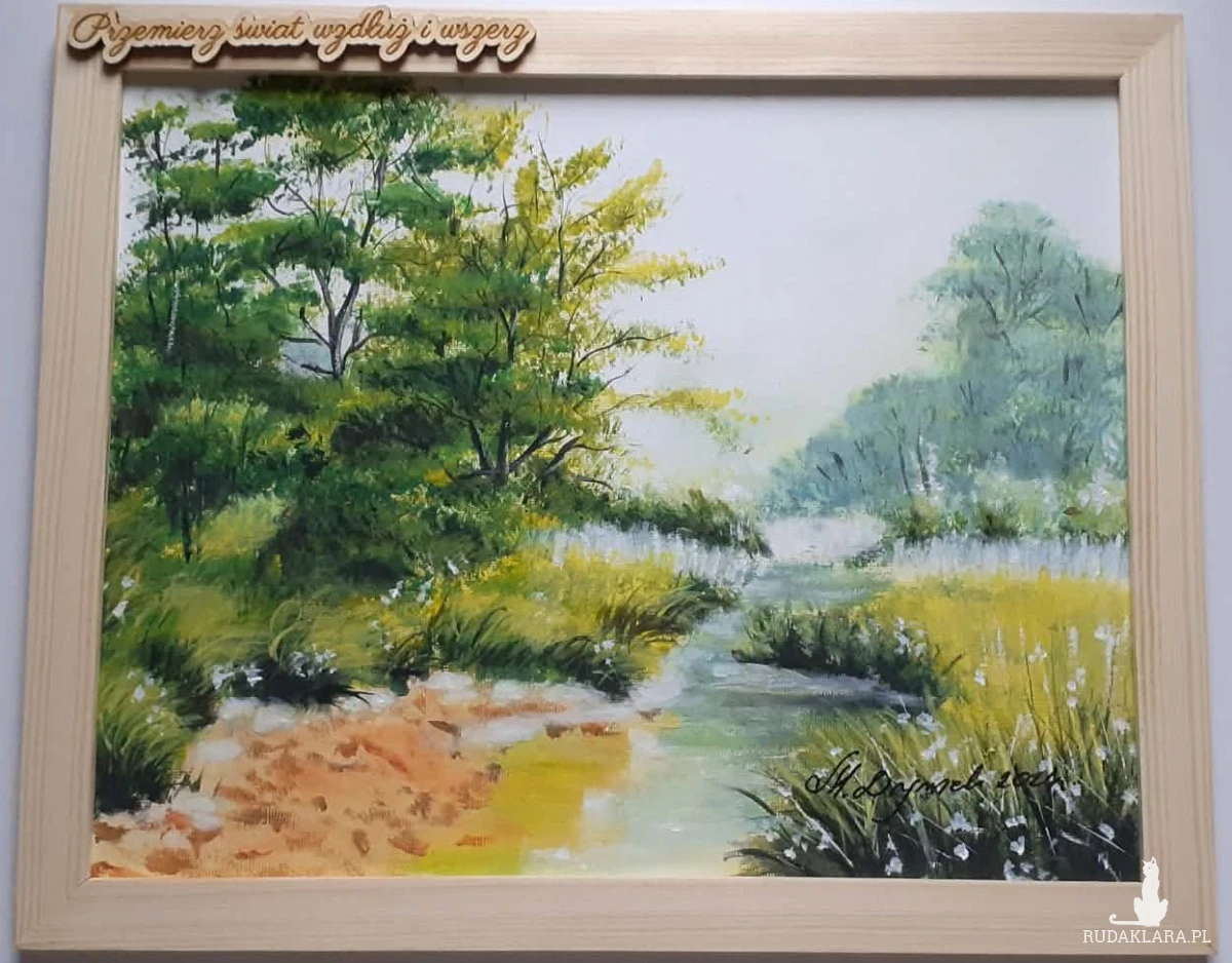 Obraz duszą malowany, gotowy na prezent pejzaż w ramie. Wprowadzi do wnętrza spokój, świeżość, ciepłą estetykę i odrobinę magii. Pięknie wypełni i udekoruje ściany salonu, sypialni, czy gabinetu dodając wnętrzom intrygującej elegancji.