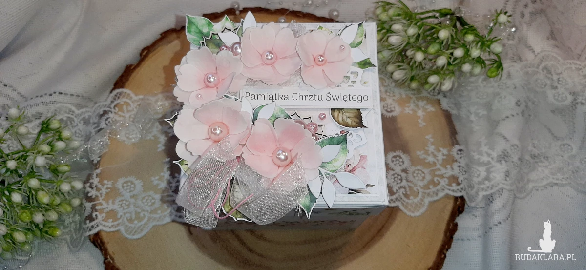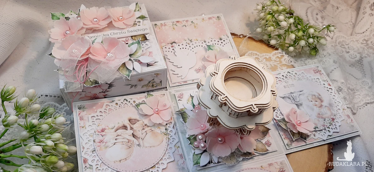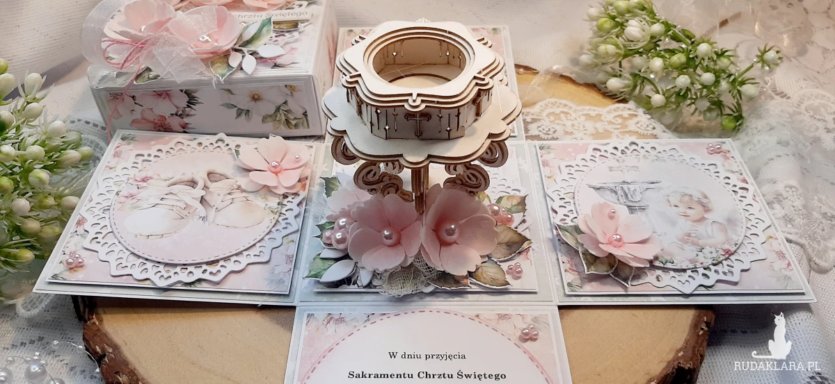 Exploding Box na Chrzest dla dziewczynki. Będzie fajną pamiątką. W środku znajduje się kieszonka na pieniążki. Na kółku z życzeniami na górze jest miejsce na wpisanie imienia dziecka a nadole na podpis osoby wręczającej. Wymiary zamkniętego boxa to około 10,5x10,5 cm. Po rozłożeniu 30x30 cm.