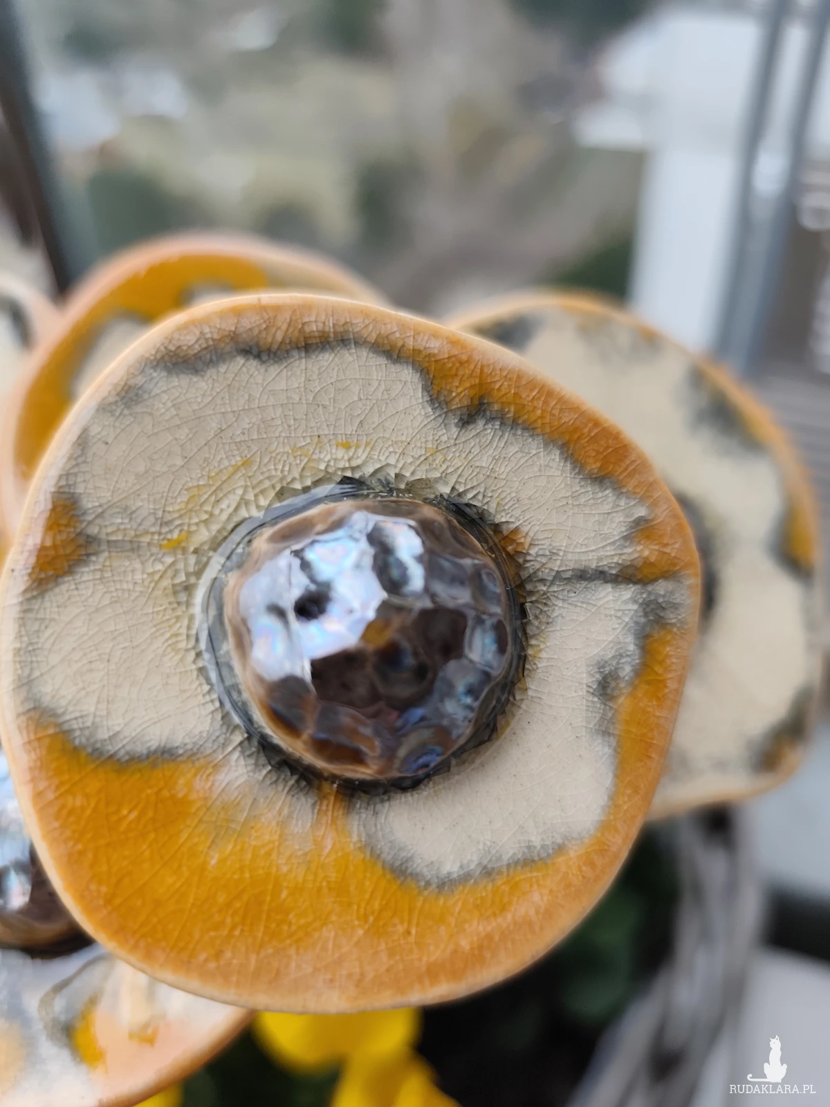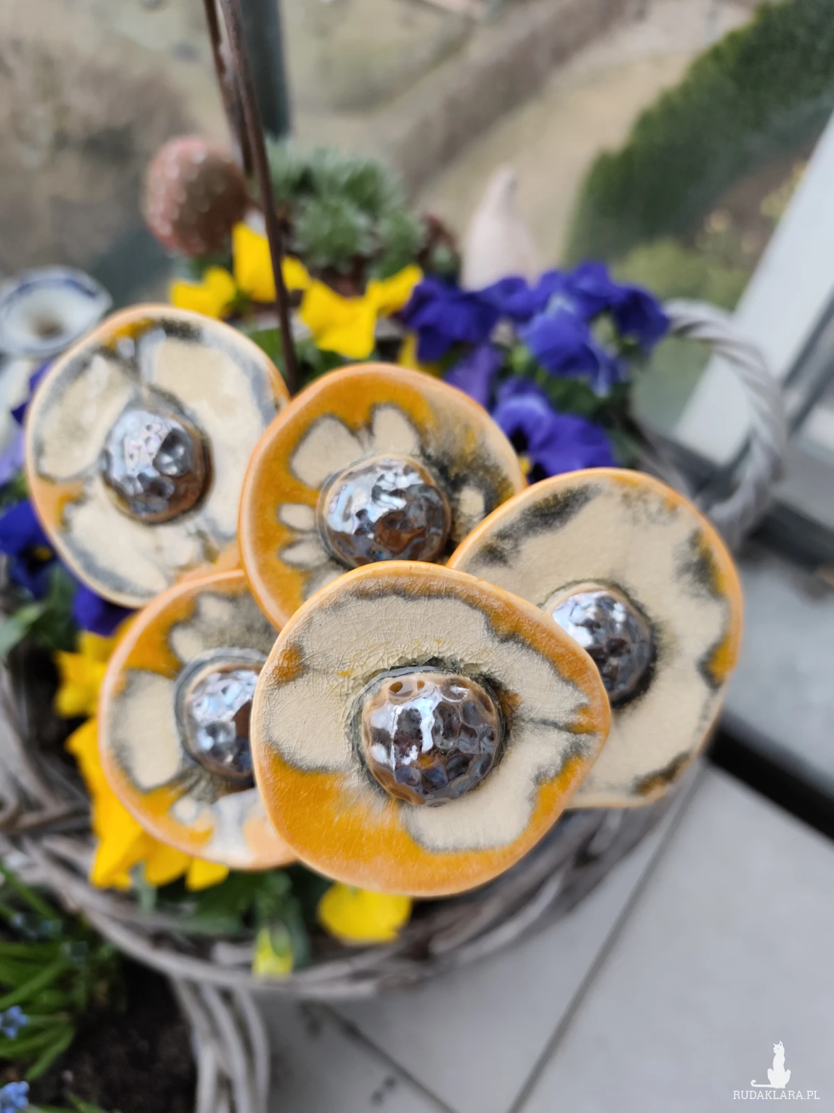 Kwiaty ceramiczne 5 szt, wykonane ręcznie z gliny szamotowej, szkliwione i dwukrotnie wypalane w piecu ceramicznym na 1050 stopni. Polecam do domu, na balkon lub do ogrodu. Średnica około 6 cm. Nie przekwitają :)