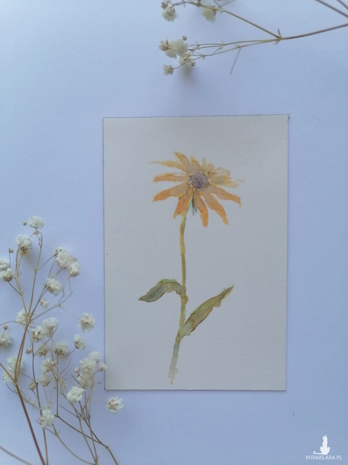 Do tego obrazka mam szczególny sentyment - "pozująca" do niego rudbekia pochodzi z ogrodu mojej babci. Kwiaty przypominające małe słoneczka rosną tam, odkąd pamiętam. I chyba znam je już na pamięć, bo żadnego z dotychczas malowanych kwiatów nie namalowałam jeszcze tak szybko i z tak wielką przyjemnością.