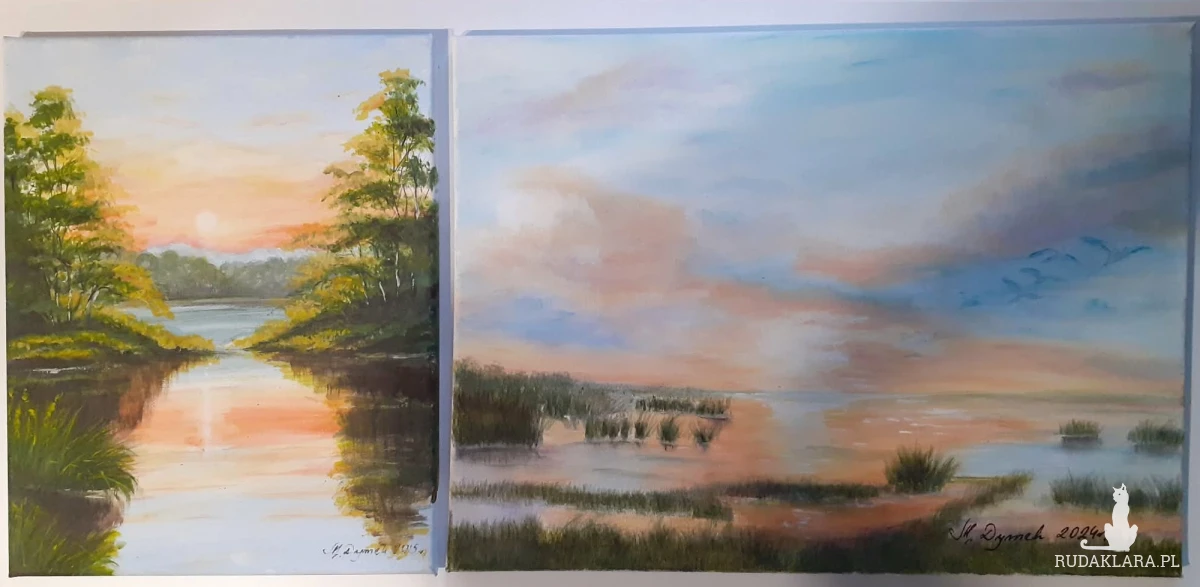 - Tematyka: Polski krajobraz z motywem wody i nieba. Brzeg spokojnego jeziora o zachodzie słońca emanuje ciszą i nostalgią