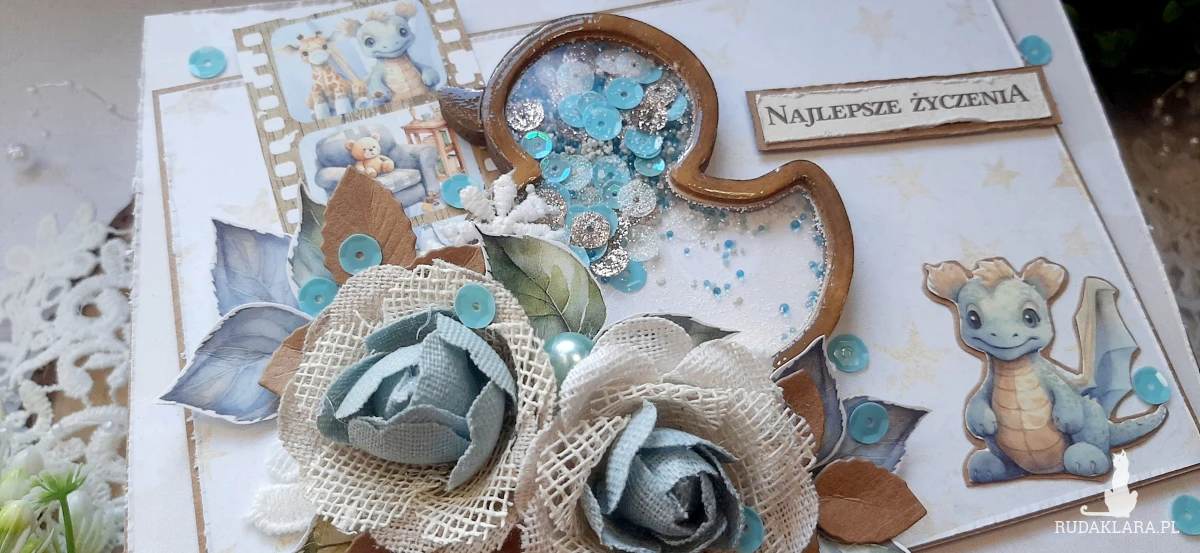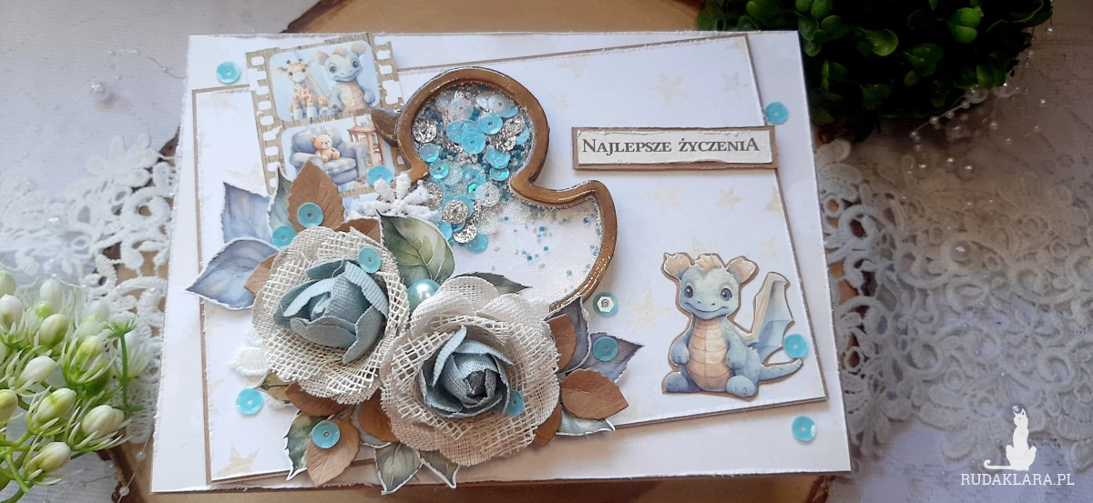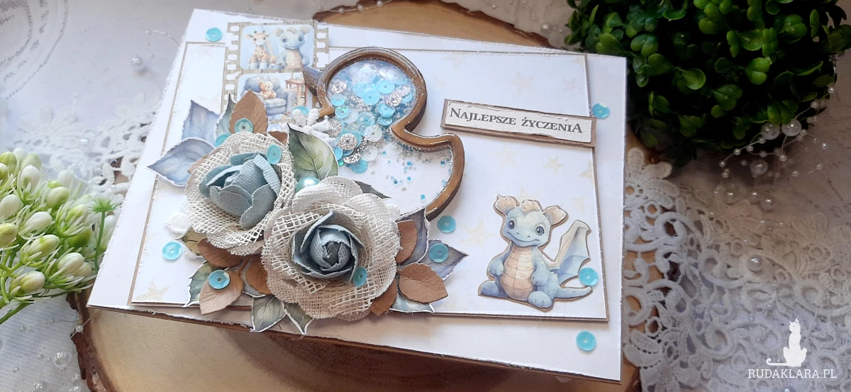 Kartka okolicznościowa dla chłopczyka na bazie kraftowej do pudełka. Na kartce znajduje się shaker i ozdobiona jest kwiatami. W środku kartka na życzenia podklejona taśmą dwustronną. Wymiary kartki 18x13 cm. W zestawie z kraftowym pudełkiem o wymiarach 18,5x13,7x3 cm.