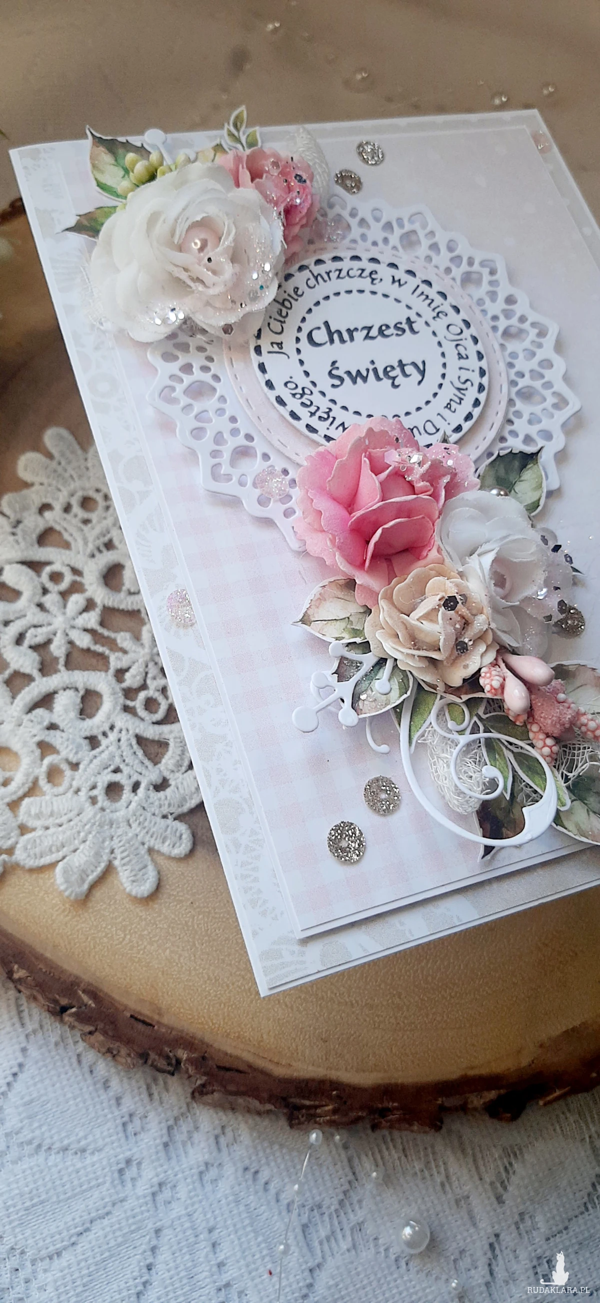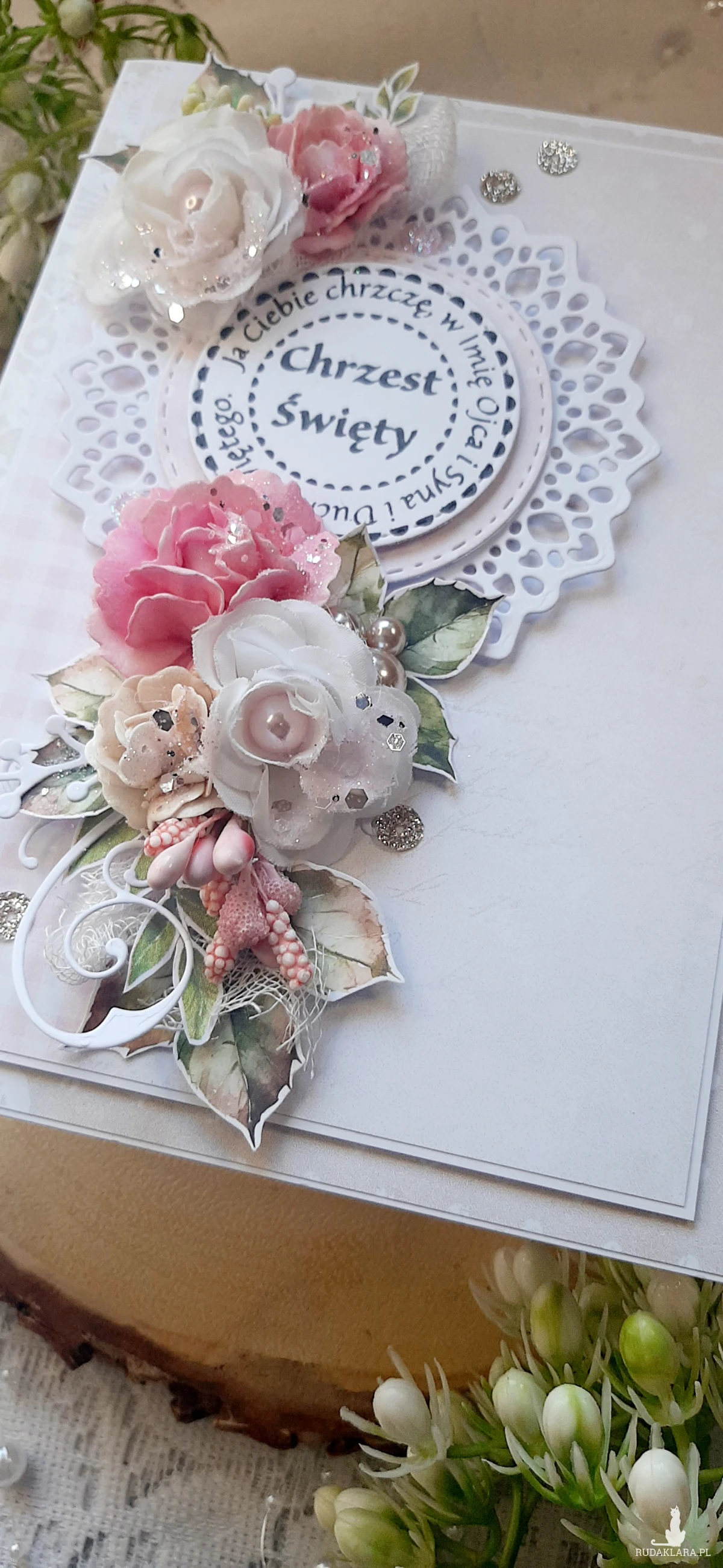 Kartka okolicznościowa do pudełka ma Chrzest Święty dla dziewczynki. Kartka jest bogato zdobiona kwiatami i innymi dodatkami. W środku kartka na życzenia podklejona taśmą dwustronną. Wymiary kartki 18x13 cm. W zestawie z pudełkiem o wymiarach 18,5x13,7x2,5 cm.