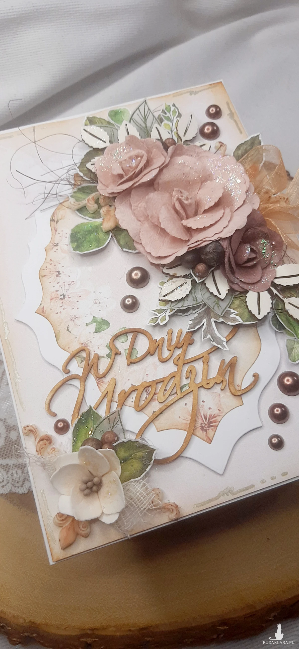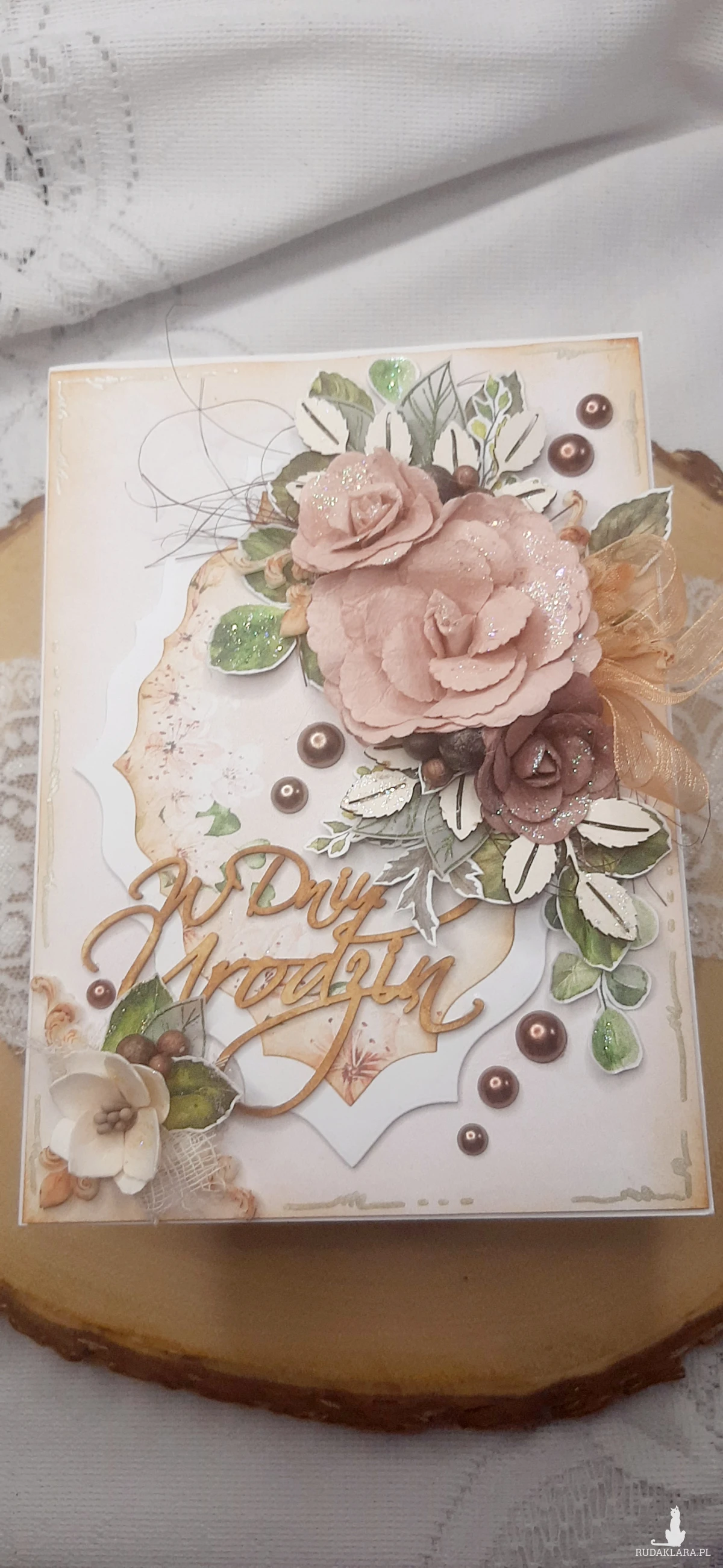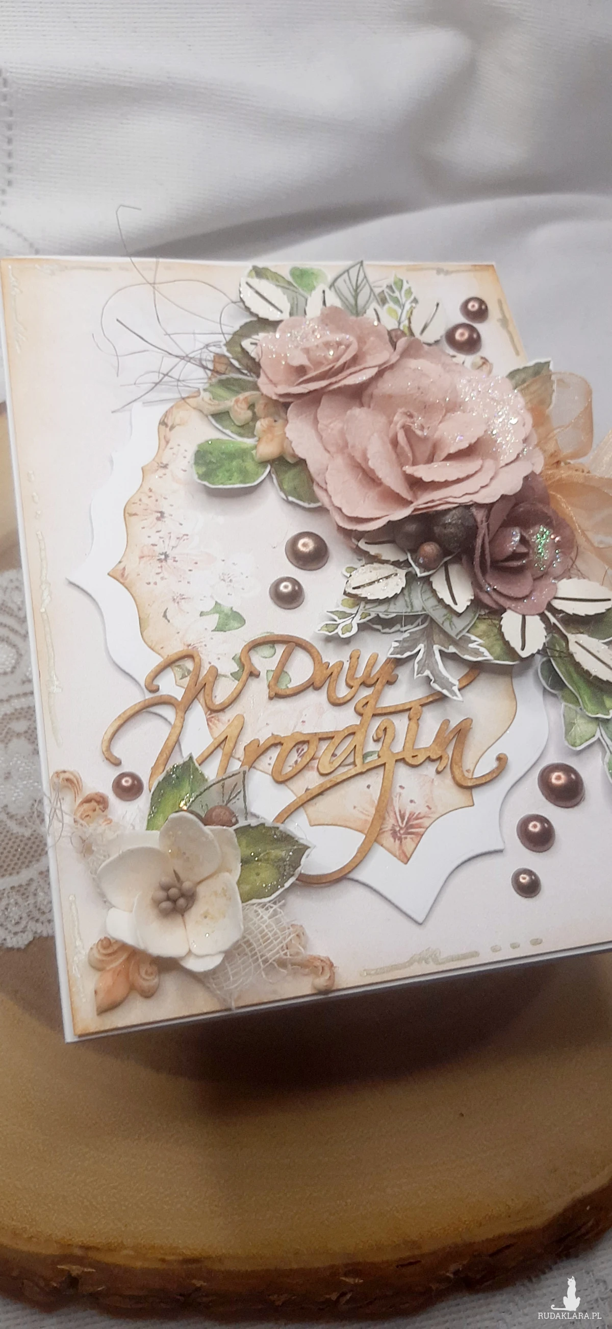 Kartka okolicznościowa do pudełka. Kartka jest bogato zdobiona kwiatami i innymi dodatkami. W środku kartka na życzenia podklejona taśmą dwustronną. Wymiary kartki 18x13 cm. W zestawie z pudełkiem o wymiarach 18,5x13,7x2 cm.