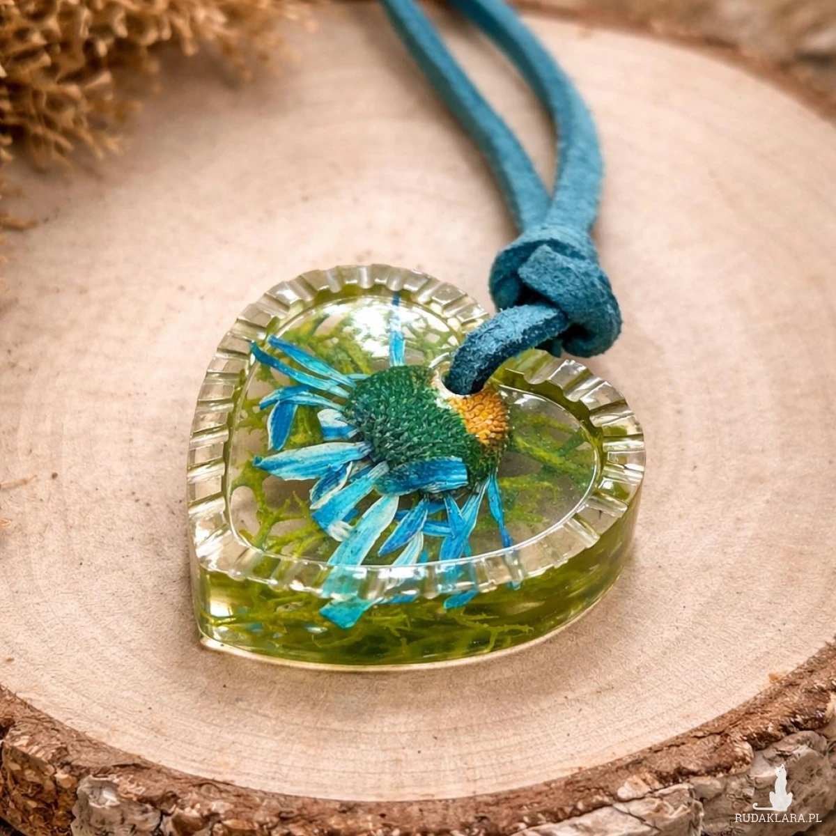 wykonany wisiorek z żywicy epoksydowej w kształcie serca, w którym