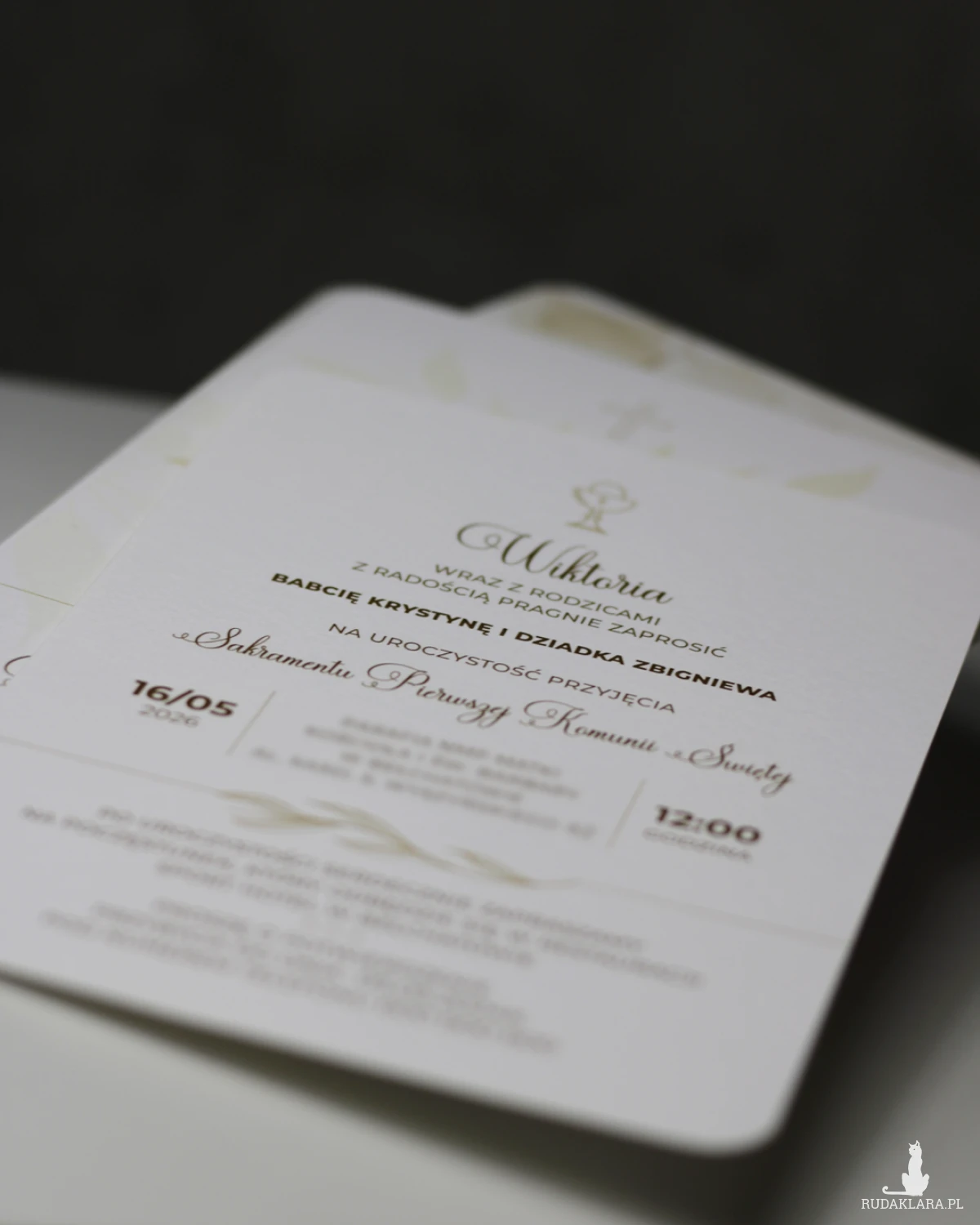 Format zaproszenia 12x17cm. Wydruk dwustronny na papierze ozdobnym o gramaturze 250g o delikatnej fakturze.
