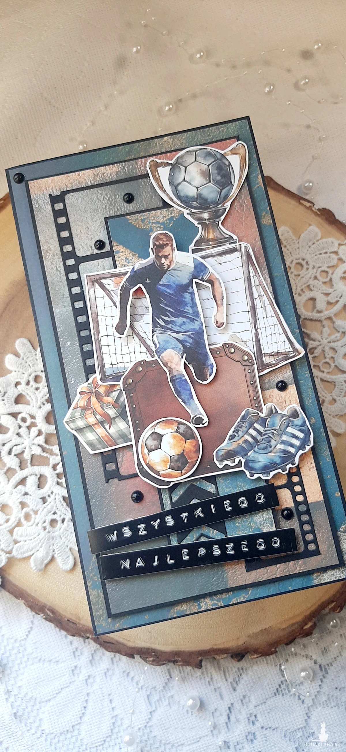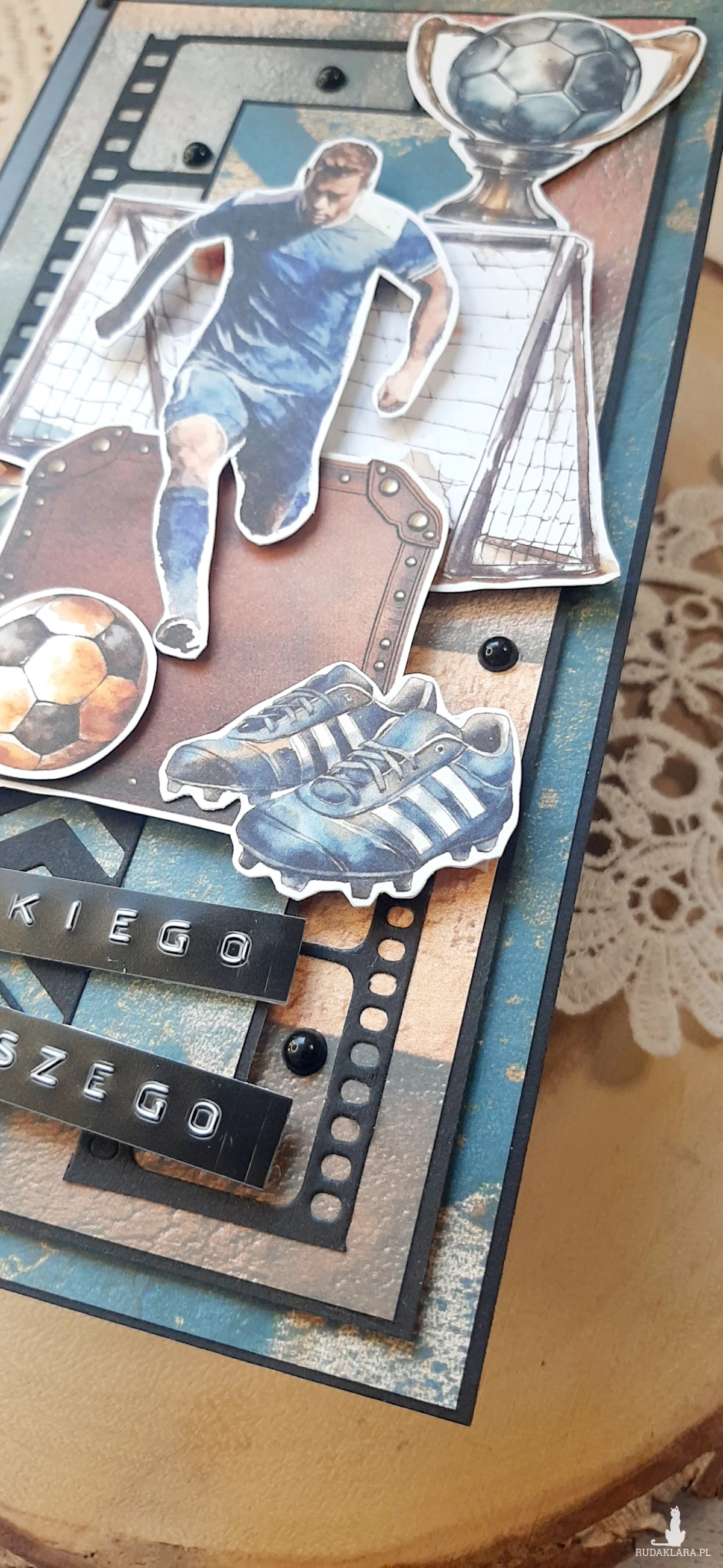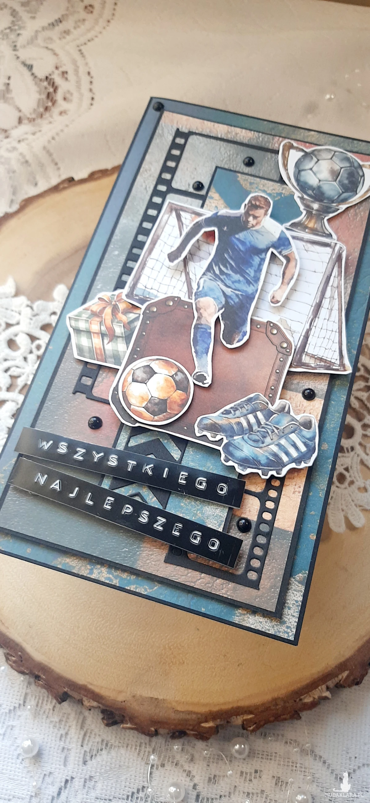 Kartka okolicznościowa do pudełka. Kartka jest bogato zdobiona różnymi "męskimi" dodatkami. W środku kartka na życzenia podklejona taśmą dwustronną. Wymiary kartki 20x11 cm. W zestawie z pudełkiem o wymiarach 20,5x11,5x2 cm.