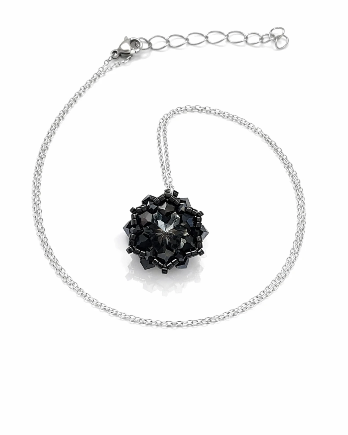 Centralnym elementem zawieszki jest kryształ Preciosa Rivoli Maxima w kolorze Night Fall – pełen głębi, z subtelnymi refleksami grafitu i srebra, które pięknie odbijają światło przy każdym ruchu.
