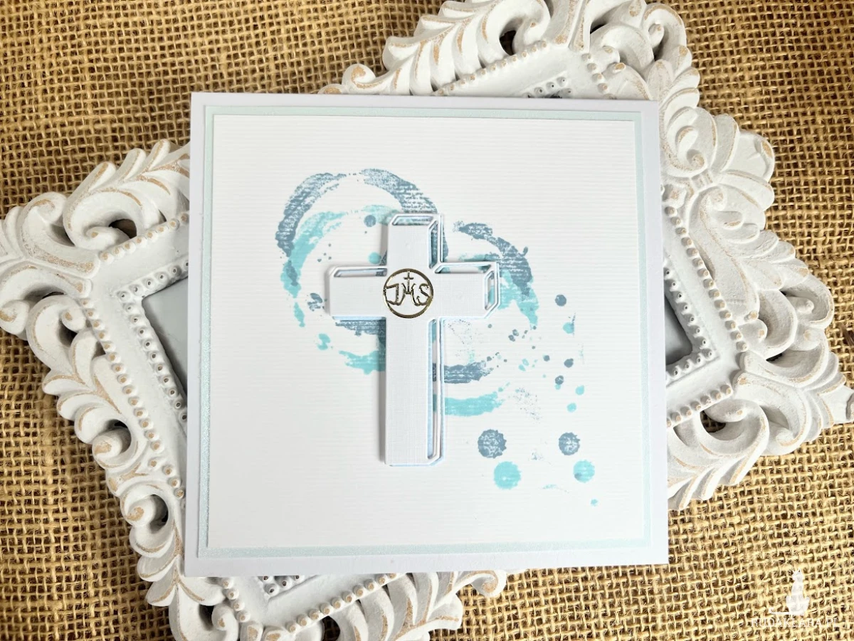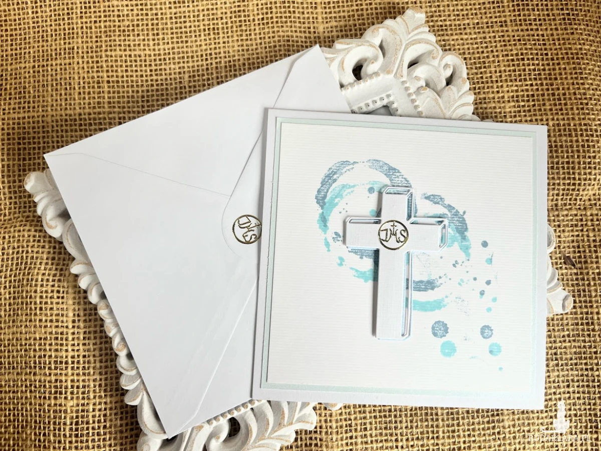 minimalistyczna, ale nietuzinkowa.Z wyjątkowymi stemplami i centralnie umieszczonym krzyżem,który podkreśla religijny charakter pamiątki.