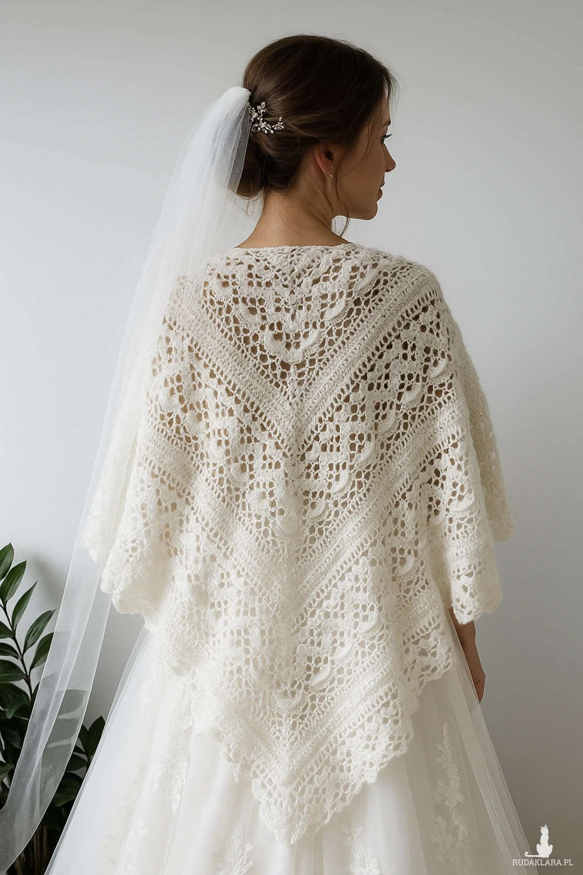 Ta chusta na ślub pasuje zarówno do klasycznych, jak i nowoczesnych stylizacji. Można założyć ją na ceremonię, przyjęcie weselne, a po ślubie nosić również na co dzień — jako elegancki szal lub chustę handmade do sukienek i płaszczy.