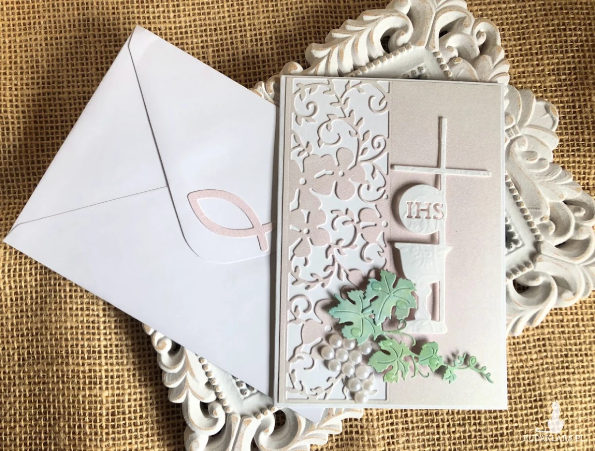 Elegancka, bogato zdobiona kartka do koperty z okazji Komunii świętej. Utrzymana w delikatnej kolorystyce -perłowej  bieli  ozdobiona kiściem winogron oraz kielichem z hostią i krzyżem.. Kartka jest w całości wykonana ręcznie z najlepszej jakości materiałów do scrapbookingu. Wielkość koperty 16x11,5cm .Wielkość kartki 14,8x10,5 z gotowymi życzeniami do własnoręcznego podpisu . W tej postaci produkt dostępny od ręki .Polecam
