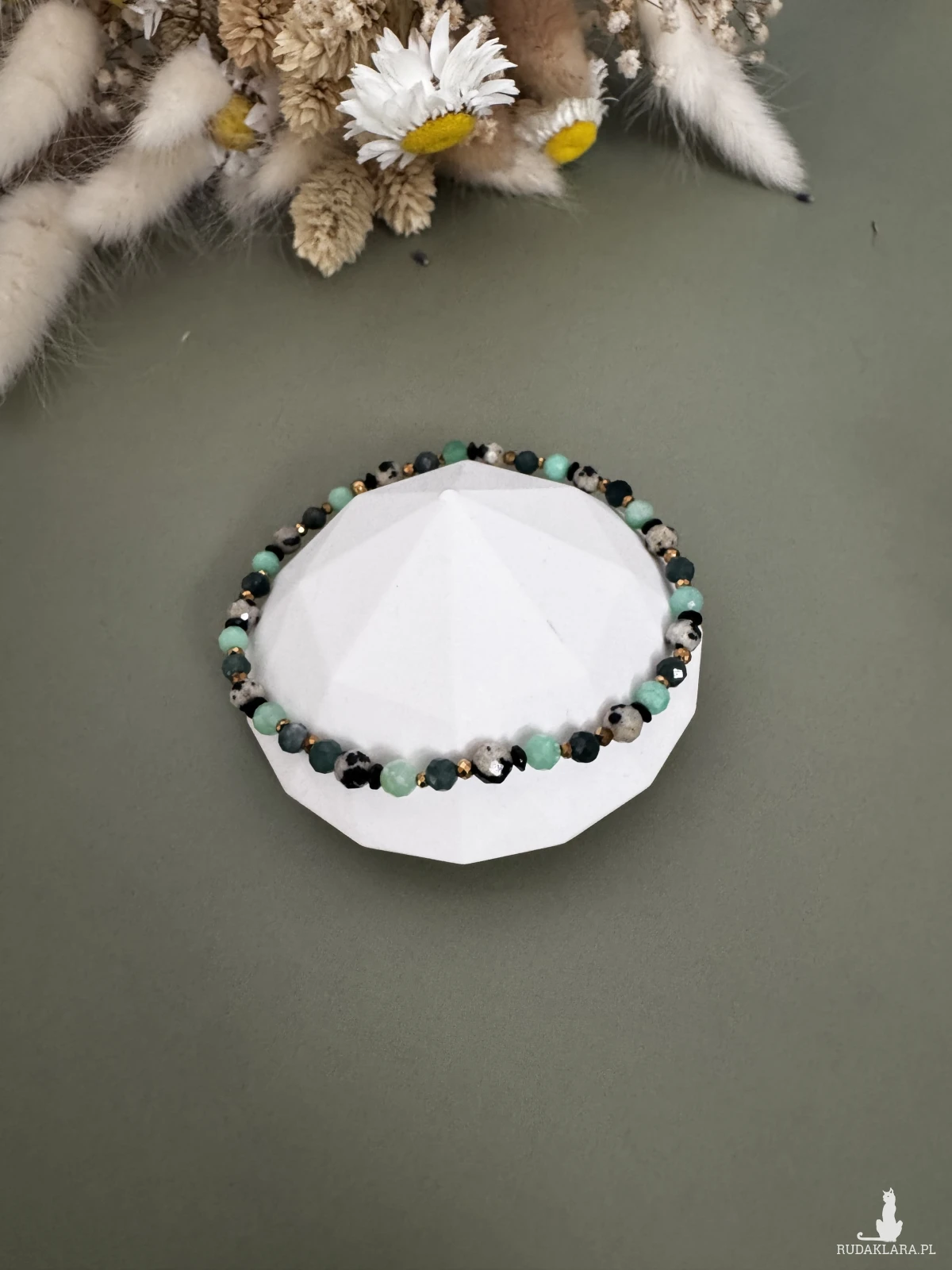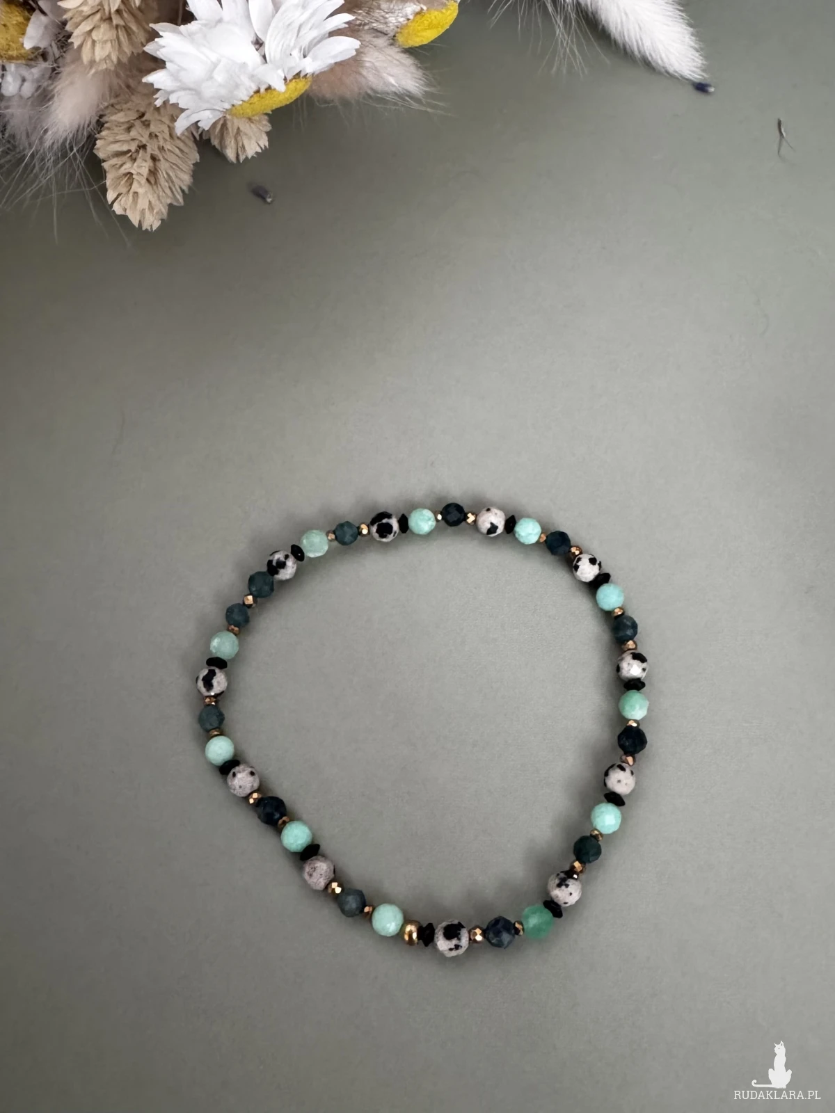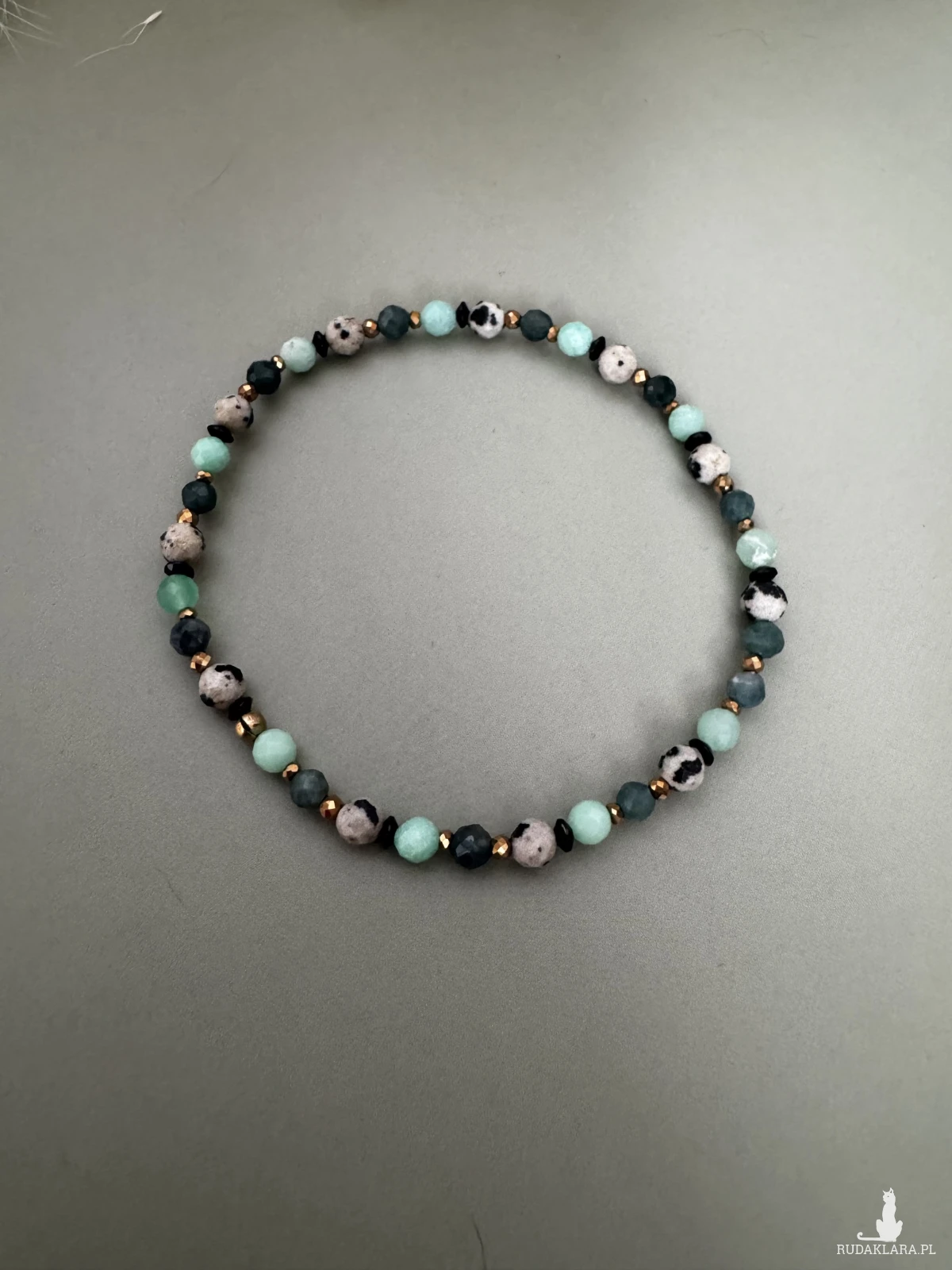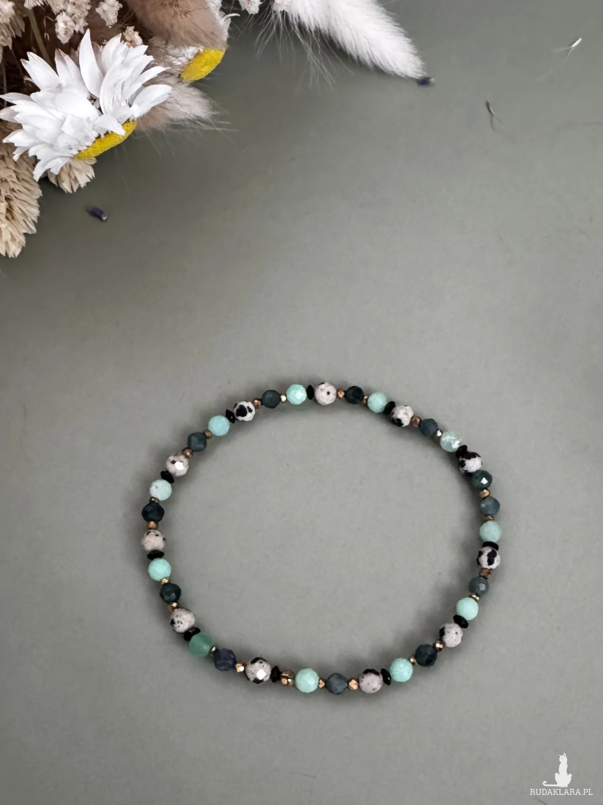 Bransoletka przyciągająca bogactwo, poprawiająca nastrój i samopoczucie. Bransoletka jest zrobiona z małych, 4-milimetrowych kamyczków turmalinu niebieskiego, jaspisu dalmatyńskiego, chryzoprazu oraz onyksu.