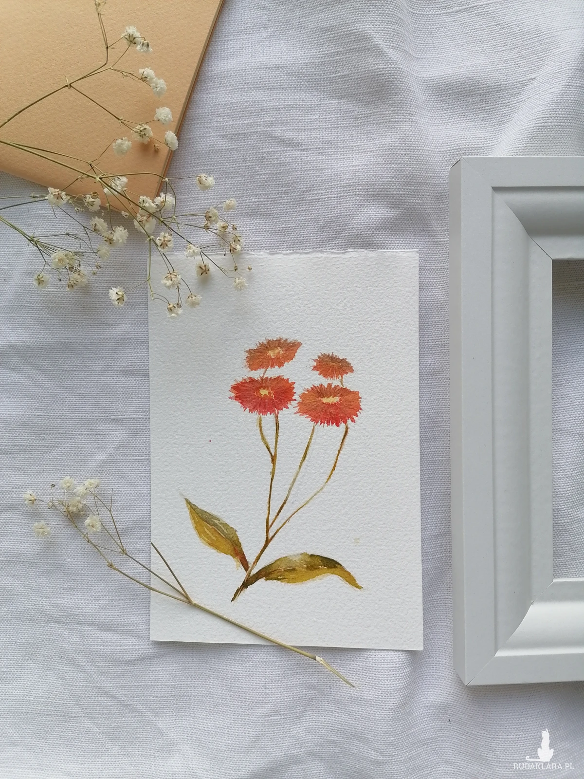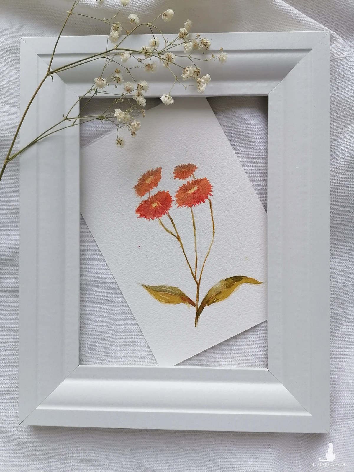 Akwarela ta przywodzi mi na myśl gorący, letni wieczór, kiedy barwy wokół są już spokojniejsze, lekko przytłumione ale wciąż ciepłe i intensywne. Jest to obraz oryginalny, nie reprodukcja. Namalowałam go akwarelami na polskim papierze bawełnianym o jakości archiwalnej, a szczegóły dopracowałam kredkami artystycznymi. Zastosowane przeze mnie materiały charakteryzują się wysoką odpornością na światło.