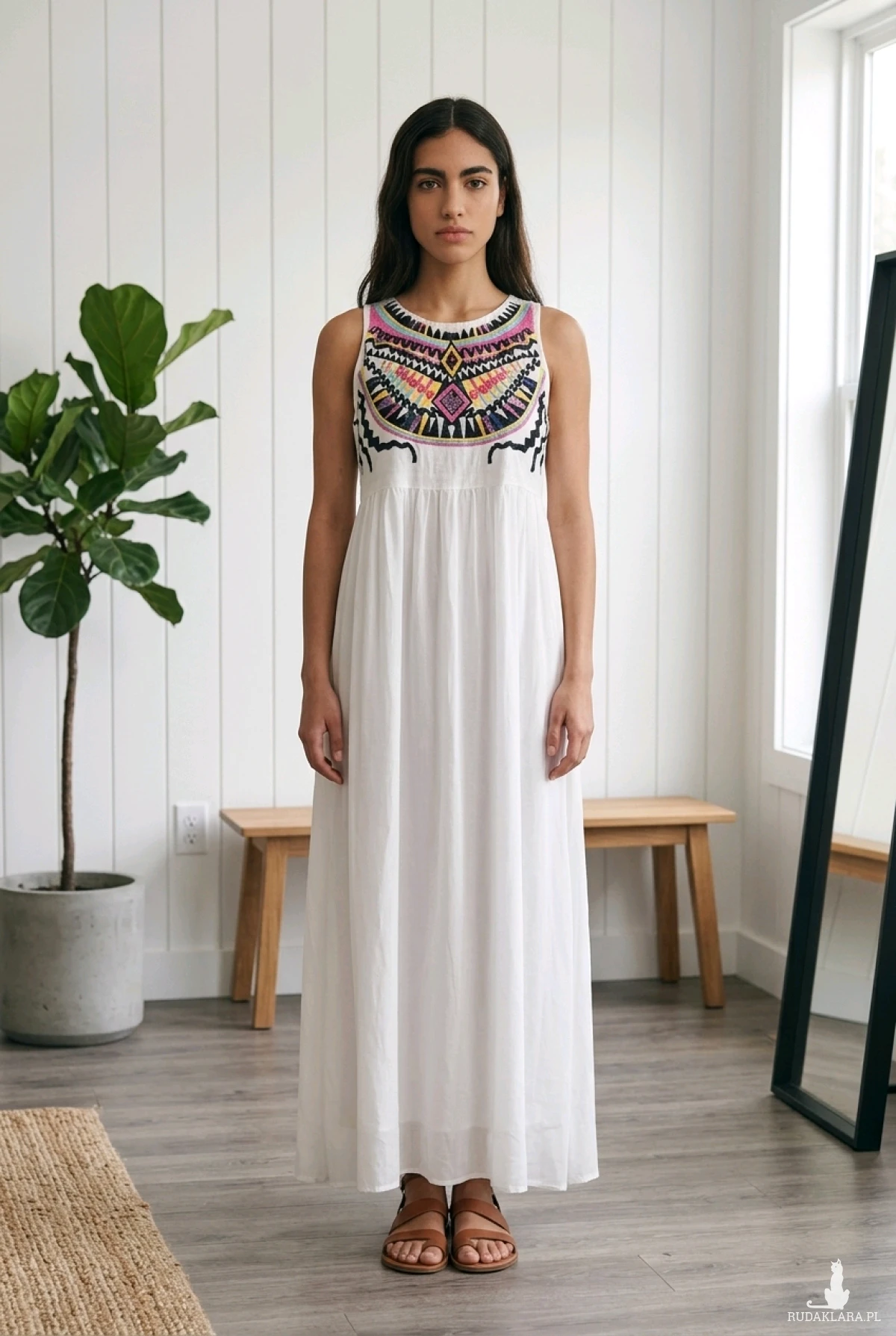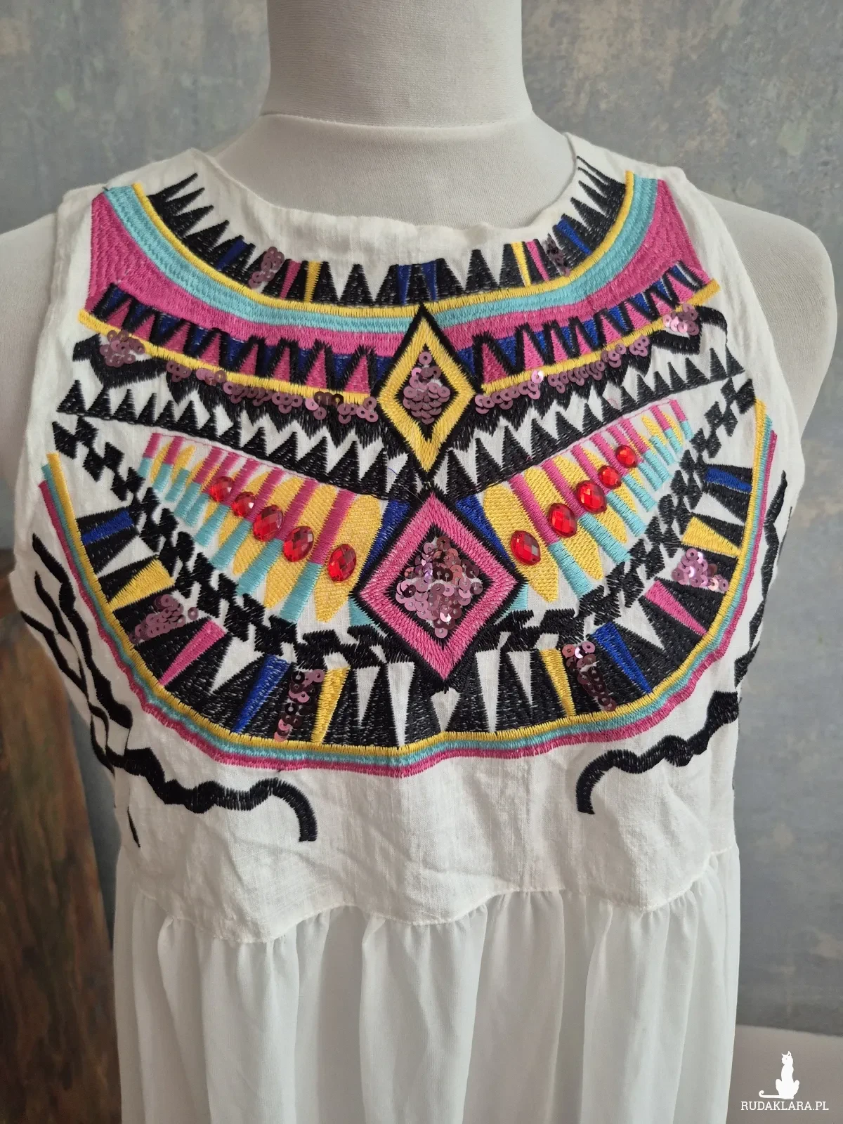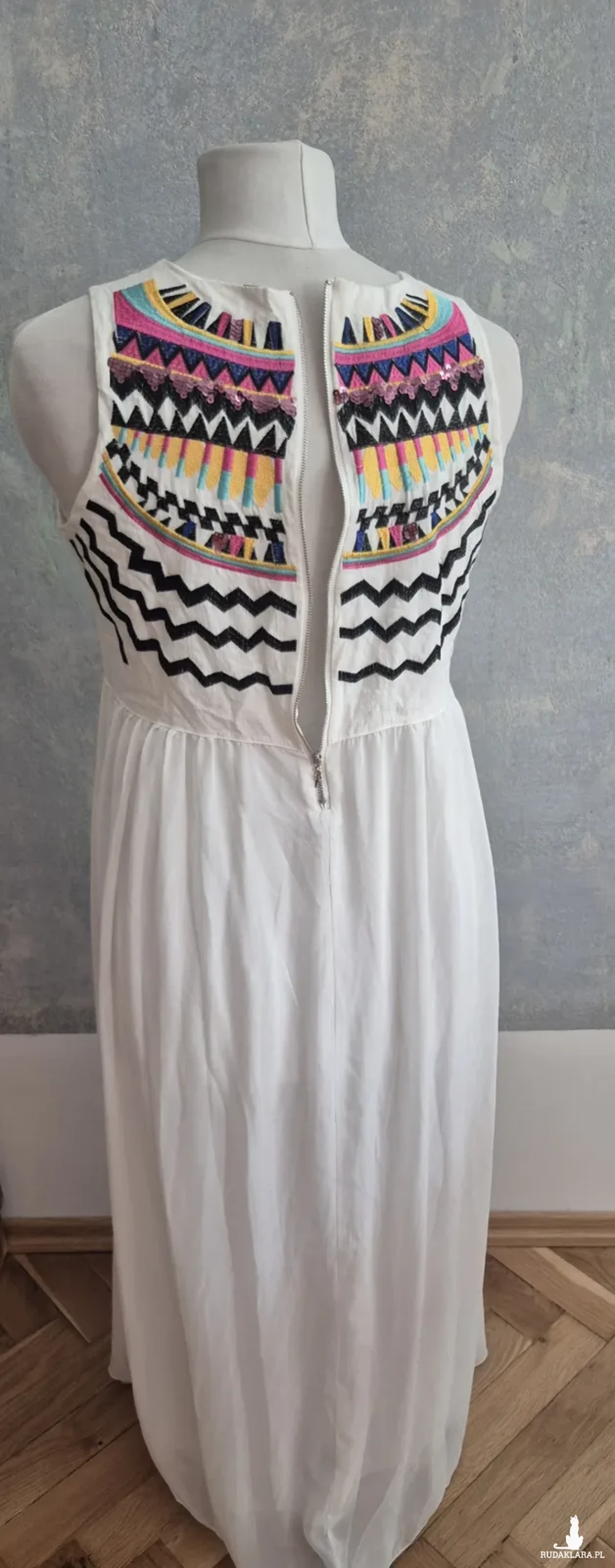 Biała lejąca się Długa piękna haftowana sukienka na podszewce rozmiar 38 osoba na zdjęciu ma 1,60 m wzrostu sukienka w stanie cudownym z tyłu zapinana na zamek