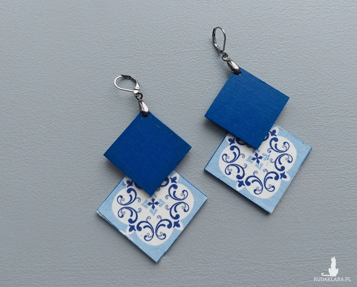 Błękitna kolekcja ręcznie wykonanych kolczyków inspirowana marokańskimi płytkami. Geometryczna forma kolczyków jest bardzo modna i przyciągnie wzrok. Zestawienie kolorów: błękit, niebieski, granat i biel skomponują się nie tylko z dżinsami i t-shirtem, ale i eleganckimi sukniami i letnimi sukienkami.