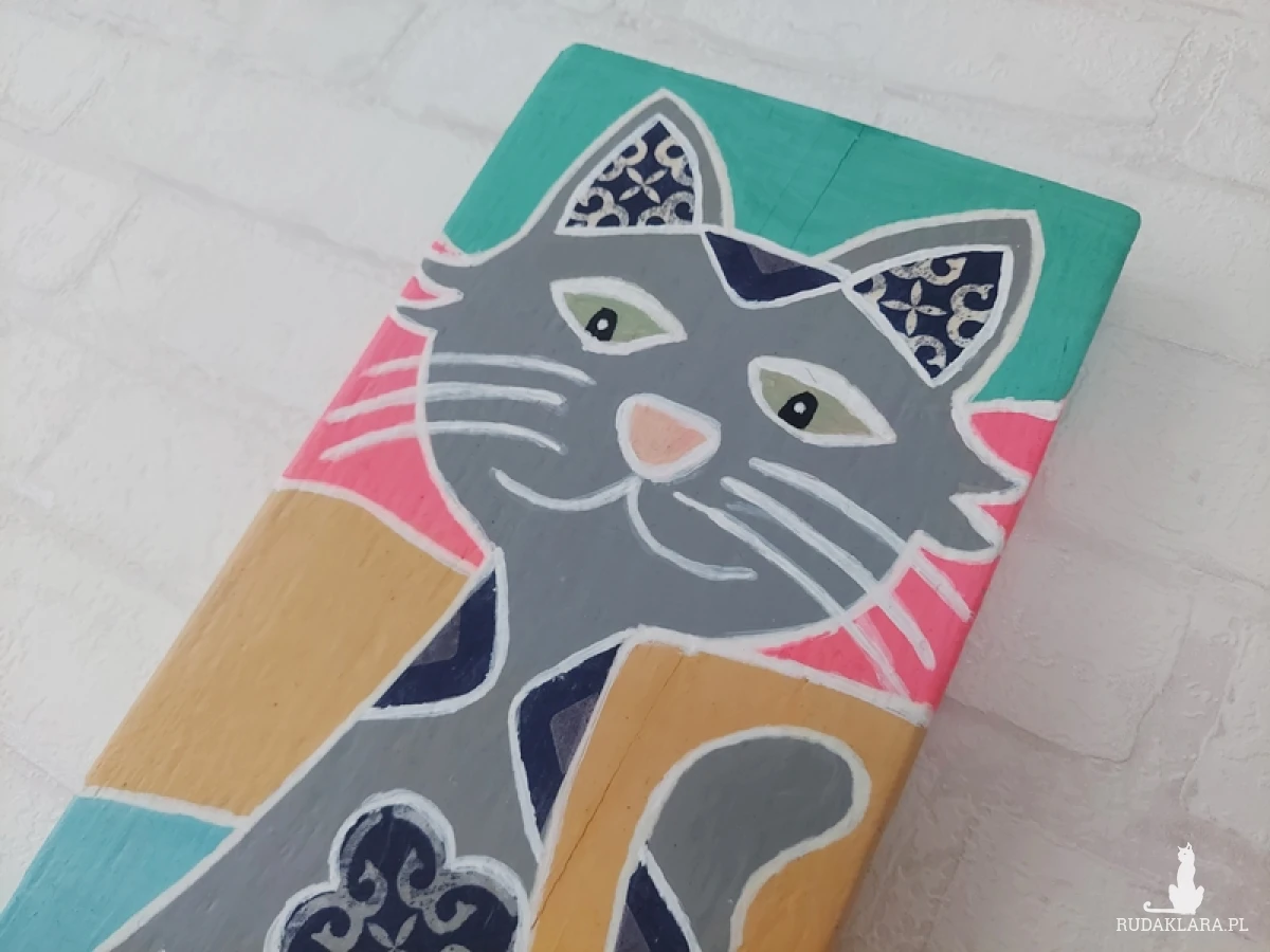 wykonany na lekko oszlifowanej desce, a wizerunek kota został ozdobiony w