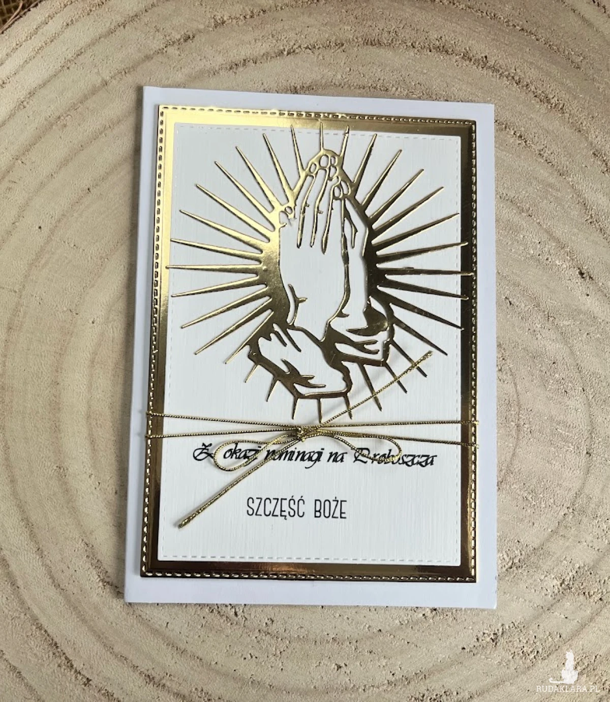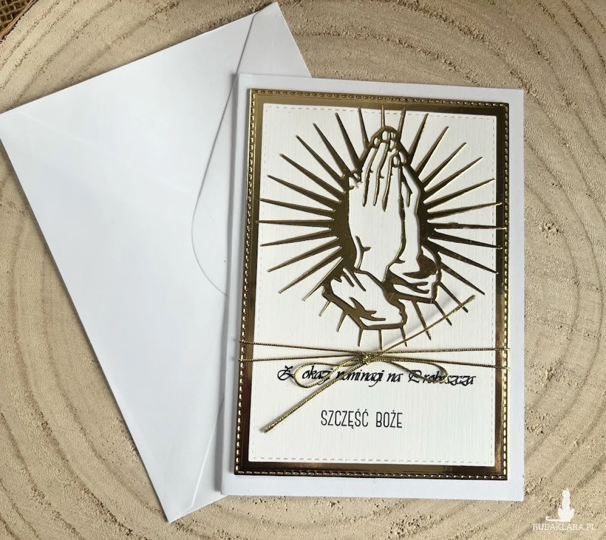 Kartka z okazji nominacji na Proboszcza. Wykonana ręcznie z największą starannością i ozdobiona wymowną symboliką. Stworzona w kolorystyce złoto- białej z cytatem.Wnętrze kartki skrywa miejsce na wypisanie własnych życzeń. Wielkość kartki 10,5 x 15,0cm w komplecie z białą kopertą. W tej postaci kartka dostępna od ręki.Zapraszam