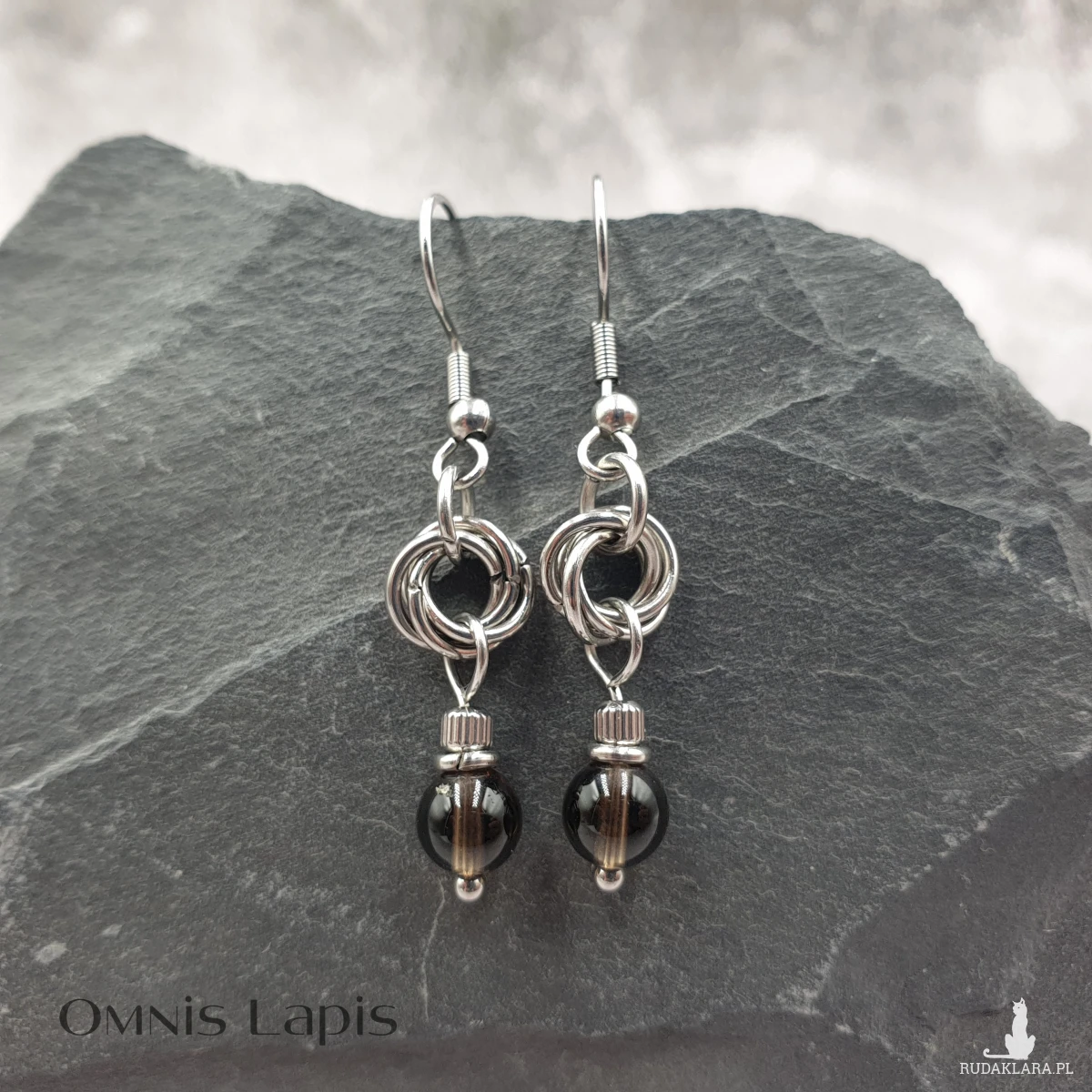 Kolczyki wykonane w stylu chainmaille, polegającym na łączeniu ze sobą ogniwek w taki sposób, aby tworzyły kreślony splot. Kolczyki ozdobione kulami kwarcu dymnego.