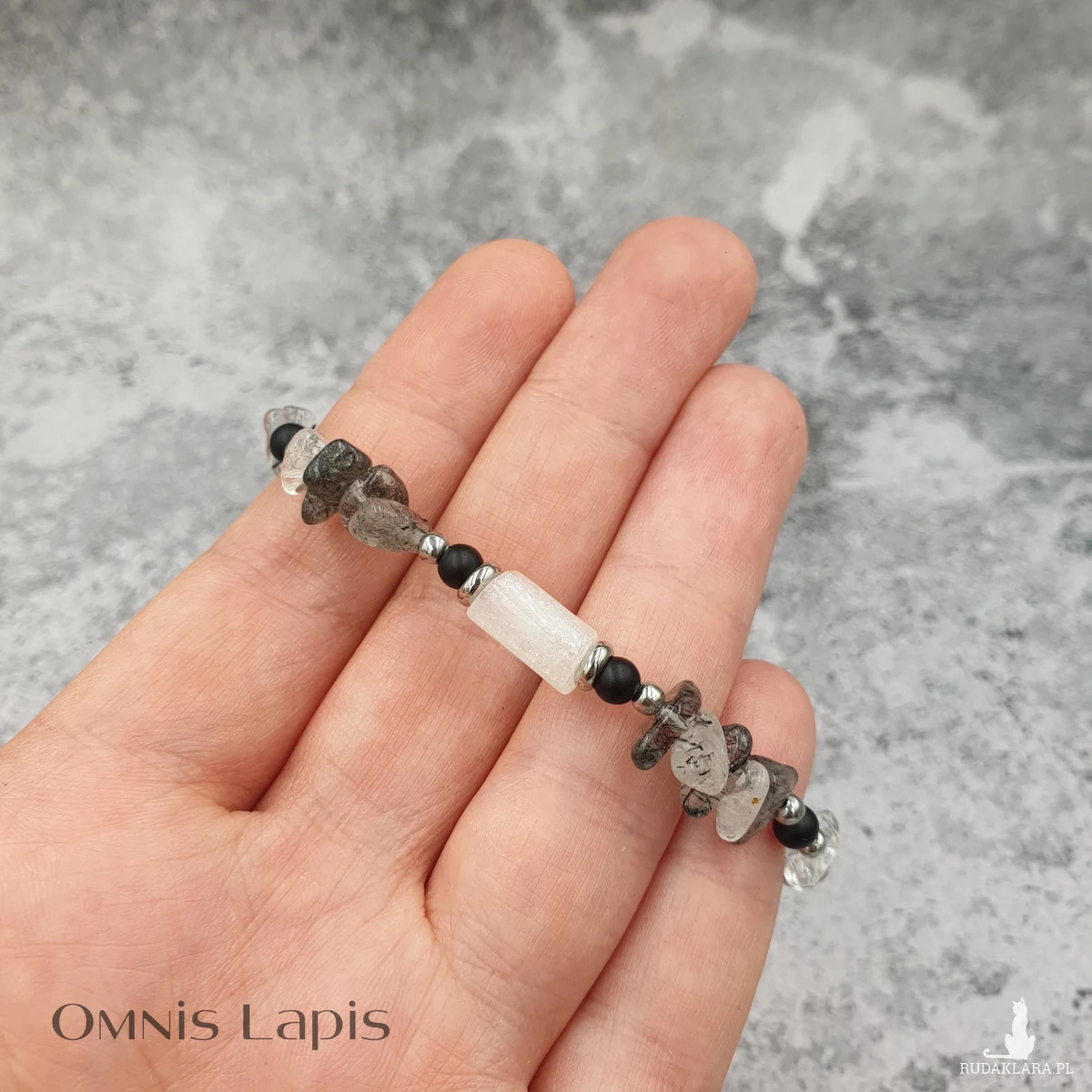 Bransoletka w kolorze czerni i bieli. Wykonana z nieregularnych koralików kwarcu z turmalinem. Centrum bransoletki stanowi wałek z białego cytrynu, przedzielony stalowymi oponkami i kulkami matowego onyksu.
