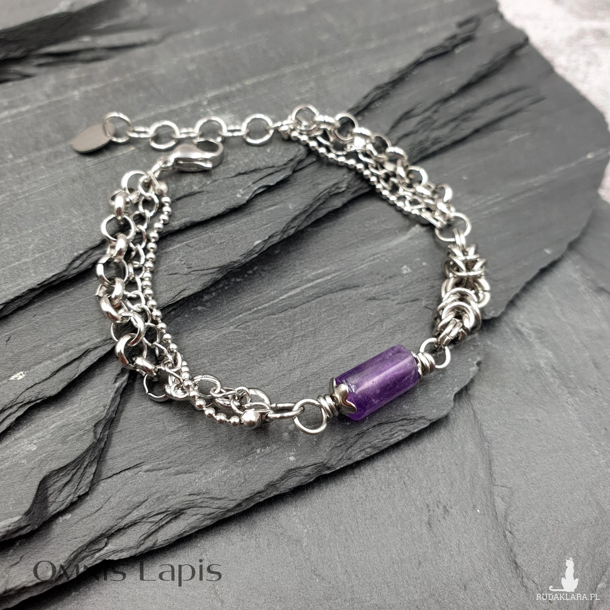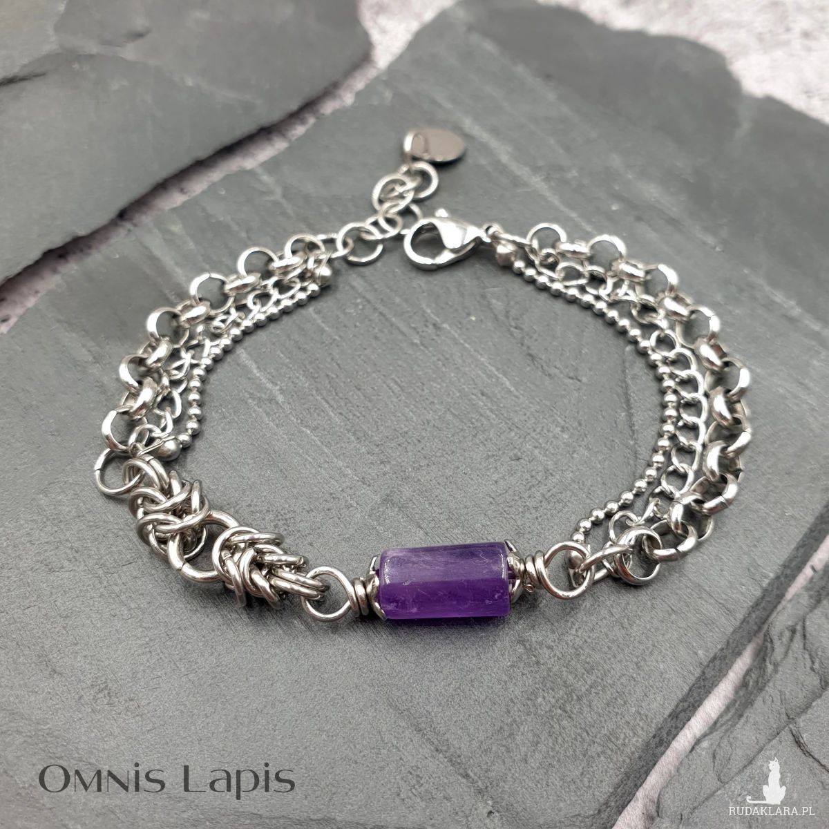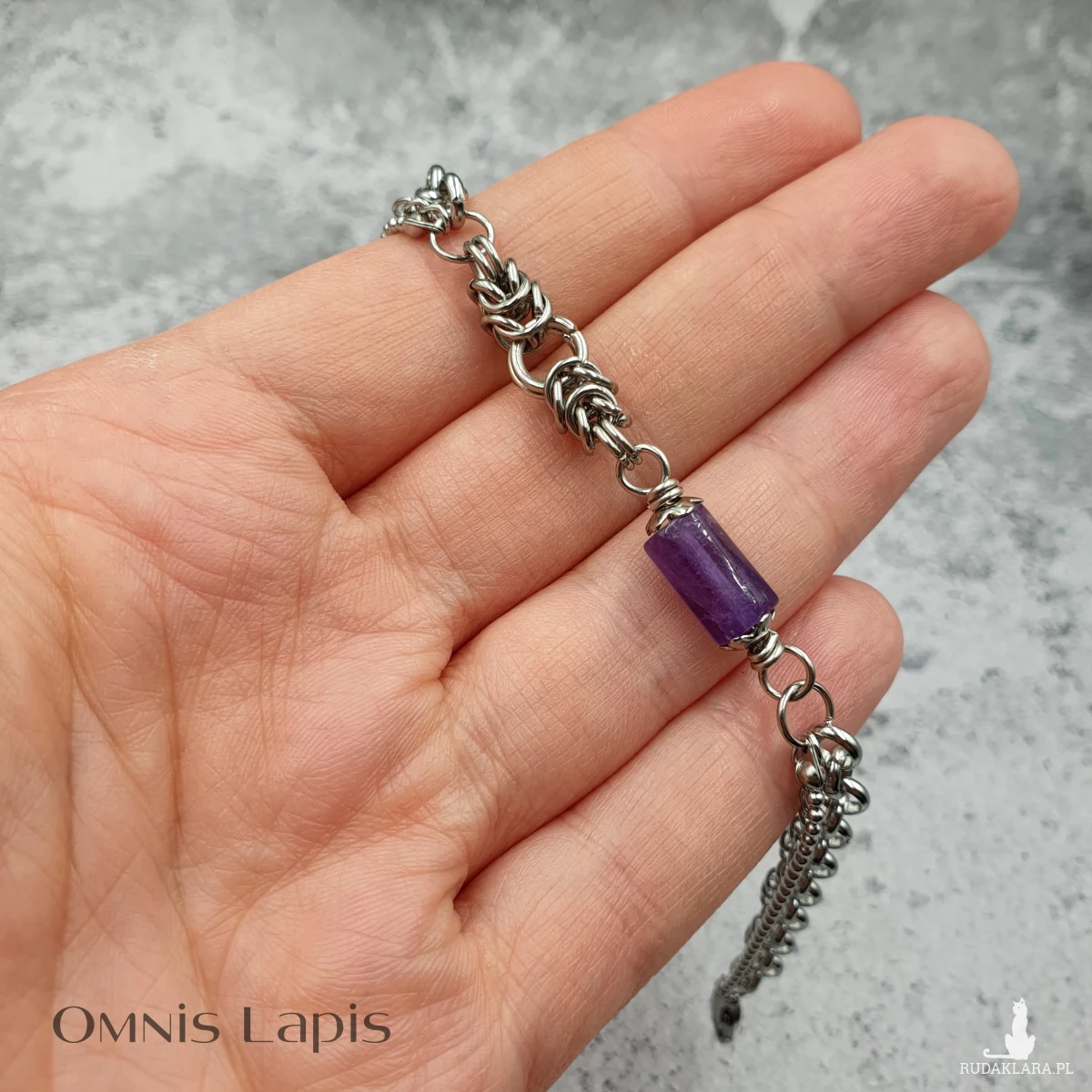 Elegancka bransoletka z kamieniem. Bransoletkę wykonałam ze stali w technice chainmaille: dawnej sztuce tworzenia łańcuchów. Ozdobiłam wałeczkiem ametystu. Zapięcie zakończone stalową monetką.