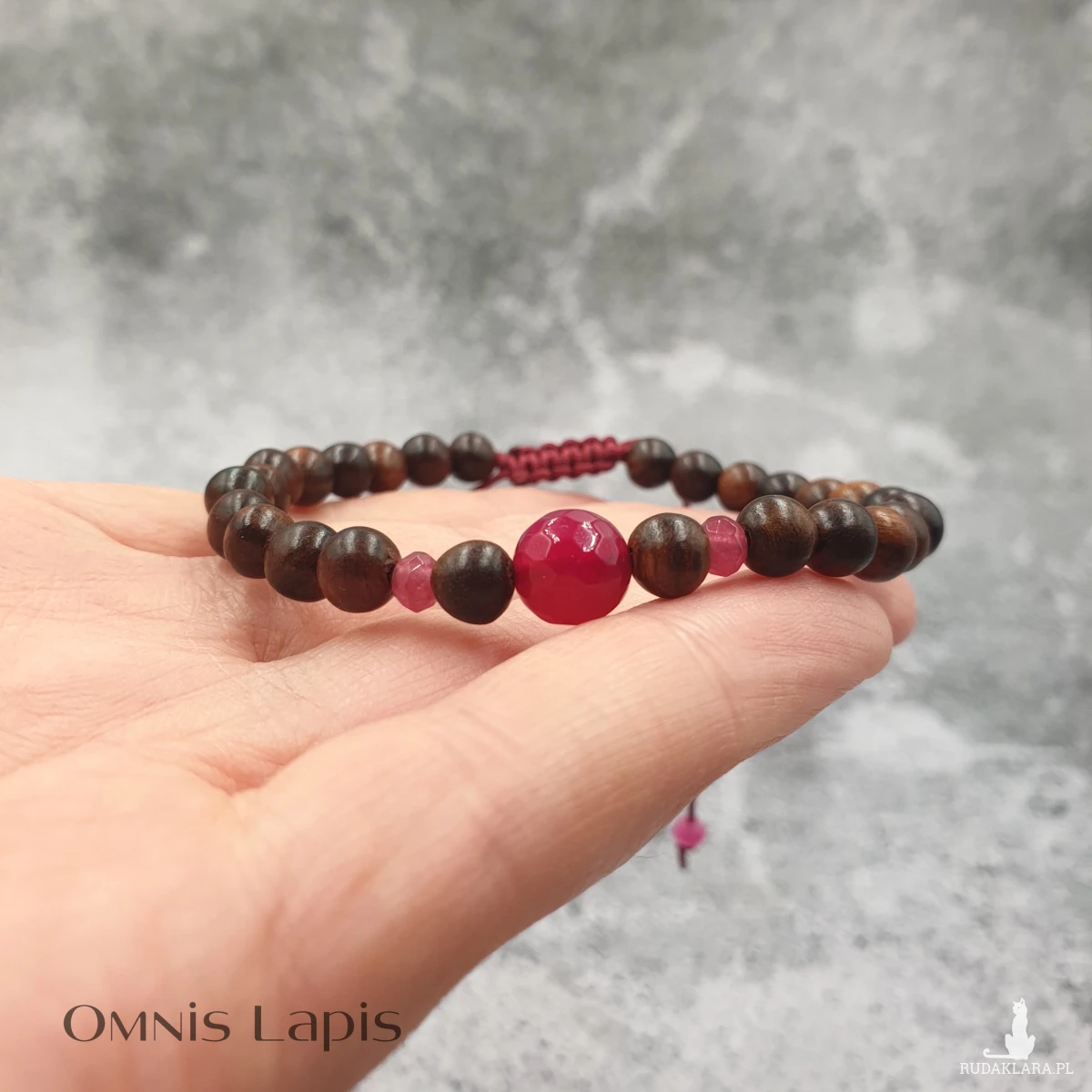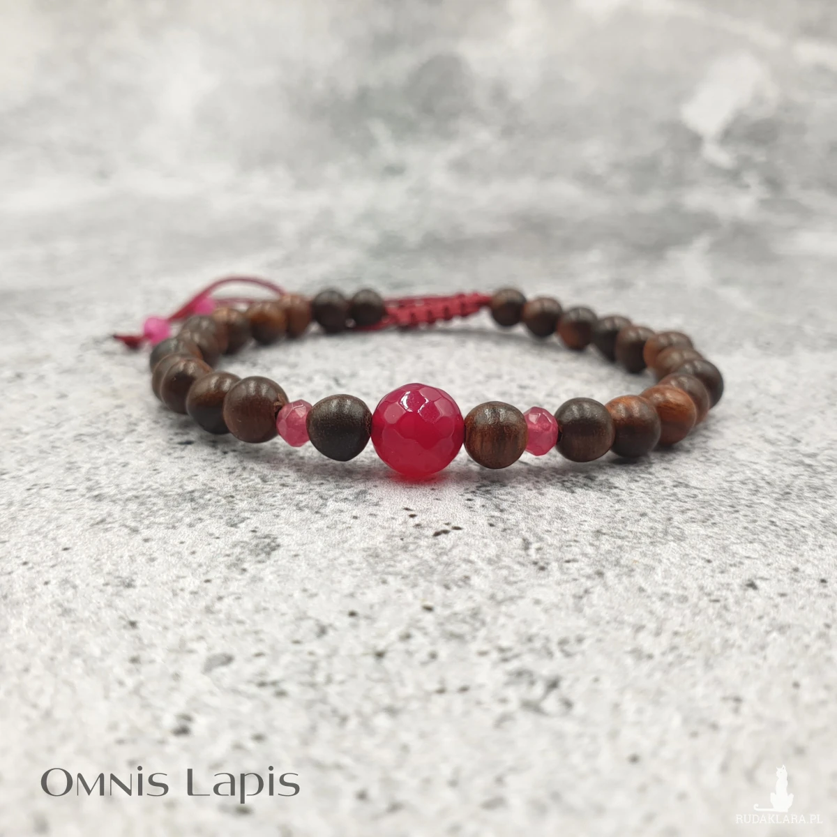 Wykonana z kul naturalnego drewna egzotycznego oraz oponek i kuli jadeitu fuksja.