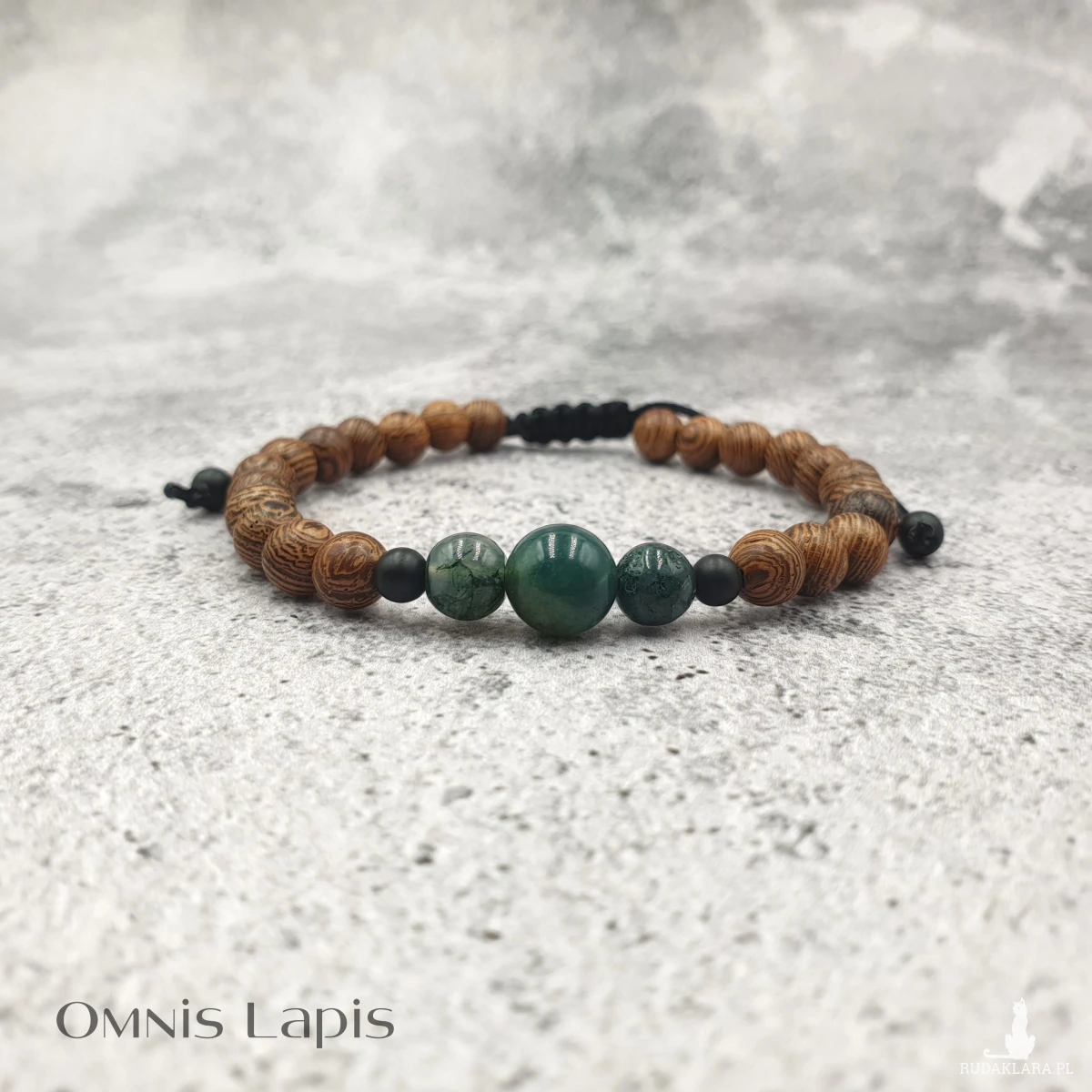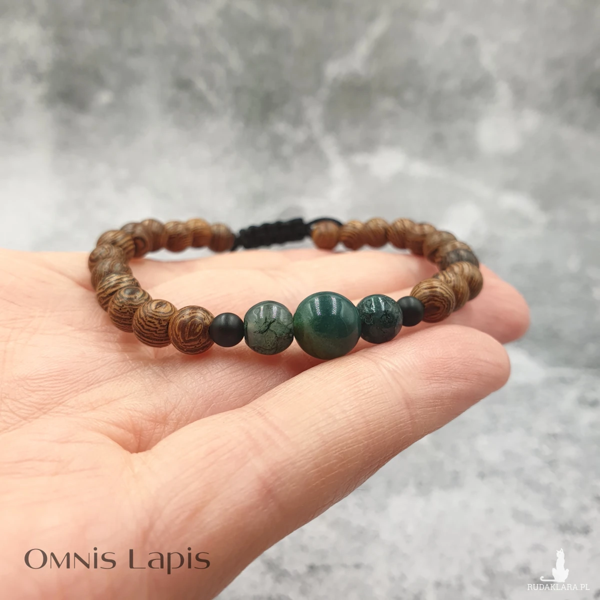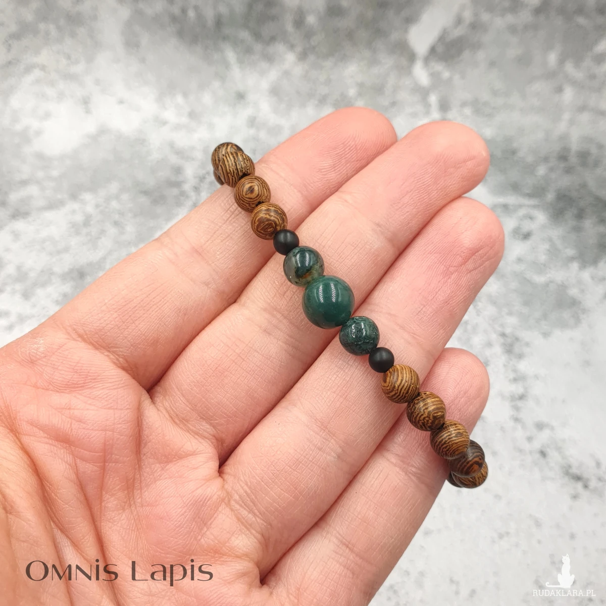 Wykonana z kul naturalnego drewna egzotycznego oraz kul onyksu i agatu mszystego.