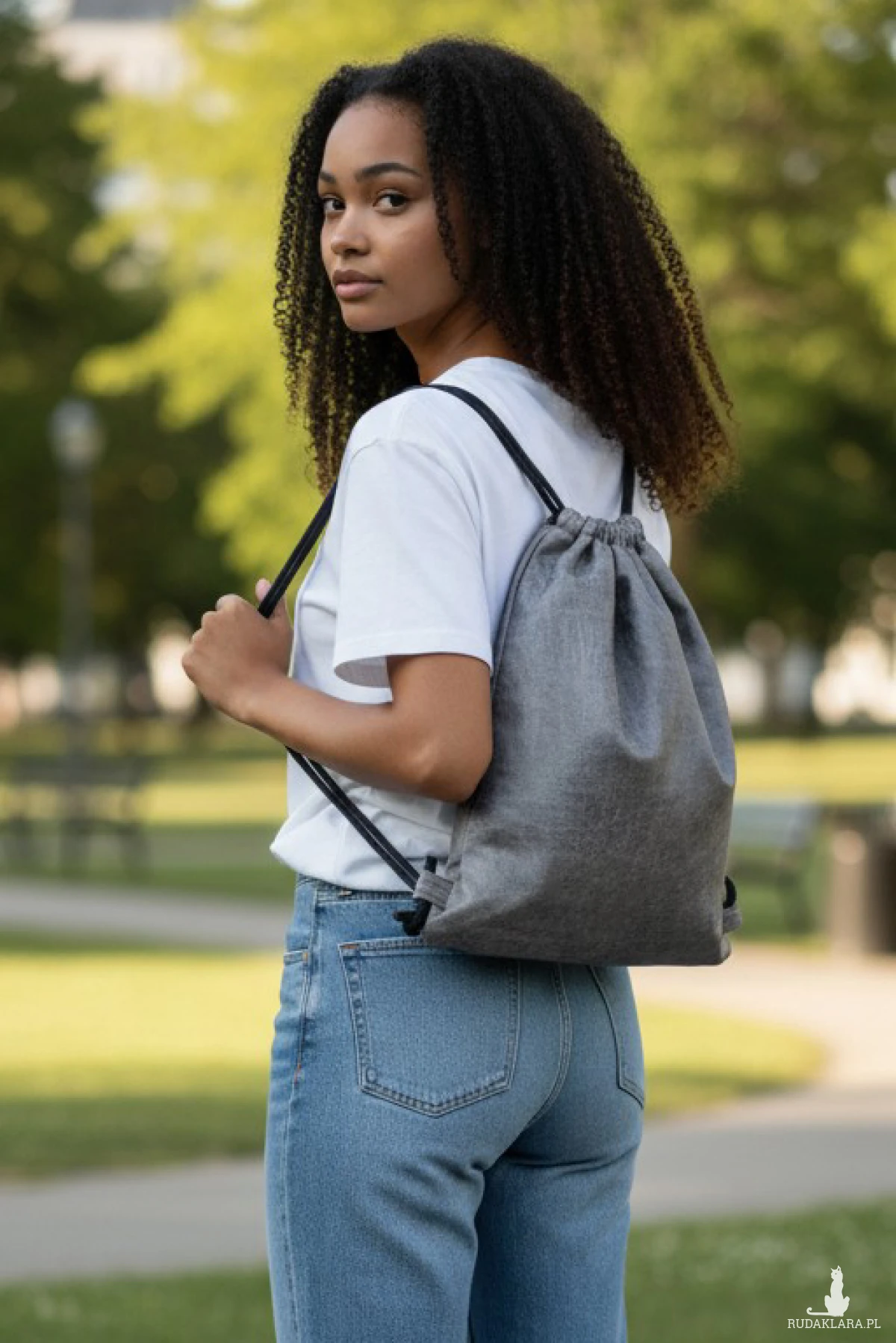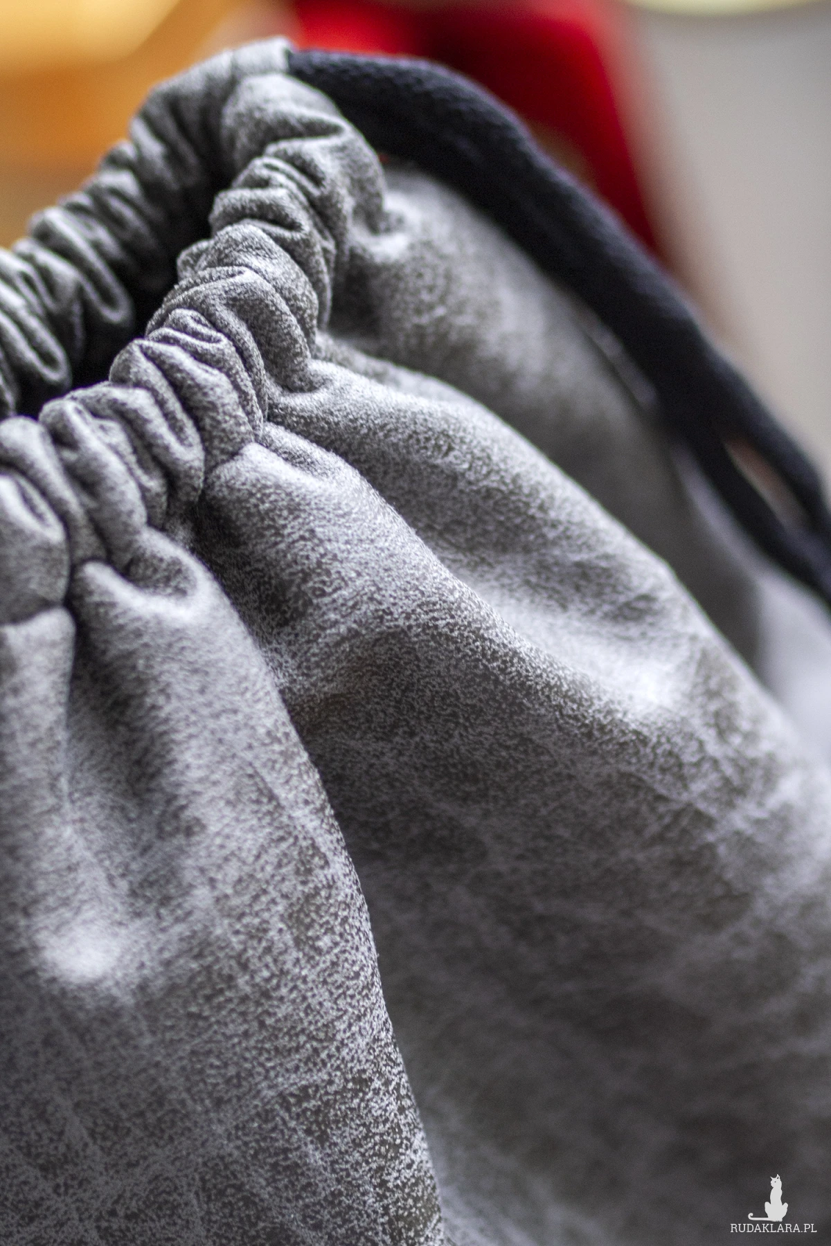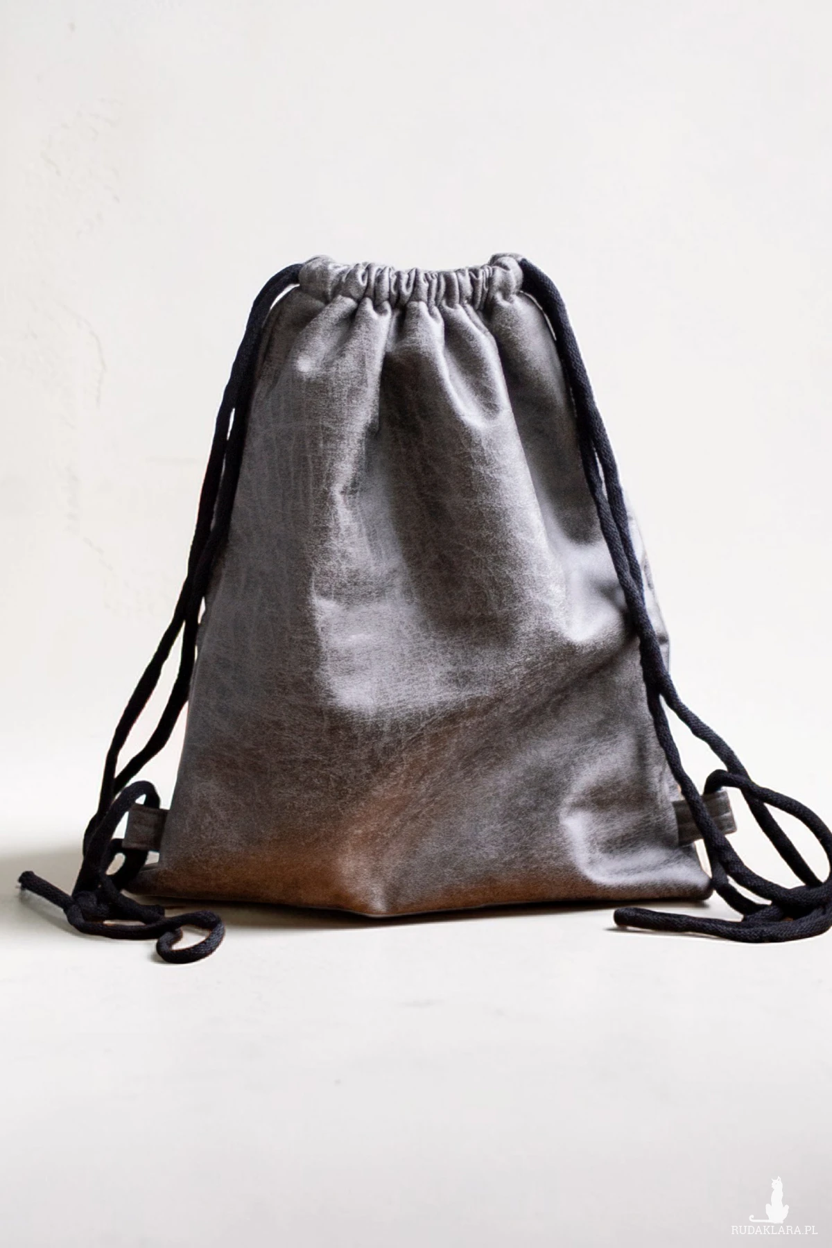 Plecak worek wykonany z ciemnoszarej tkaniny imitującej ekoskórę.