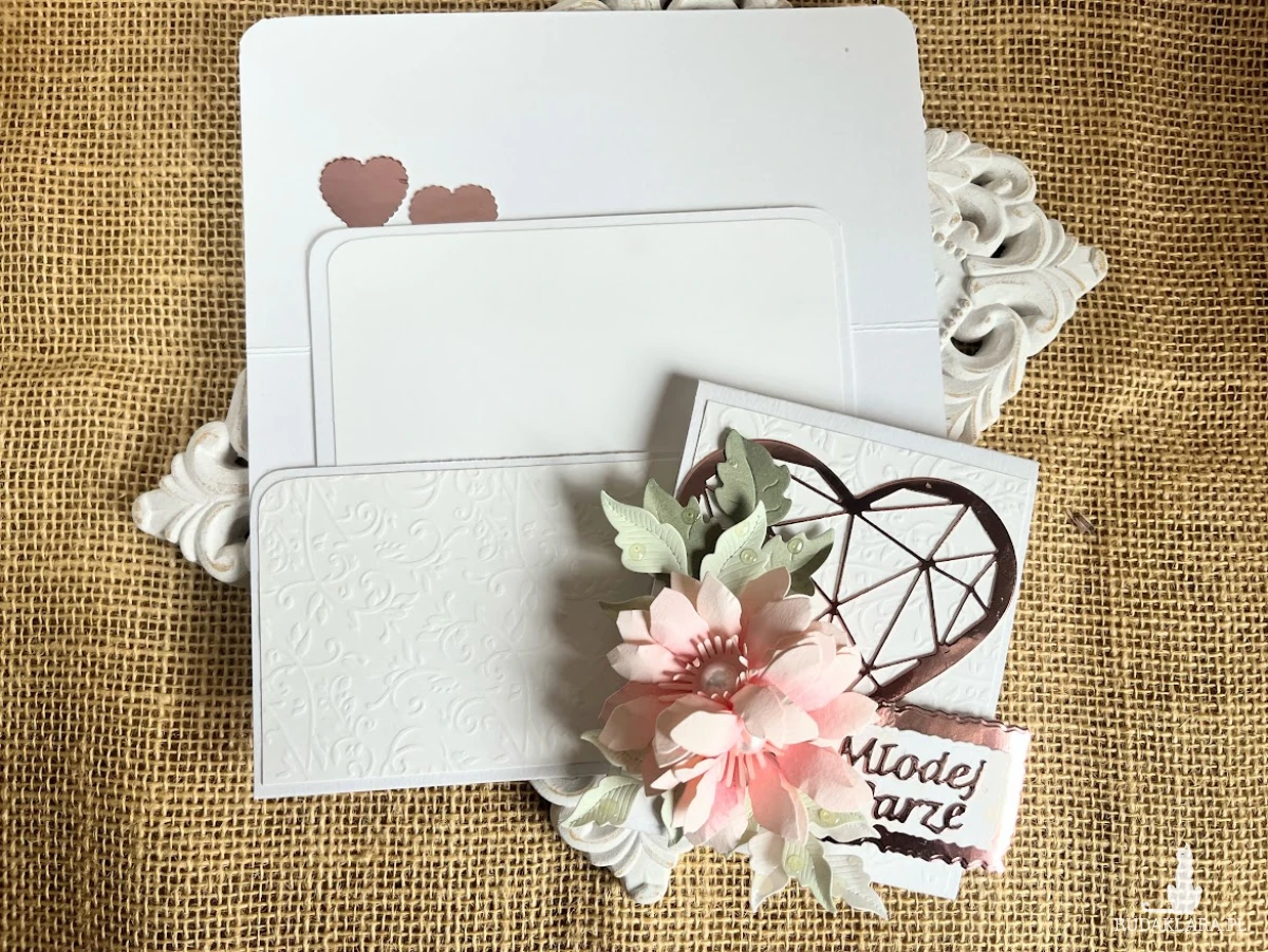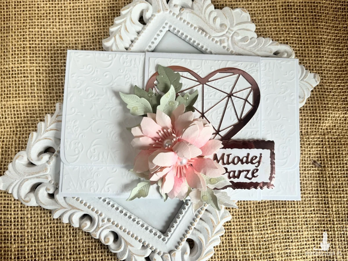 Elegancka kartka ślubna w formie kopertówki.W kolorystyce cynkowej bieli z dodatkiem lustrzanego różowego złota, Wykonana w całości ręcznie, dbałością o szczegóły. Ozdobiona za pomocą perłowego tłoczonego papieru do scrapbookingu, pięknej kompozycji kwiatowej oraz geometrycznego serca i napisu .Wielkość kartki to 18 x 10,5 .Dzięki swojej formie, kartka ta pozwala w elegancki sposób przekazać zarówno życzenia, jak i prezent w postaci gotówki. W środku znajduje się ozdobna wkładka na życzenia. W tej postaci kartka dostępna od ręki.Polecam