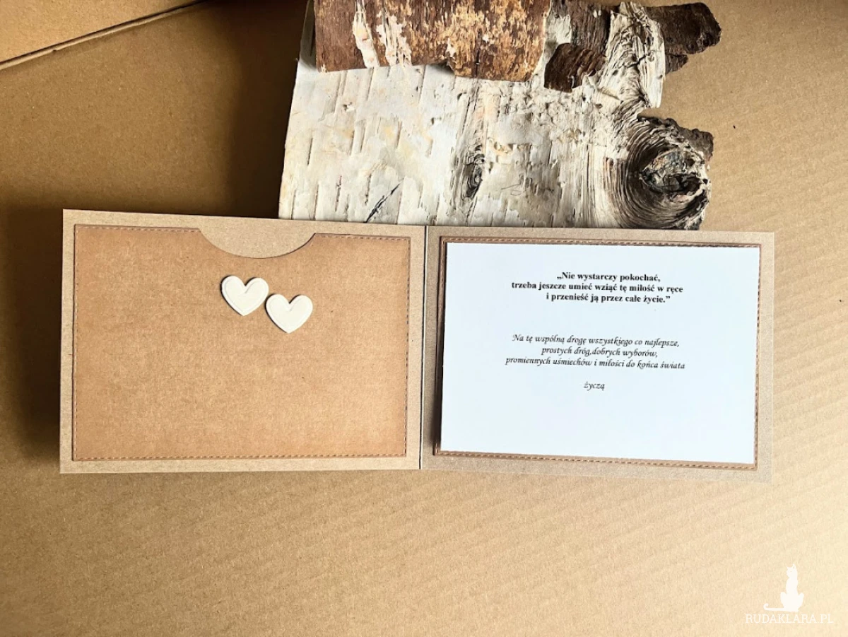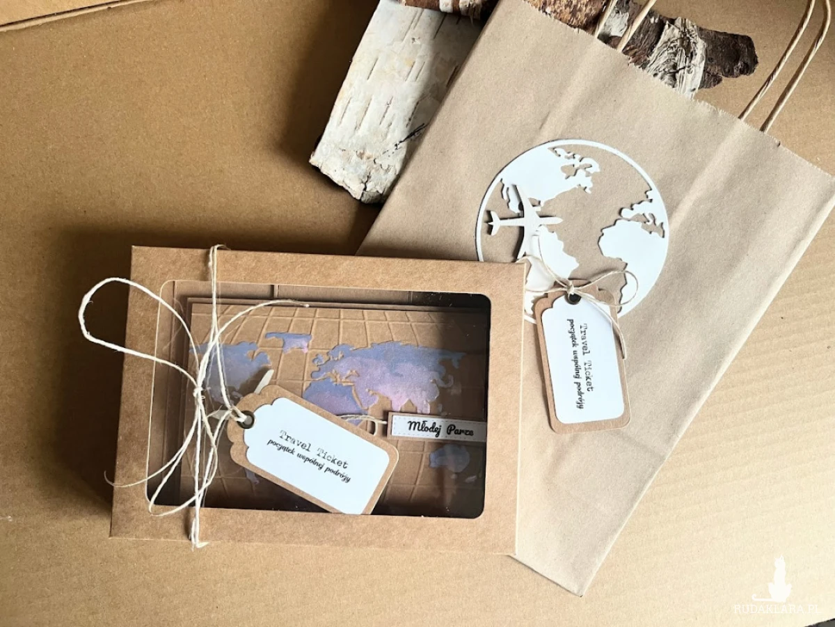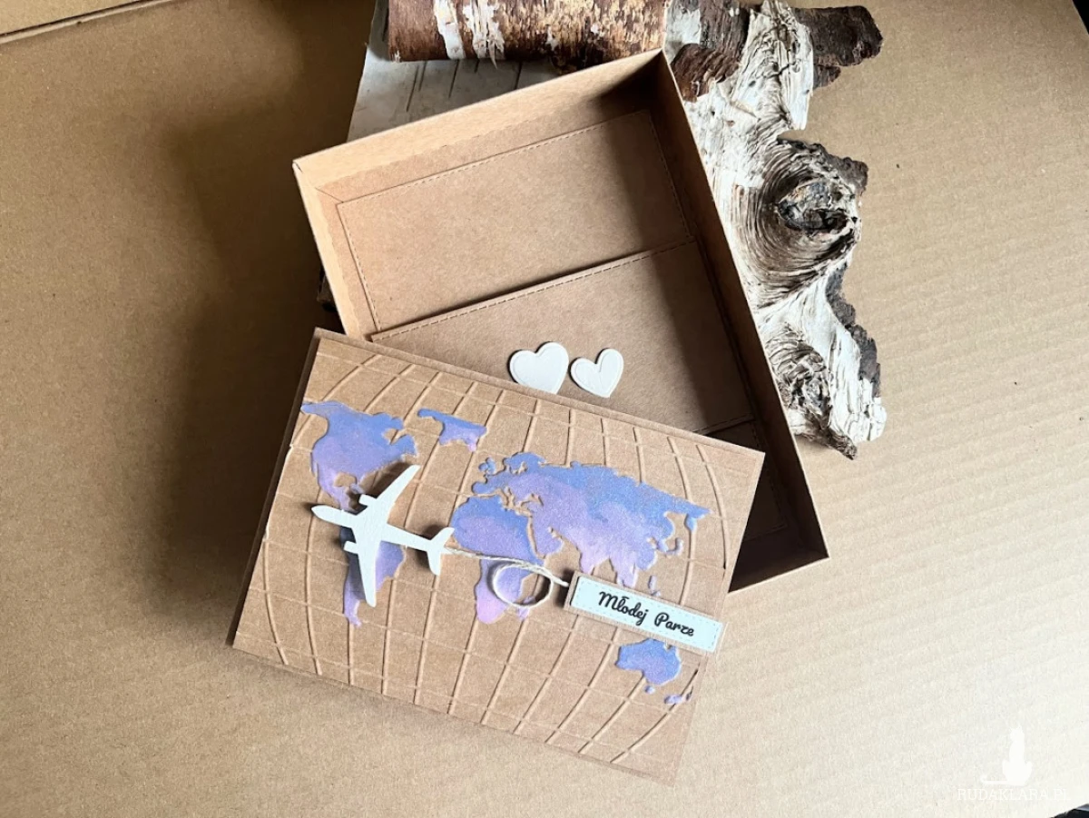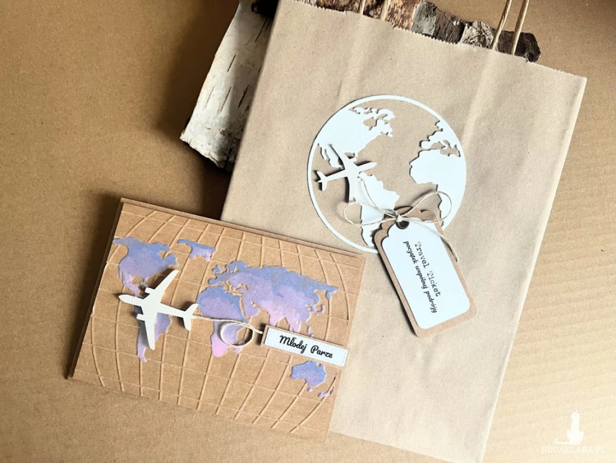 Kartka z okazji Ślubu w dopasowanym stylistycznie pudełku dla Młodej Pary , która kocha podróże i wybiera się w szczęśliwą podróż przez wspólne życie z urokliwym samolotem. Komplet stworzony na bazie papieru kraftowego nadając kompletowi klimat eco z dodatkiem błękitu i różu. Kartka ma wymiary 14,5x 10,5 , pudełko ma wymiary 17,5 x 12,5. Całość obwiązana sznurkiem z tagiem - biletem .W środku kartki znajdują się gotowe życzenia do włanoręcznego podpisu oraz umieszczono kieszonkę na małe co nieco lub kupon lotto . Do kompletu dodano kraftową torebkę ozdobioną w tym samym stylu co kartka o wymiarach 18x23x8 W tej postaci produkt dostępny od ręki .
