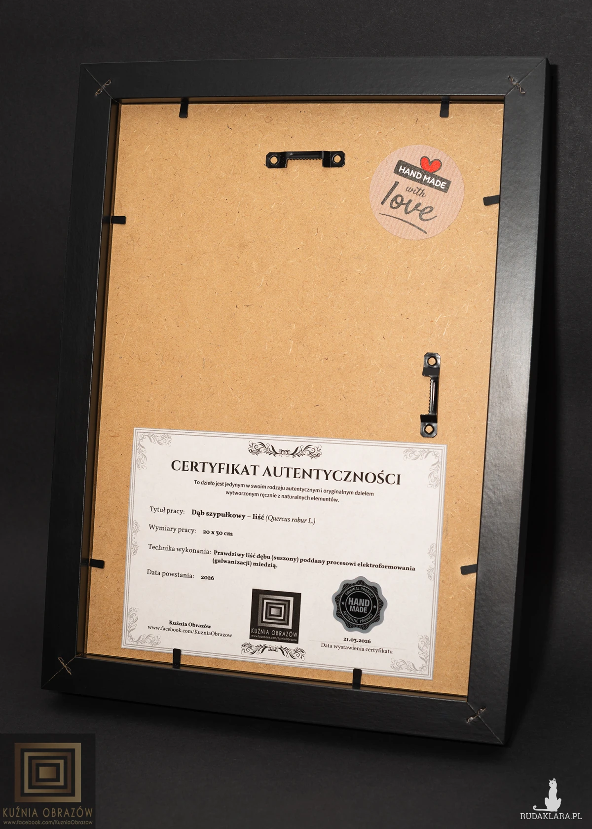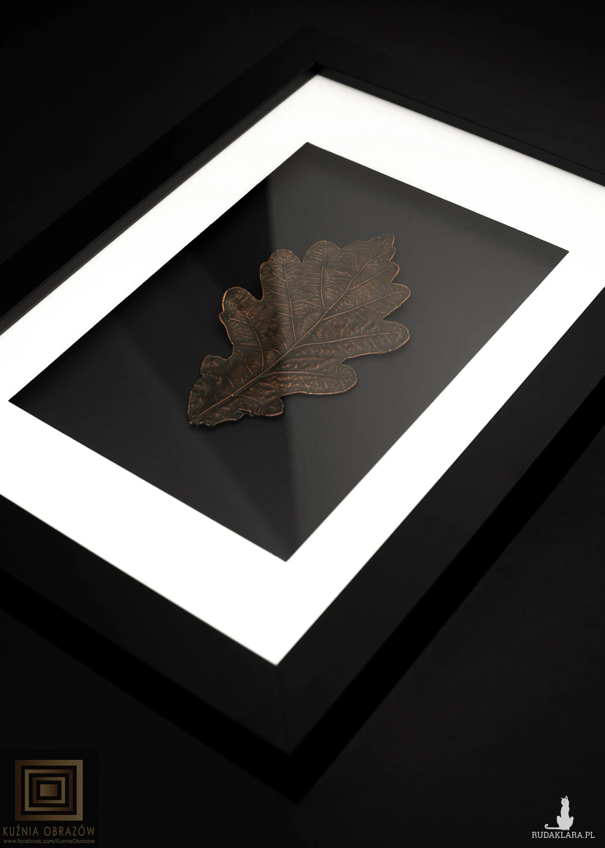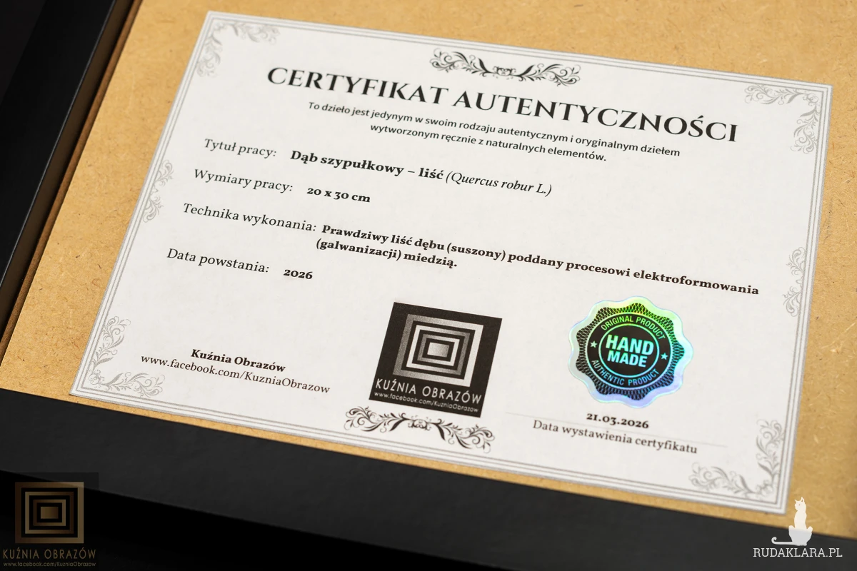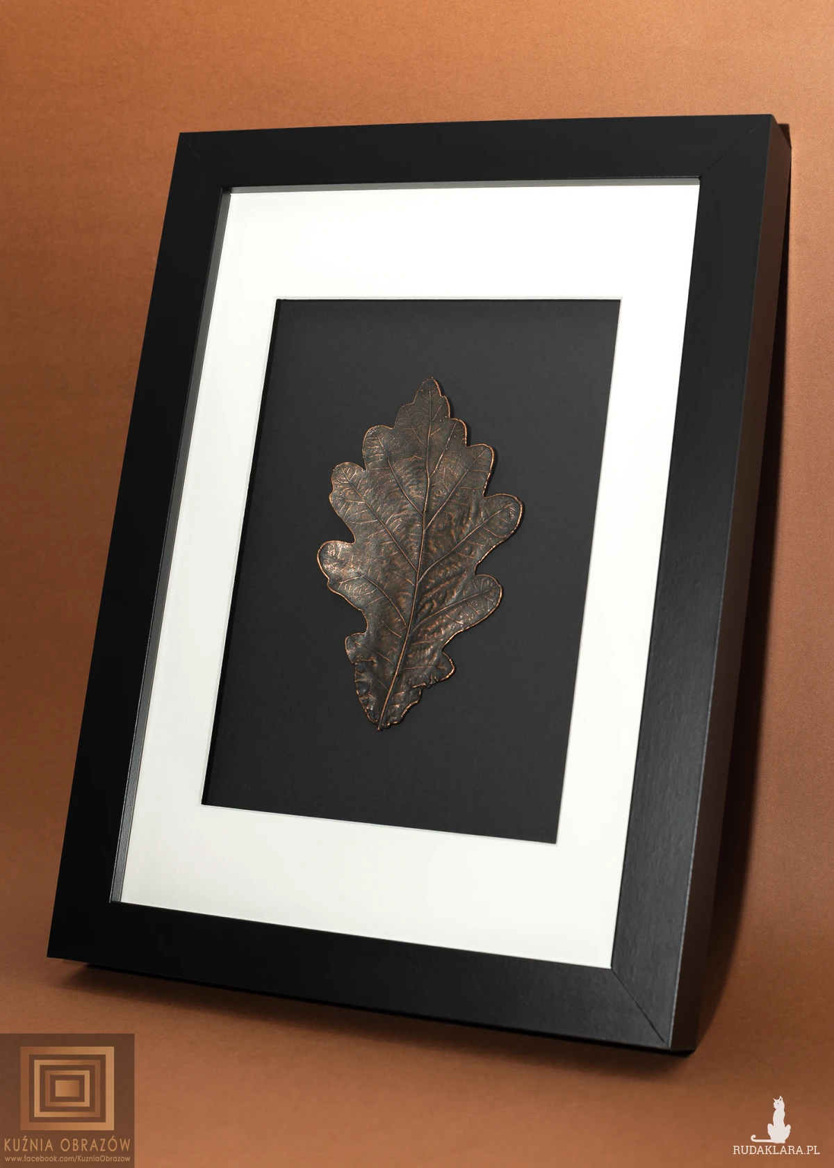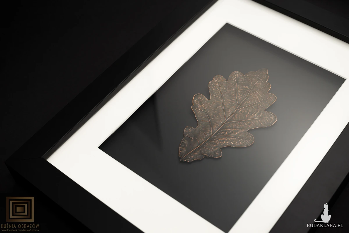 Miedziany liść dębu w nowoczesnej oprawie.
