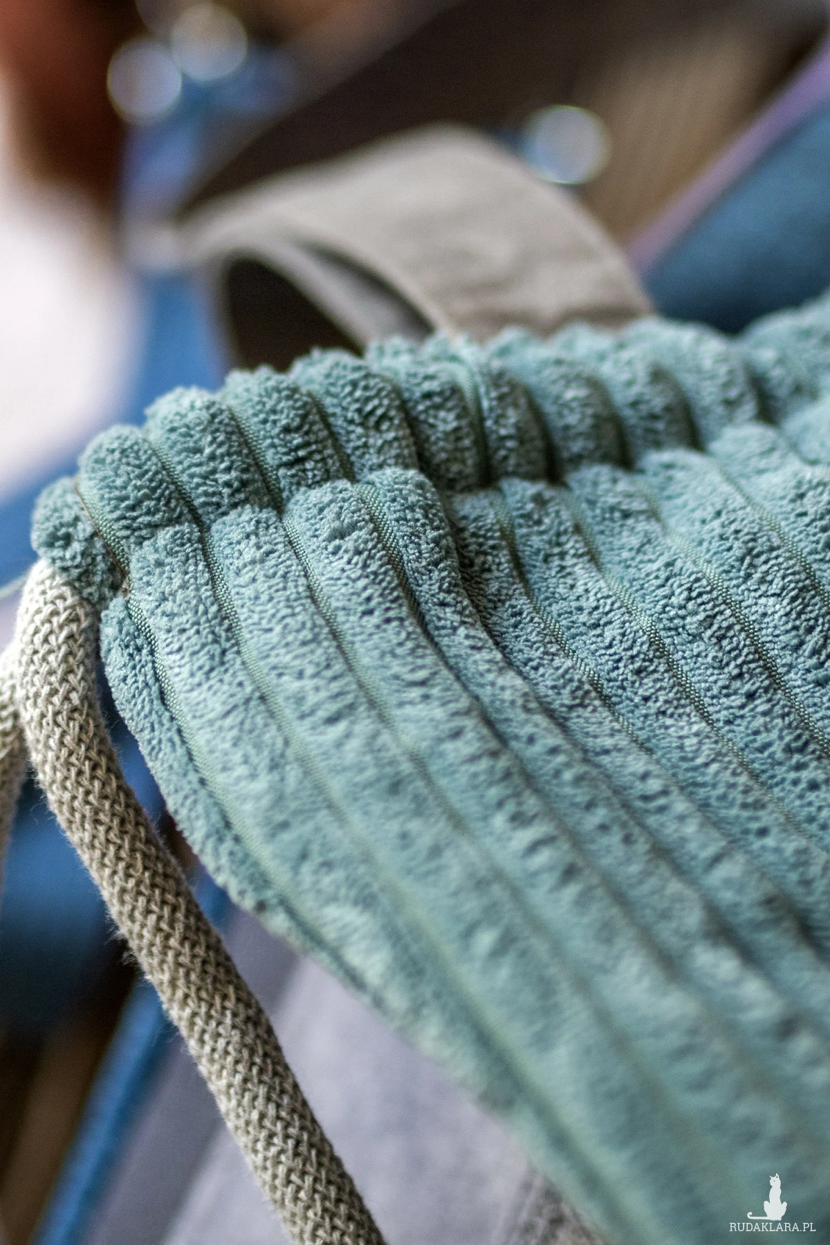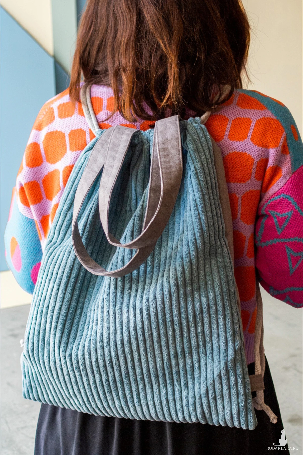 Plecakotorba worek 2w1 wykonana z grubego sztruksu w kolorze niebieskim w połączeniu z szarym nubukiem.