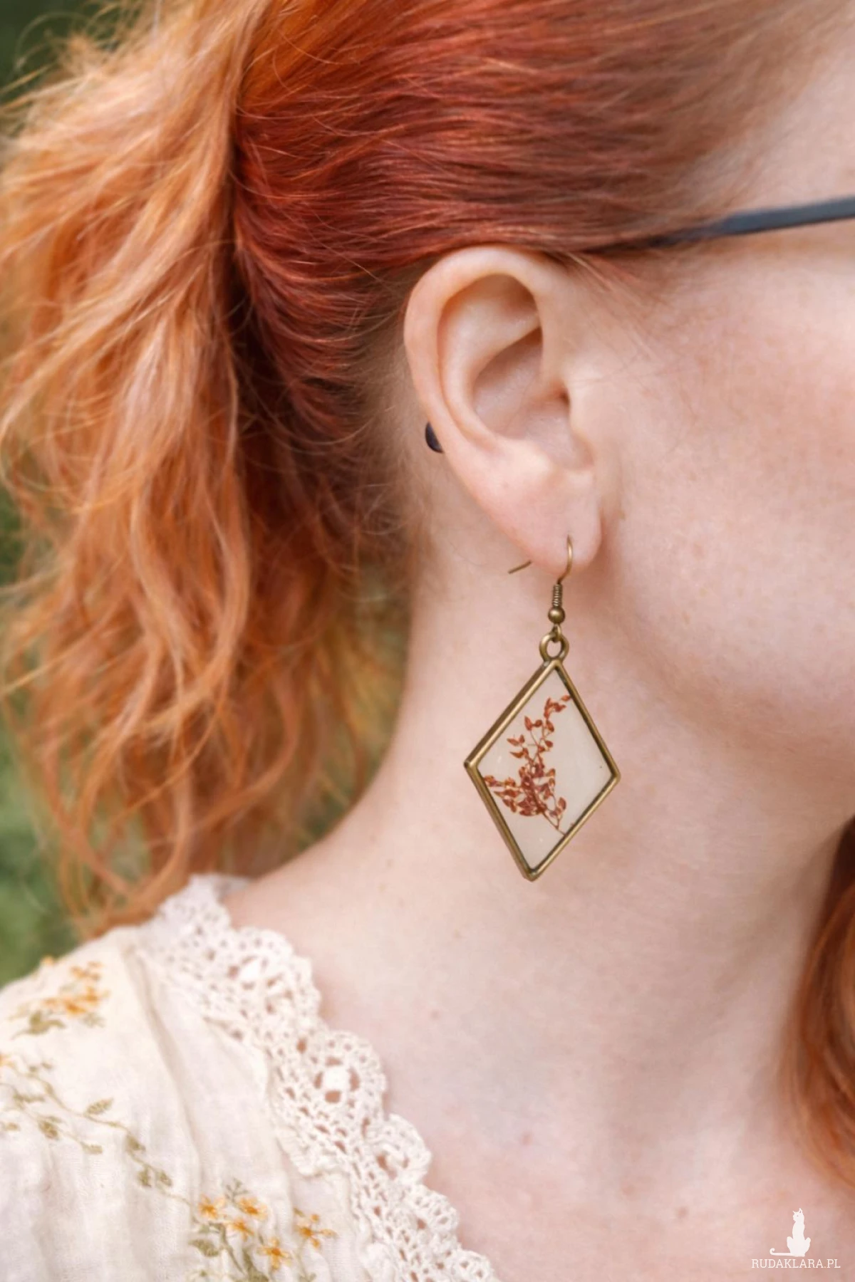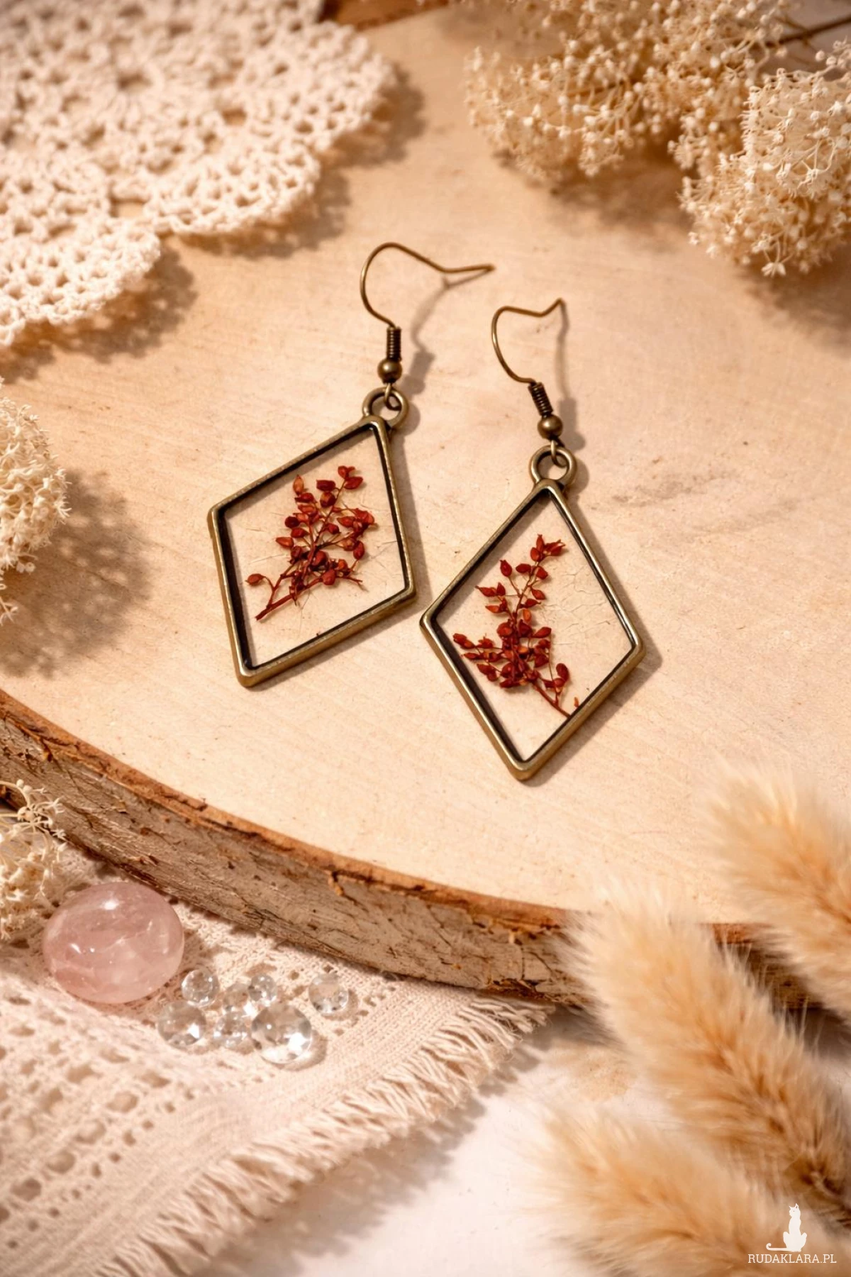 Unikatowe kolczyki handmade wykonane z wysokiej jakości żywicy epoksydowej, w której zatopione zostały naturalne czerwone kwiaty szczawiu. Transparentne tło pięknie podkreśla detale roślin, a geometryczny kształt rombów nadaje całości elegancki i nowoczesny wygląd.