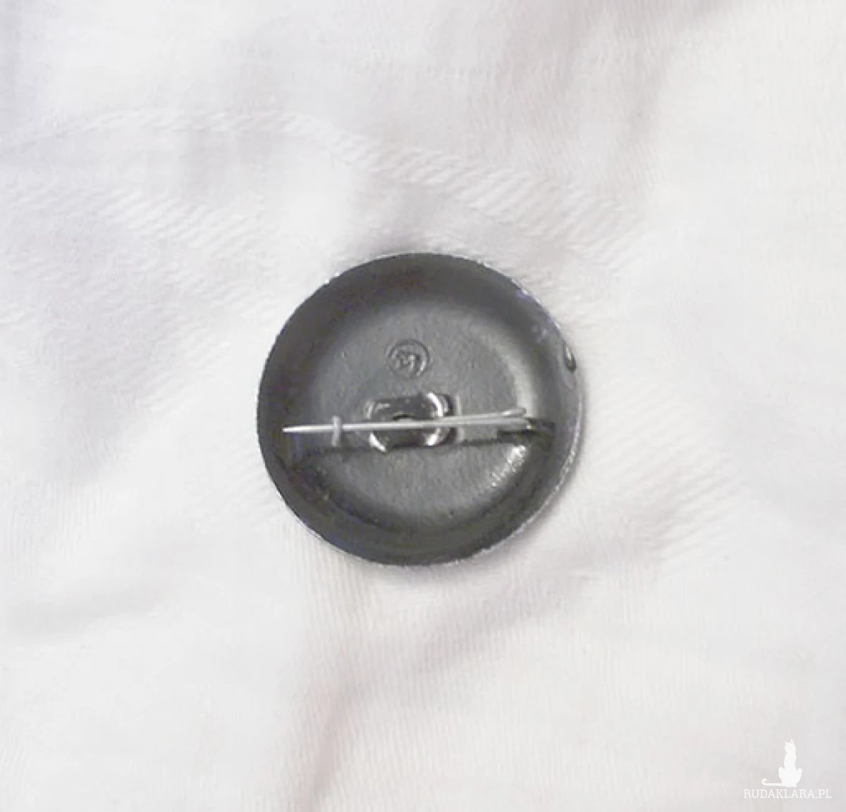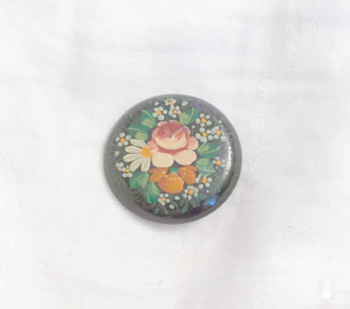 Oryginalny przedmiot retro z czasów PRL, lata 60/70. Wymiary: średnica 3,3 cm, malowana ręcznie, może mieć niewielkie ślady upływu czasu. Ogólny stan bdb. Vintage biżuteria jako ozdoba do żakietu, kurtki, torby, płaszcza itp. Rzecz także dla kolekcjonera sztuki użytkowej z tamtych lat.