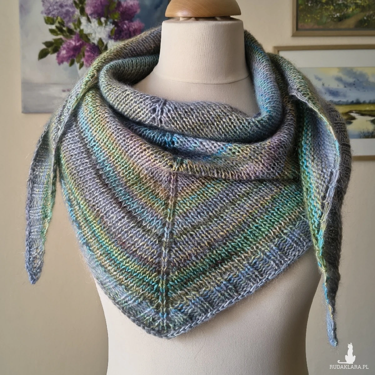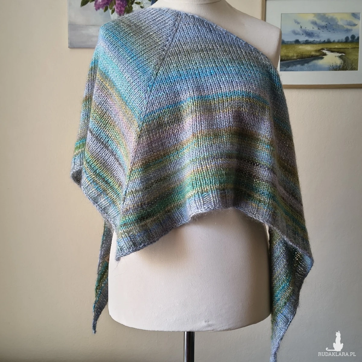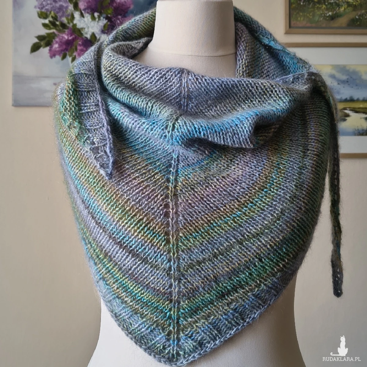 Miła, puchata, miękka, lejąca chusta, wykonana ręcznie na drutach podwójną nitką z doskonałych, szlachetnych włóczek o składzie: wełenka merino, najdelikatniejszy moher i jedwab. Niestety zdjęcia nie oddają uroku i miękkości włóczek. Chusta jest twarzowa i pasuje do wielu stylizacji. Będzie doskonałym uzupełnieniem garderoby o każdej porze roku. Wymiary: długość 182 cm., wysokość trójkąta 60 cm. Pranie wyłącznie ręczne.
