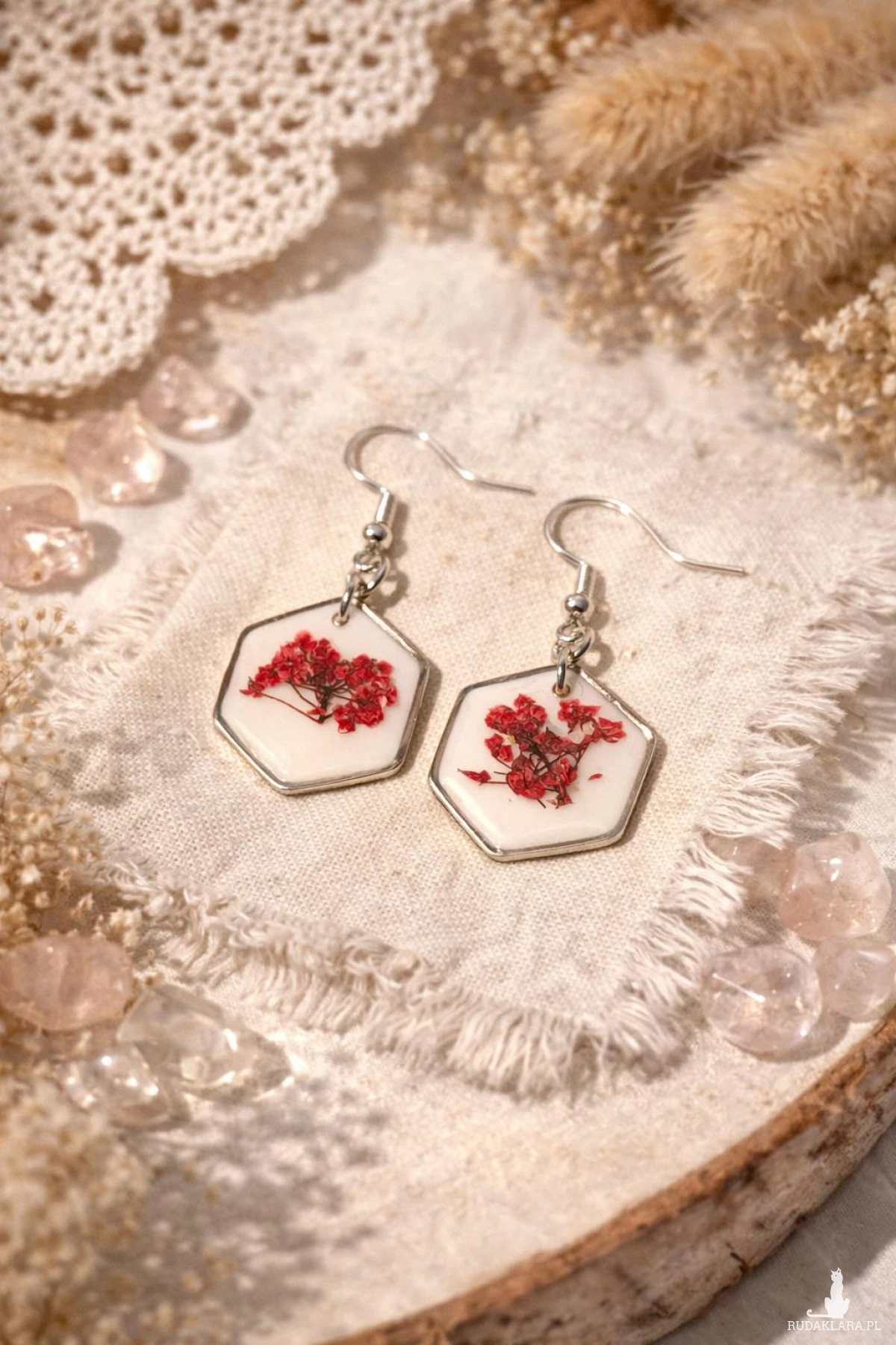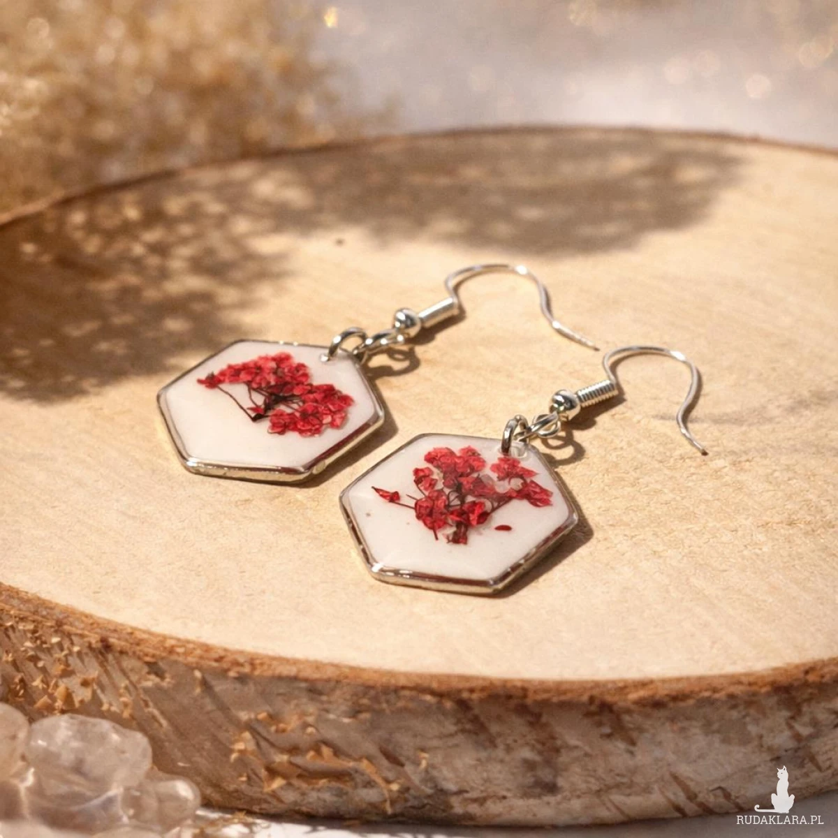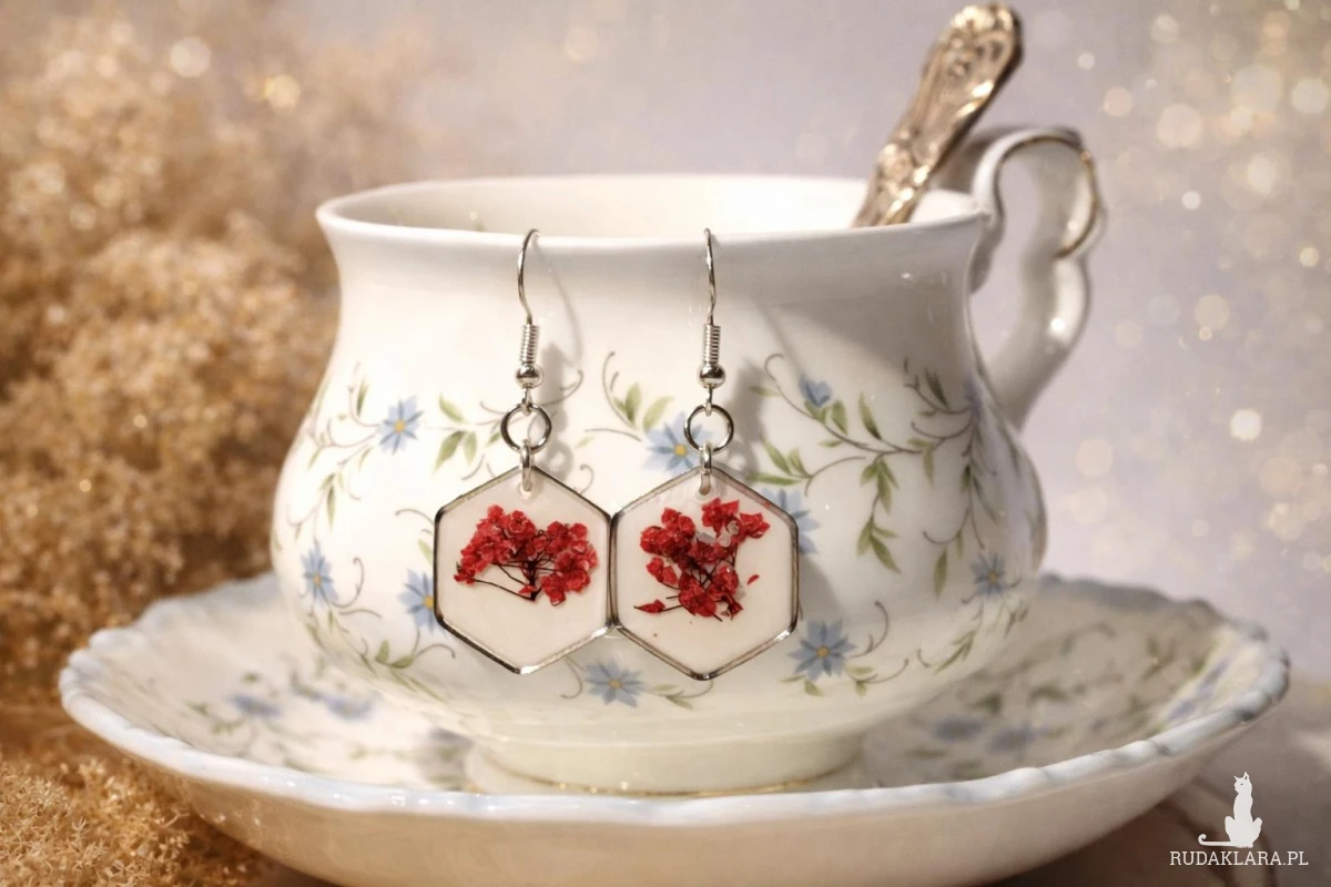 Wyjątkowe kolczyki handmade wykonane z wysokiej jakości żywicy epoksydowej, w której zatopione zostały naturalne czerwone kwiaty smagliczki. Jasne, białe tło pięknie kontrastuje z intensywną czerwienią roślin, tworząc efektowną i przyciągającą wzrok kompozycję.