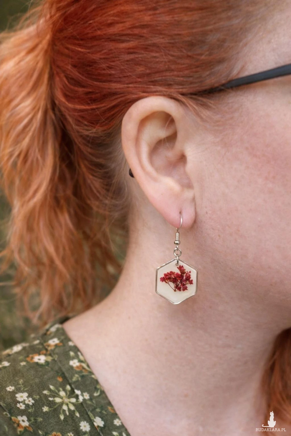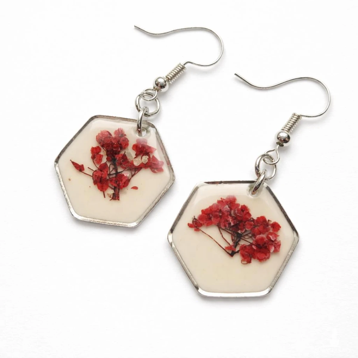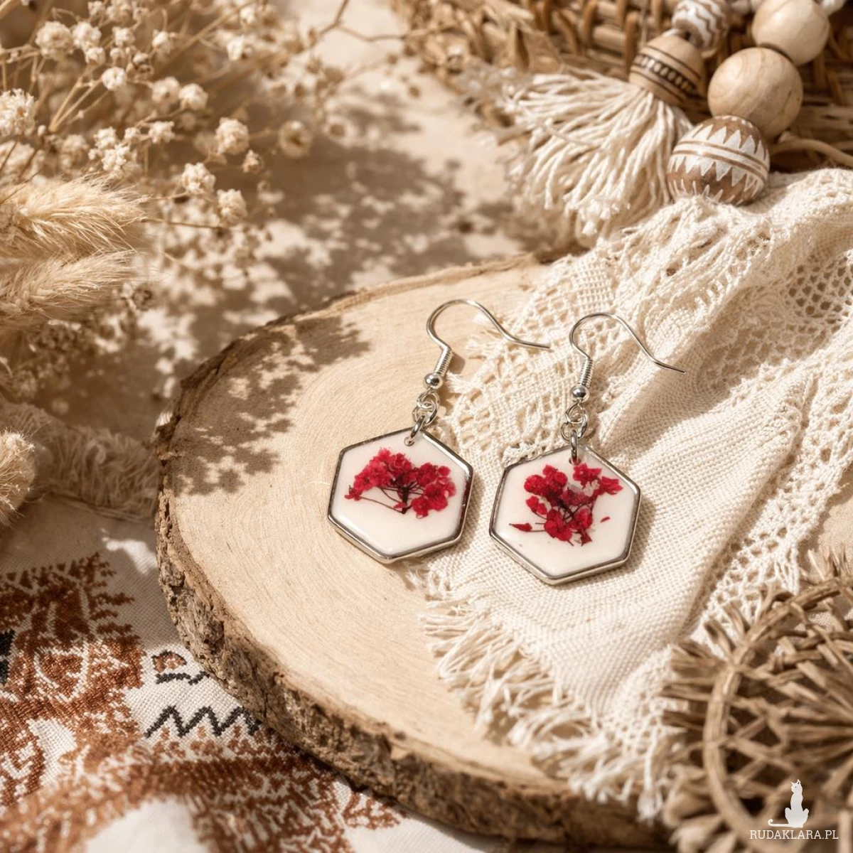 Wyjątkowe kolczyki handmade wykonane z wysokiej jakości żywicy epoksydowej, w której zatopione zostały naturalne czerwone kwiaty smagliczki. Jasne, białe tło pięknie kontrastuje z intensywną czerwienią roślin, tworząc efektowną i przyciągającą wzrok kompozycję.
