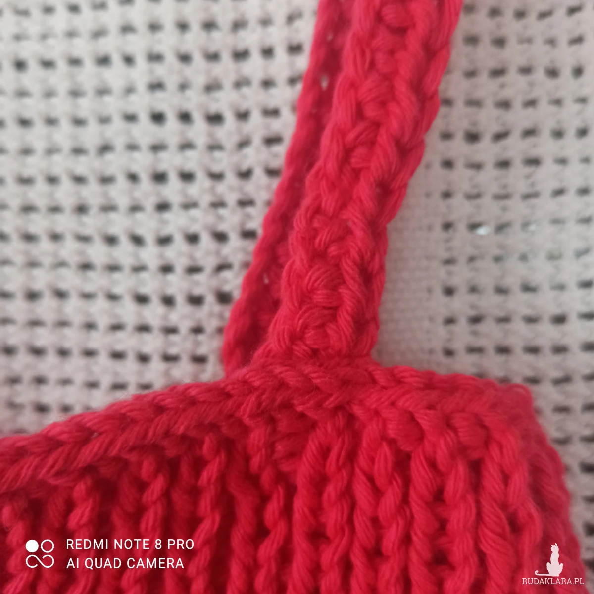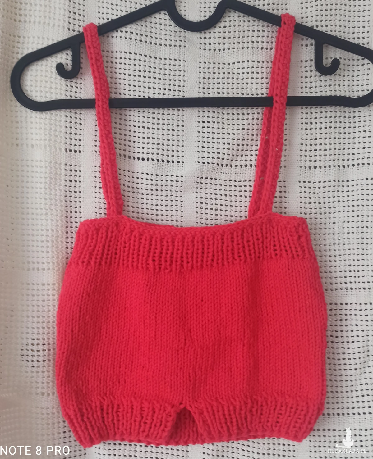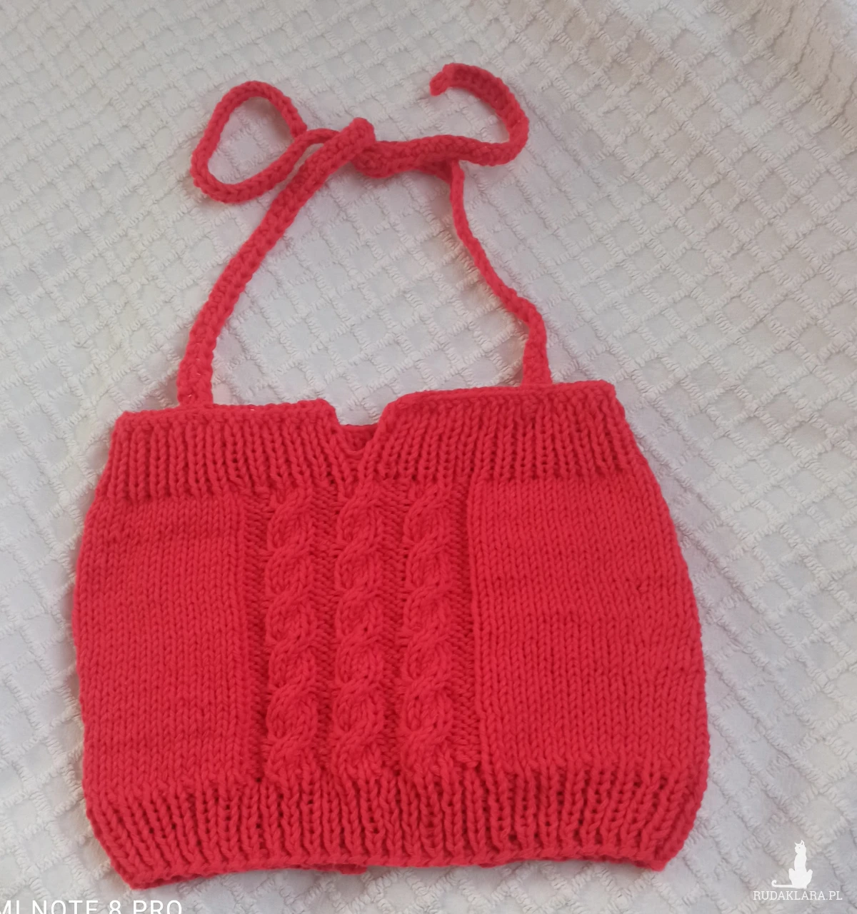 Bawełniany top na ramiączkach w kolorze karmazynowym wykonany na drutach. Ściągacz oczko lewe oczko prawe z rozcięciami w kształcie litery V z przodu i z tyłu o głębokości 4,5 cm. Ramiączka wykonane na szydełku o długości 49 cm, które można wiązać lub krzyżować oraz regulować przyszywając guziczki/w zestawie z topem/. Wysokość topa 23 cm, szerokość u góry /bez rozciągania/31 cm, szerokość u dołu 29 cm. Wygląda bardzo ładnie ozdobiony trzema warkoczami z przodu. Całość robiona bezszwowo oczkami prawymi. Można nosić pod żakiet, kurtkę, samodzielnie.