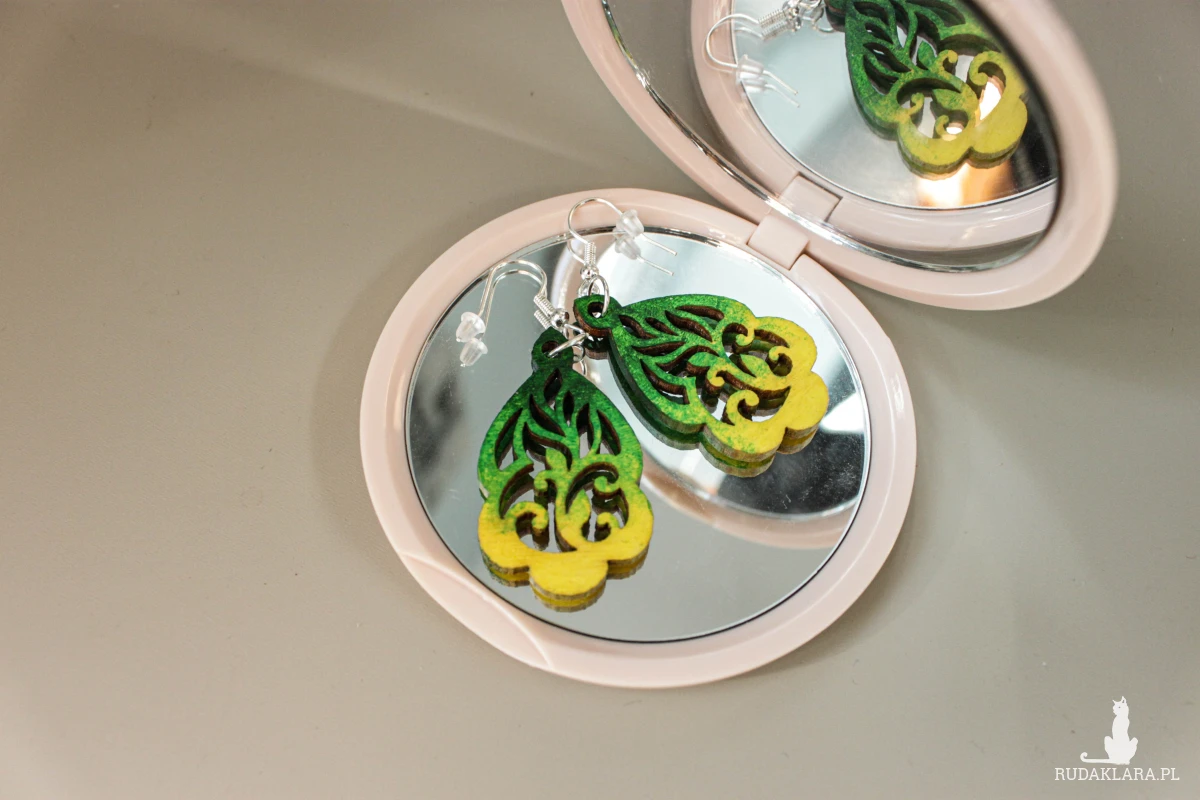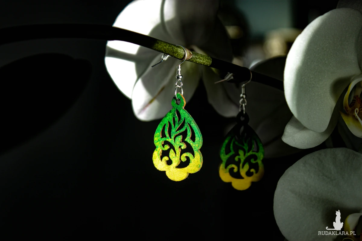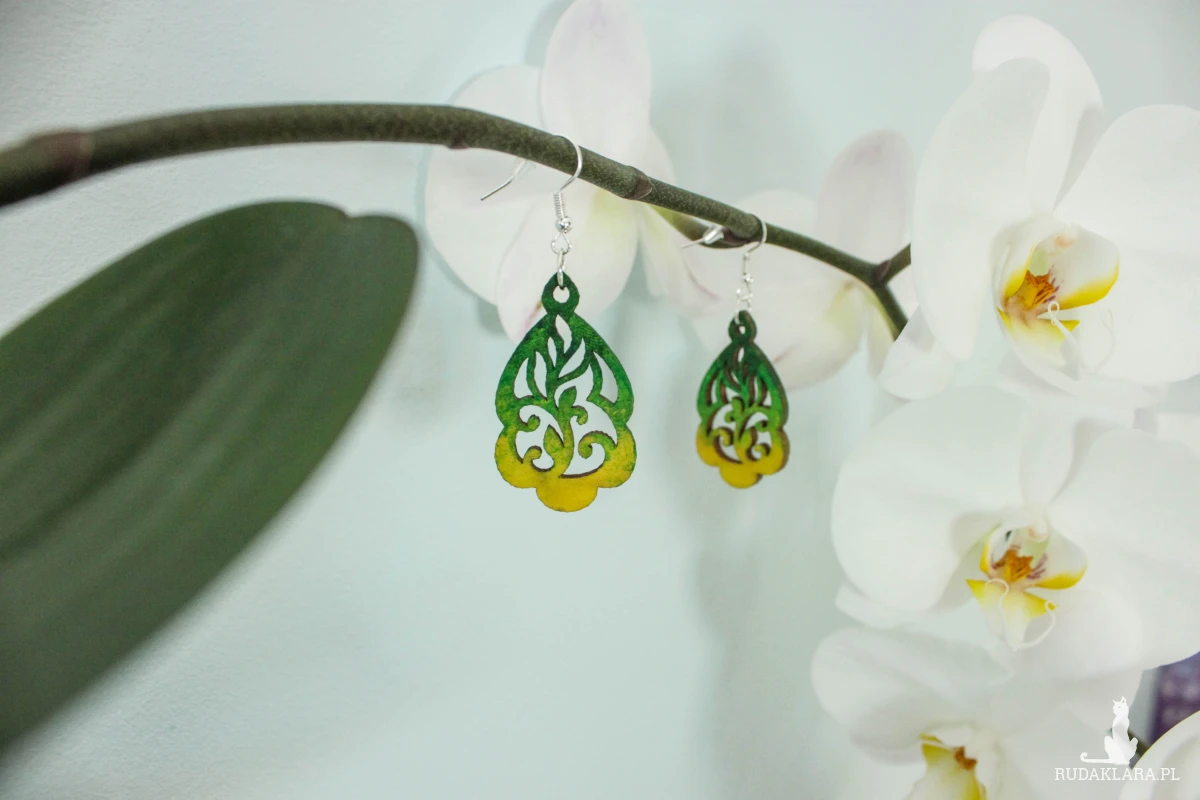 Ażurowe Żółte Zielone Koronka drewniane kolczyki