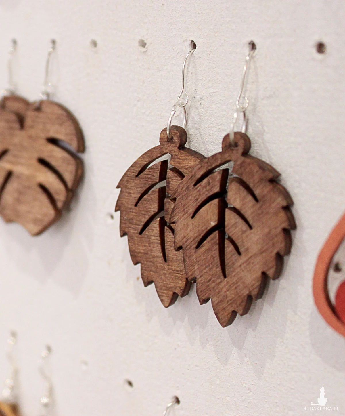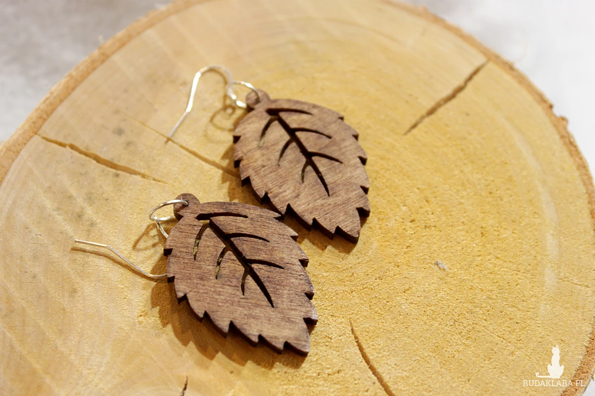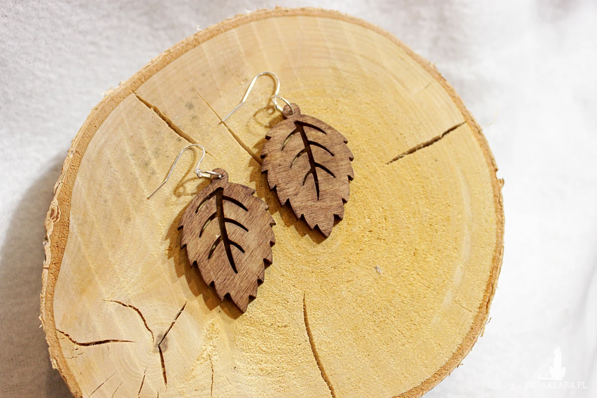 Ażurowe wiszące drewniane kolczyki.