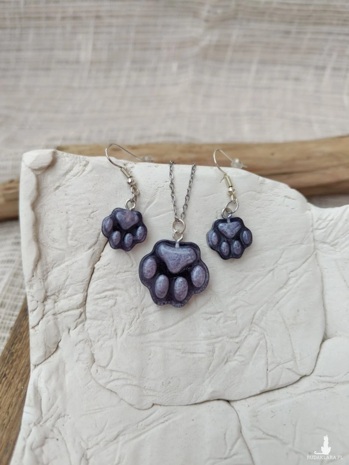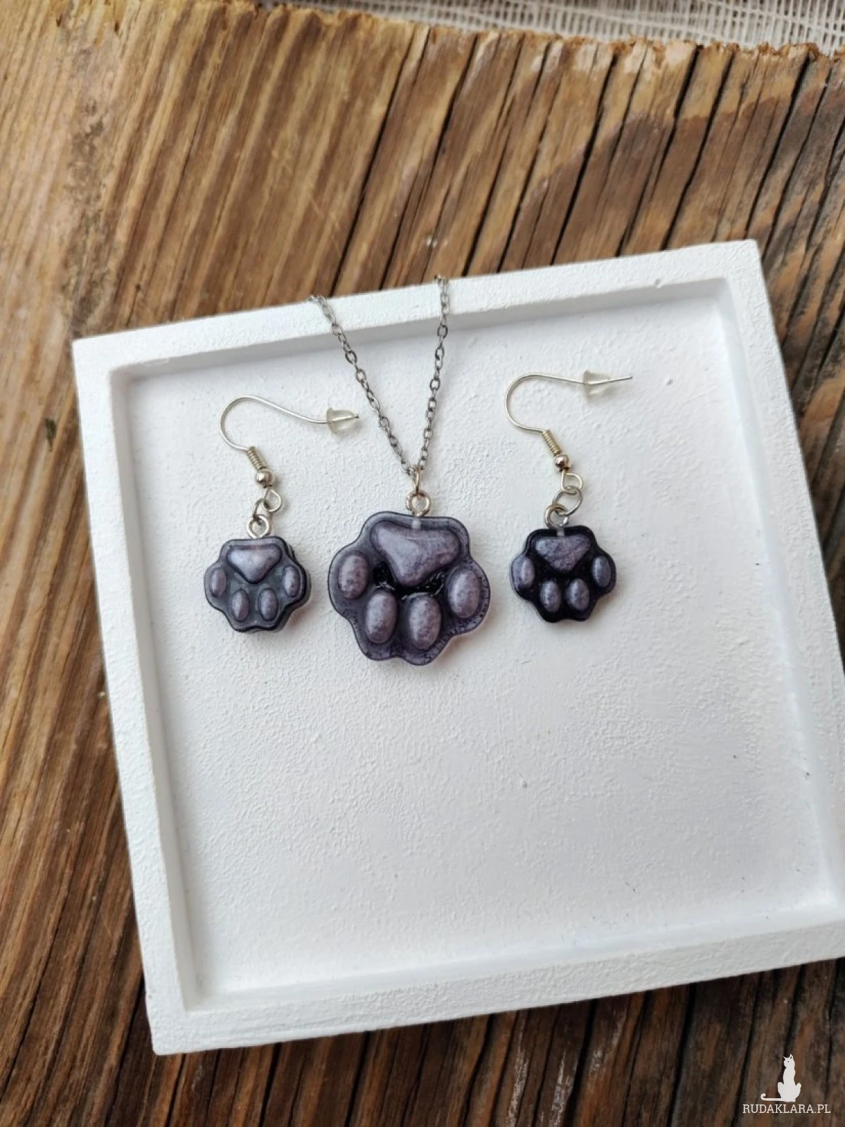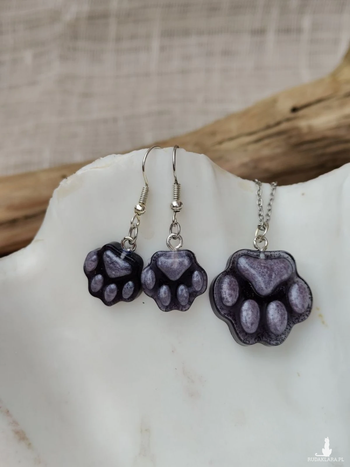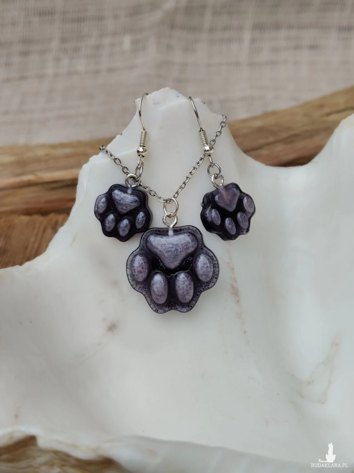 Delikatny i uroczy komplet biżuterii inspirowany miłością do zwierząt. Naszyjnik oraz kolczyki w kształcie psiej łapki zachwycają subtelnym, fioletowym odcieniem z lekko perłowym połyskiem. To idealny dodatek dla miłośników psów i osób, które lubią biżuterię z charakterem. Komplet jest lekki i wygodny w noszeniu, dzięki czemu sprawdzi się zarówno na co dzień, jak i jako wyjątkowy akcent do casualowych stylizacji. Świetny pomysł na prezent dla każdej osoby kochającej czworonogi.