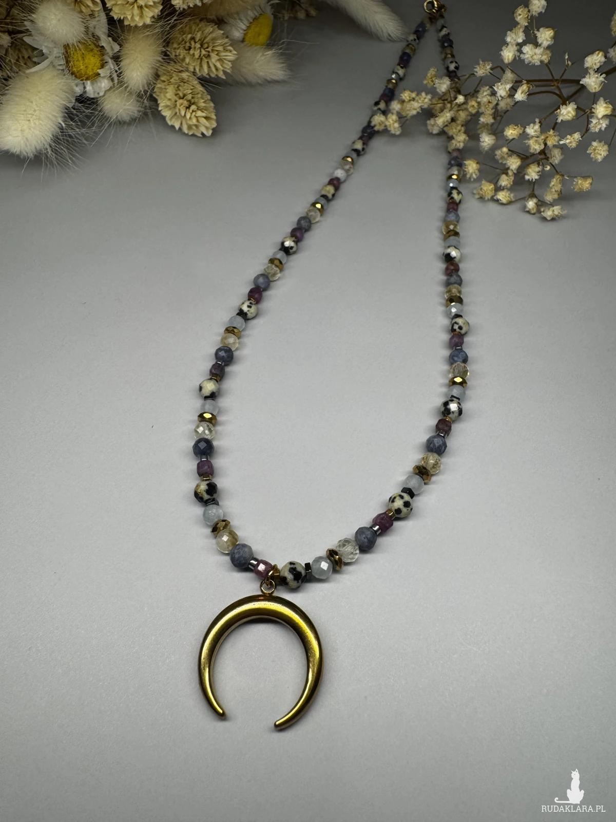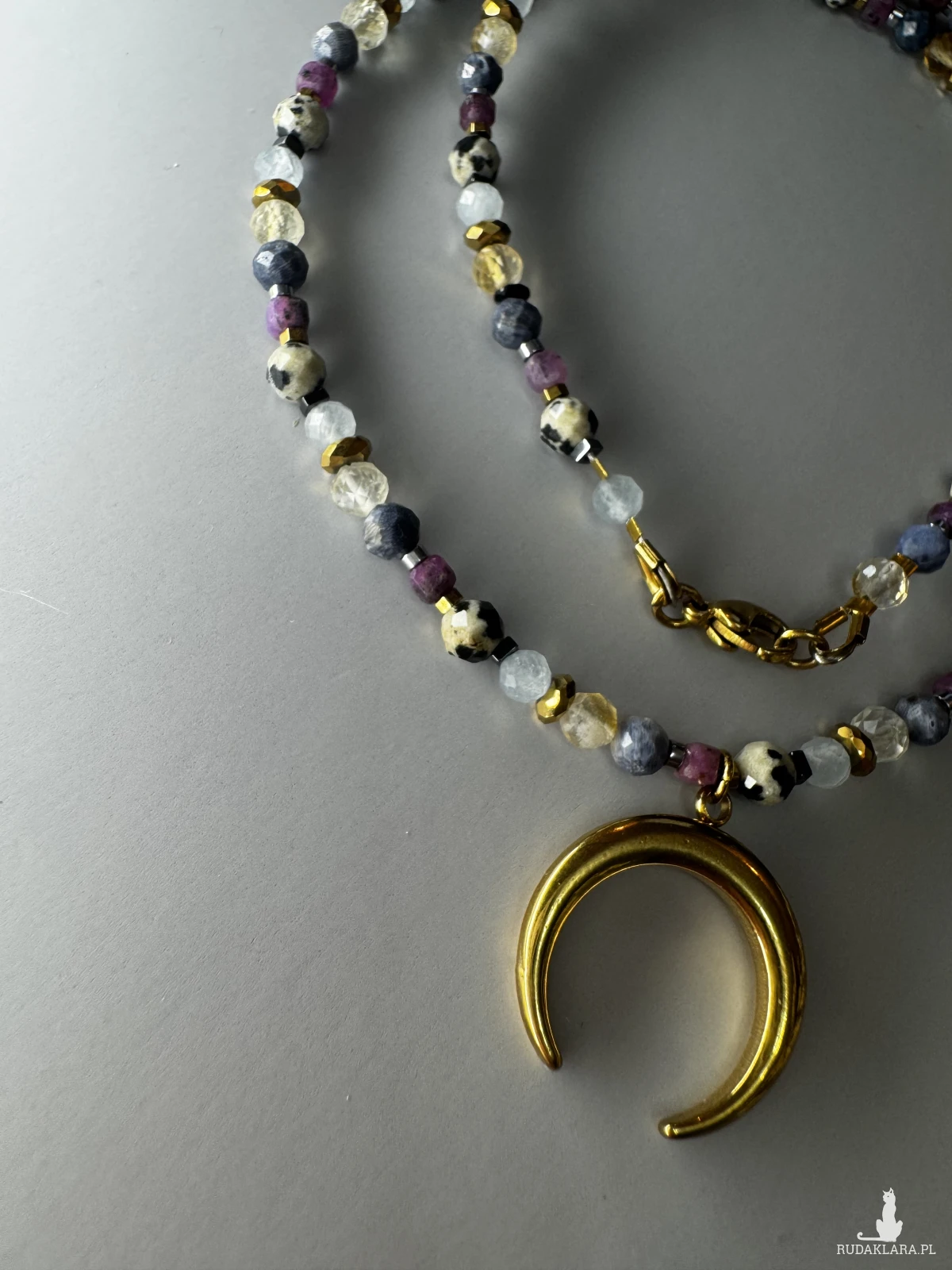 Wykończony wisiorkiem, hematytem i stalą szlachetną w złotym i srebrnym kolorze.