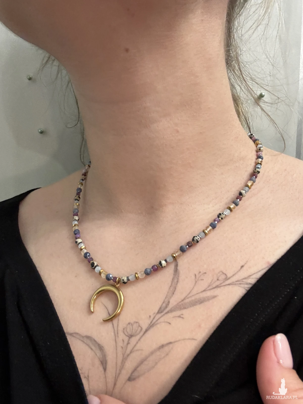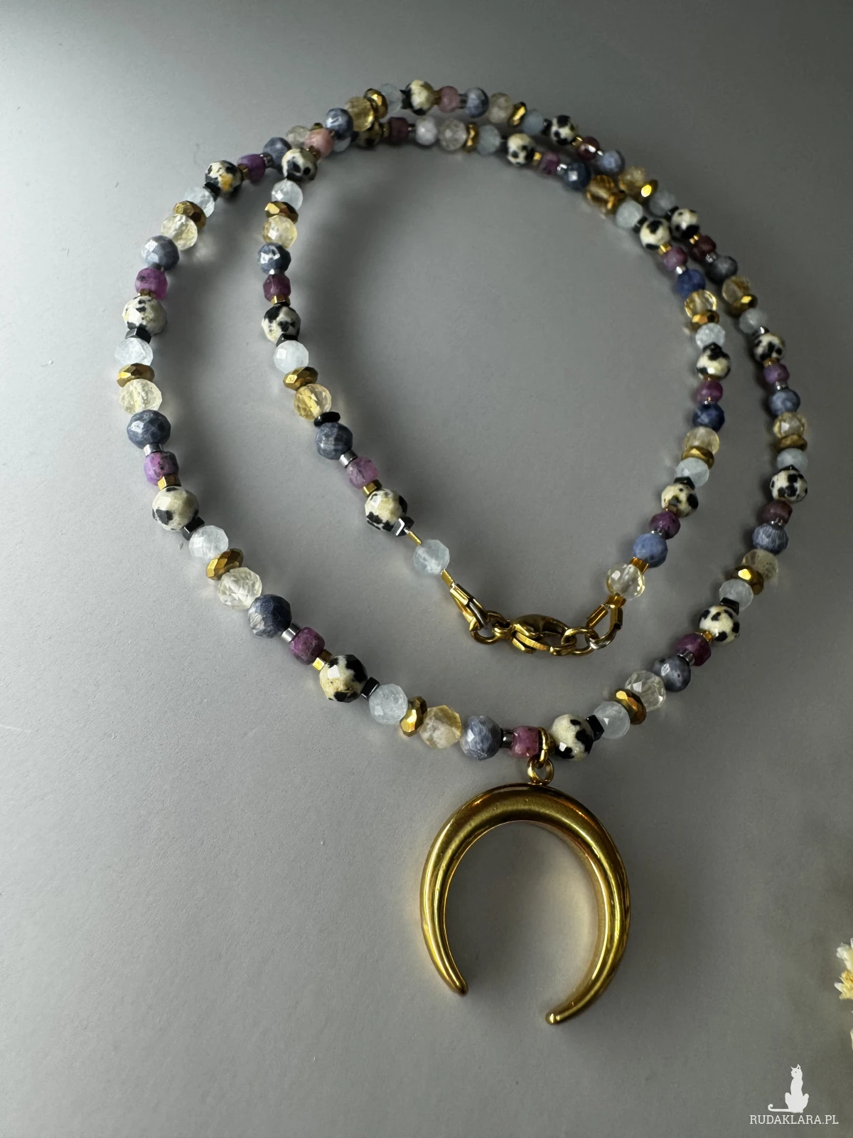 Naszyjnik, w delikatnych, wręcz pastelowych odcieniach kamieni szlachetnych, w całości zrobiony z małych, 2-4 koralików akwamarynu, jaspisu dalmatyńskiego, rubinu, korala, onyksu oraz cytrynu. przyciągnie spokój i dobrobyt, wspomoże asertywność i oraz ułatwi wyrażanie myśli i uczuć. wyrażanie.