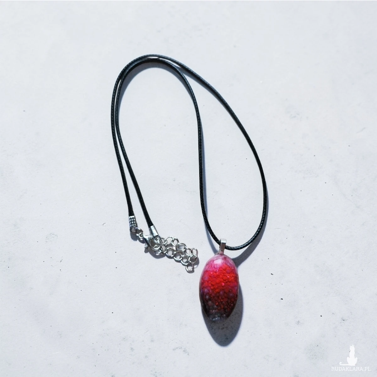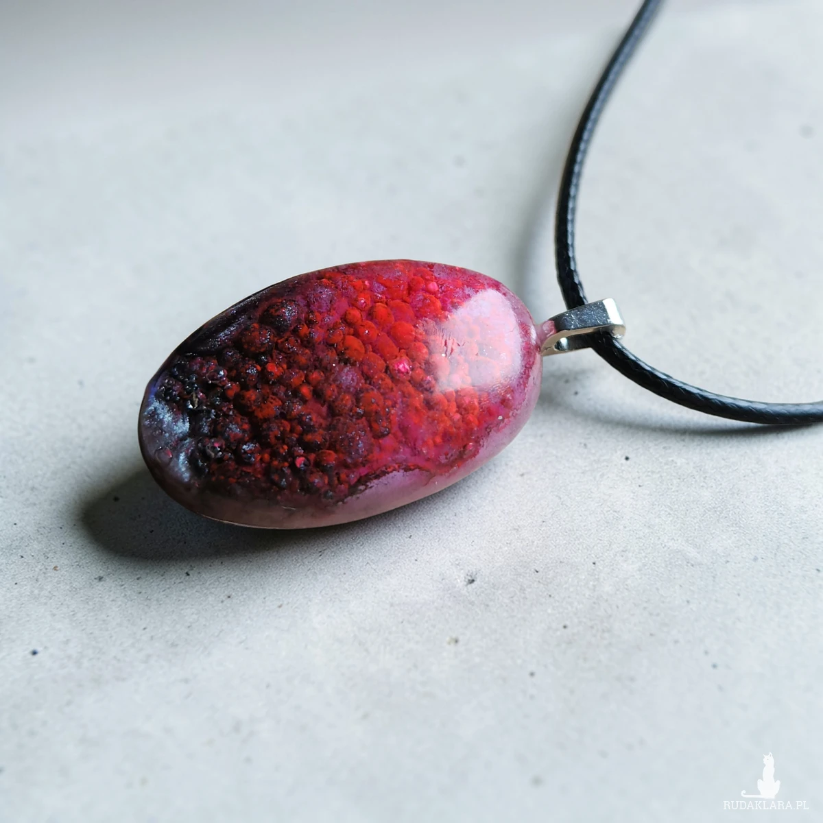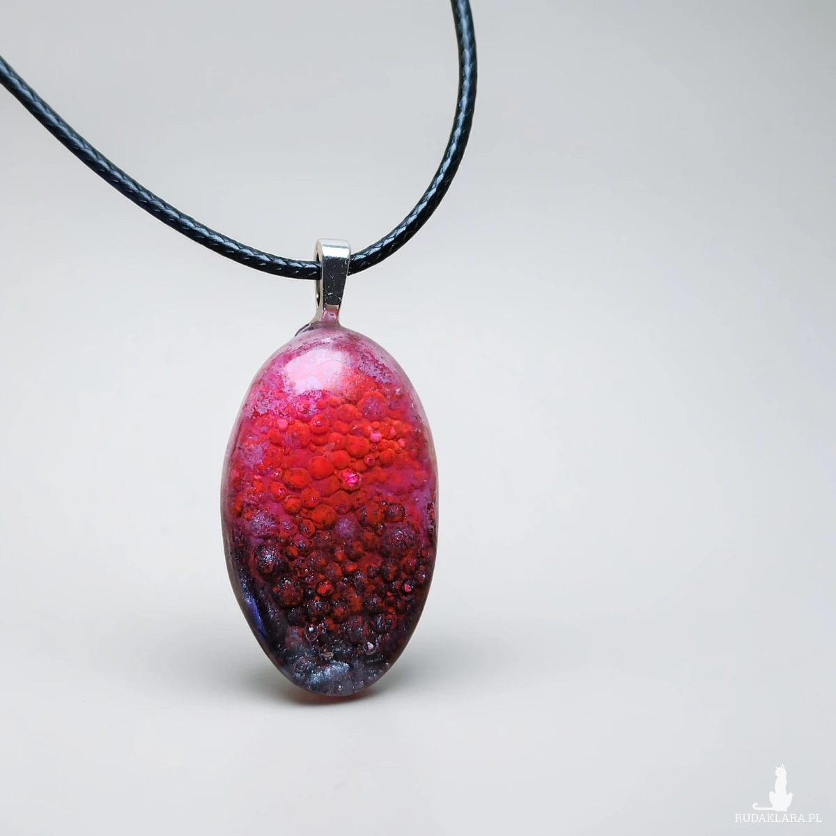 Oferuję wyjątkowy naszyjnik wykonany ręcznie z wysokiej jakości żywicy. Zawieszka w kształcie owalnym zachwyca efektem 3D – wewnątrz zatopiona została struktura przypominająca drobne czerwone kryształki/bąbelki, które tworzą niepowtarzalny, głęboki efekt wizualny.