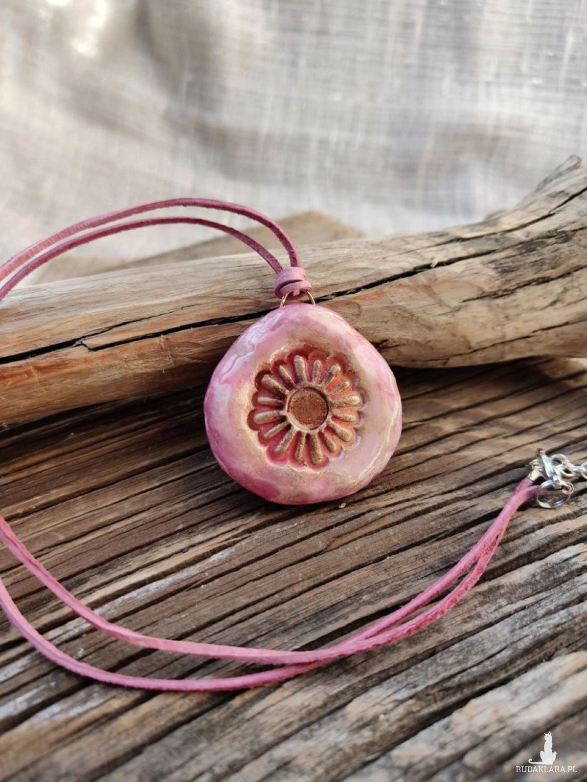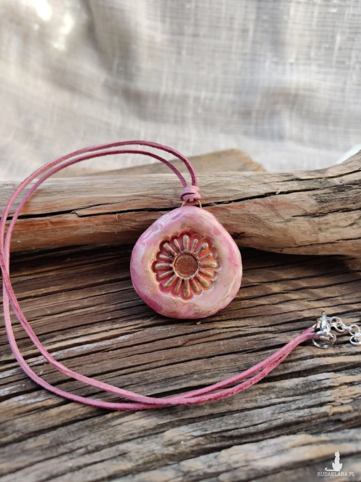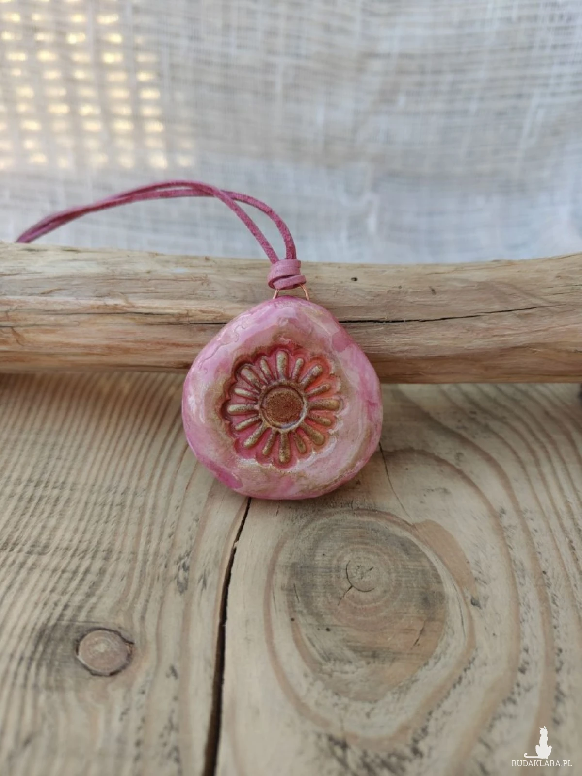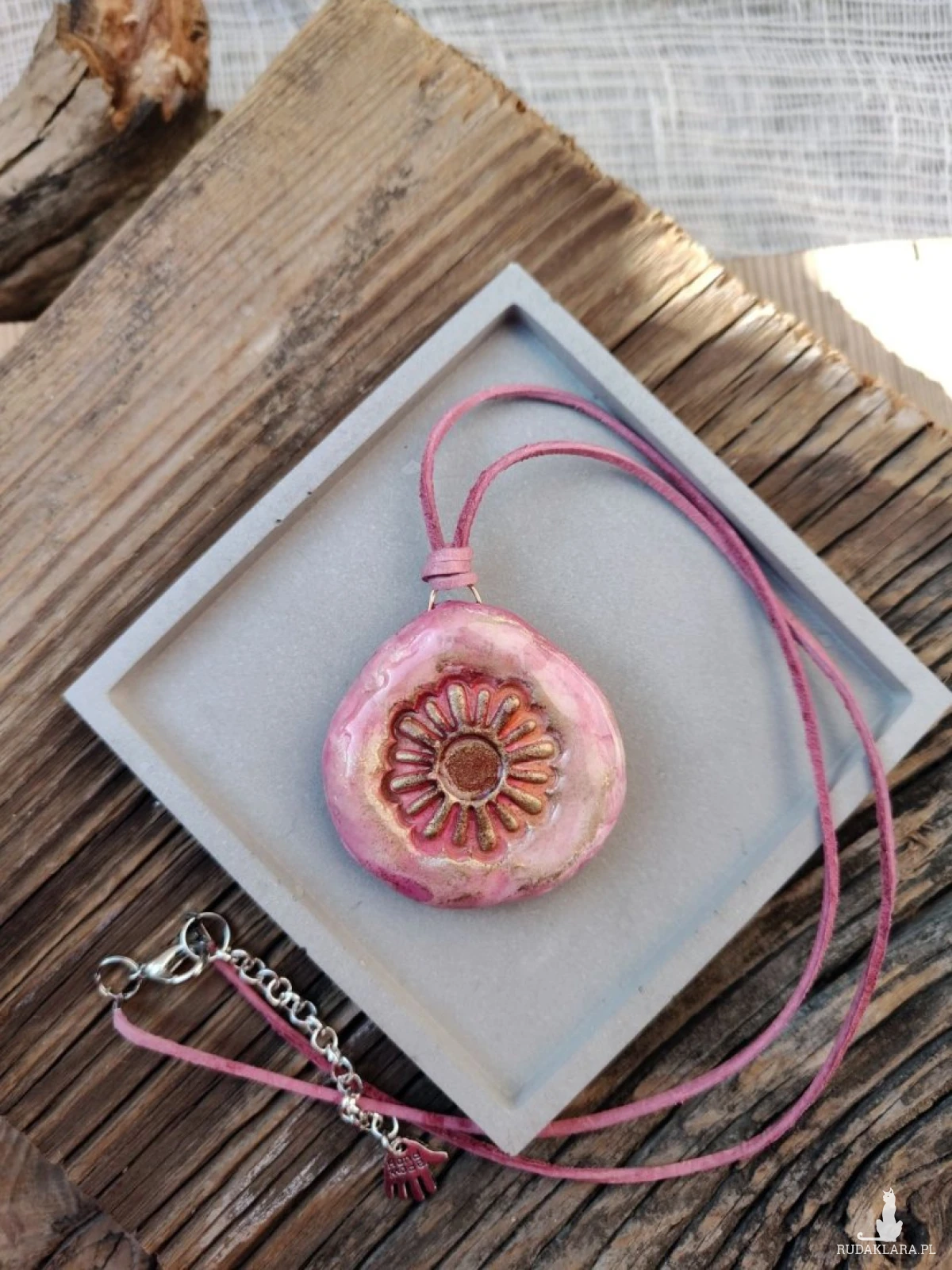 Subtelny, ręcznie wykonany wisiorek w odcieniach pudrowego różu to połączenie naturalnego piękna i artystycznego rzemiosła. Delikatny motyw kwiatu w centralnej części przyciąga uwagę i nadaje biżuterii romantycznego charakteru. Zawieszony na skórzanym rzemieniu, doskonale uzupełni zarówno codzienne stylizacje, jak i bardziej eleganckie zestawy.