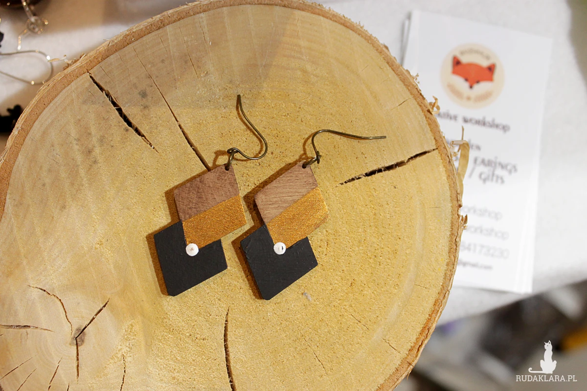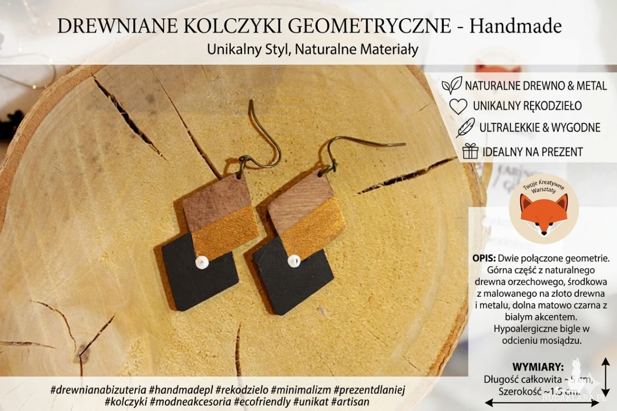 Hashtagi: #drewnianabizuteria #recznierobione #bizuteriahandmade #polskierękodzieło #geometria #zlotodetale #modernboho #bizuteriazpasja #prezentdlakobiety #kolczyki #slowfashion #artystycznabiżuteria