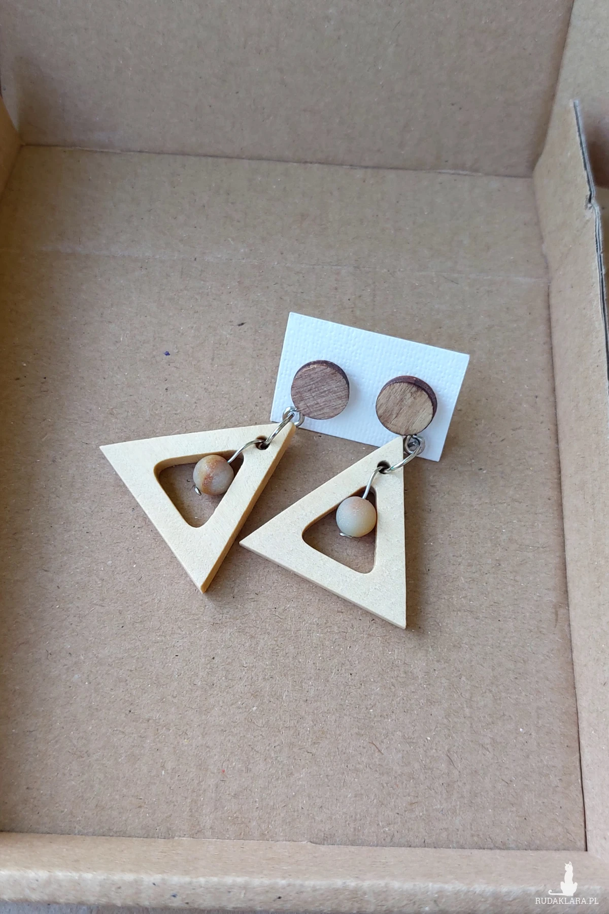 Postaw na architektoniczną formę i kolory ziemi! Te kolczyki to kwintesencja nowoczesnego minimalizmu. Połączenie jasnego, geometrycznego trójkąta z okrągłym drewnianym sztyftem i delikatnym koralikiem z naturalnego kamienia tworzy harmonijną całość, która zachwyca spokojem i elegancją.