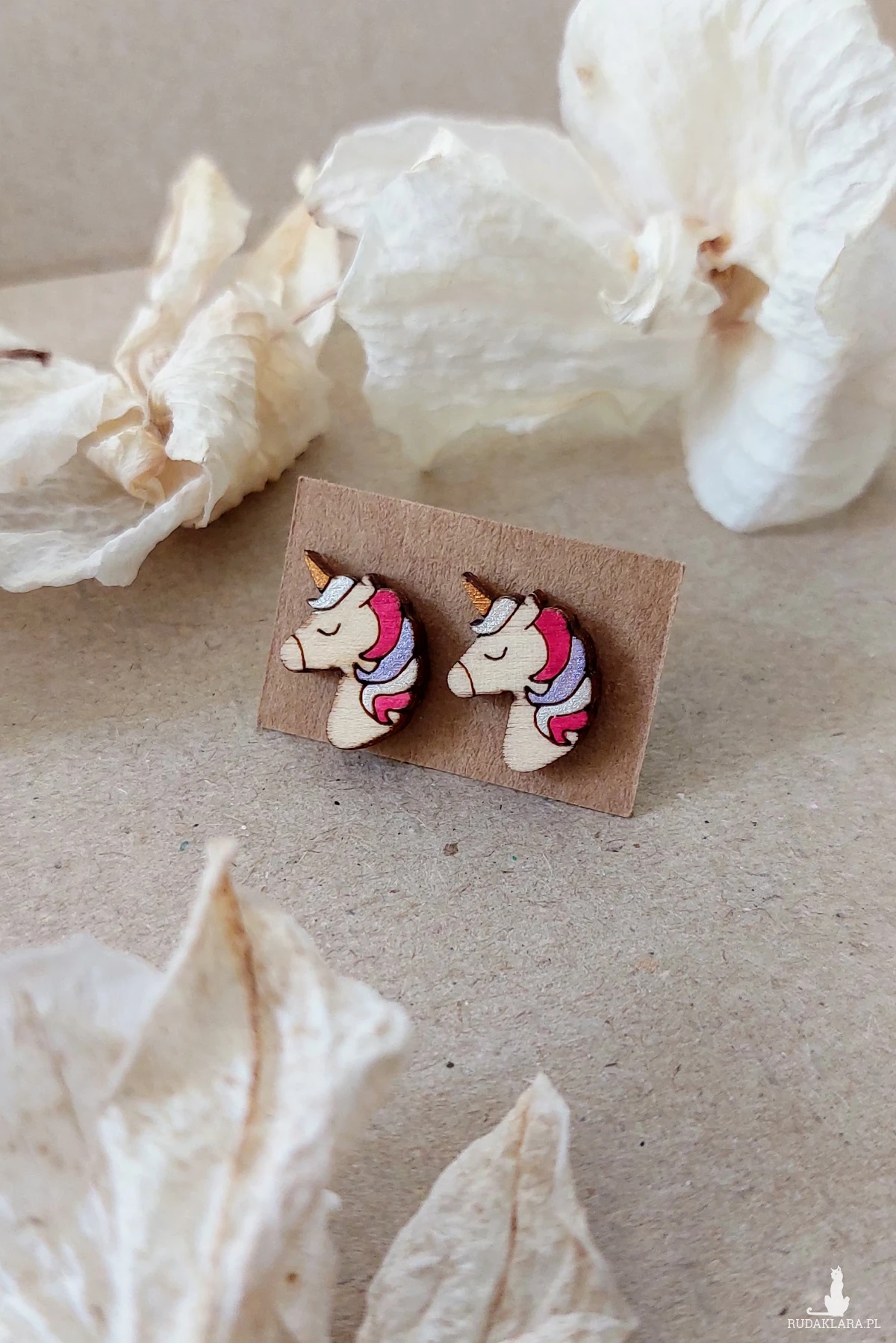 kolczyki jednorożce, biżuteria bajkowa, sztyfty dla dziewczynek, rękodzieło, polskie handmade, kolczyki z drewna, biżuteria fantasy, oryginalny prezent, lekkie kolczyki, jednorożec biżuteria.