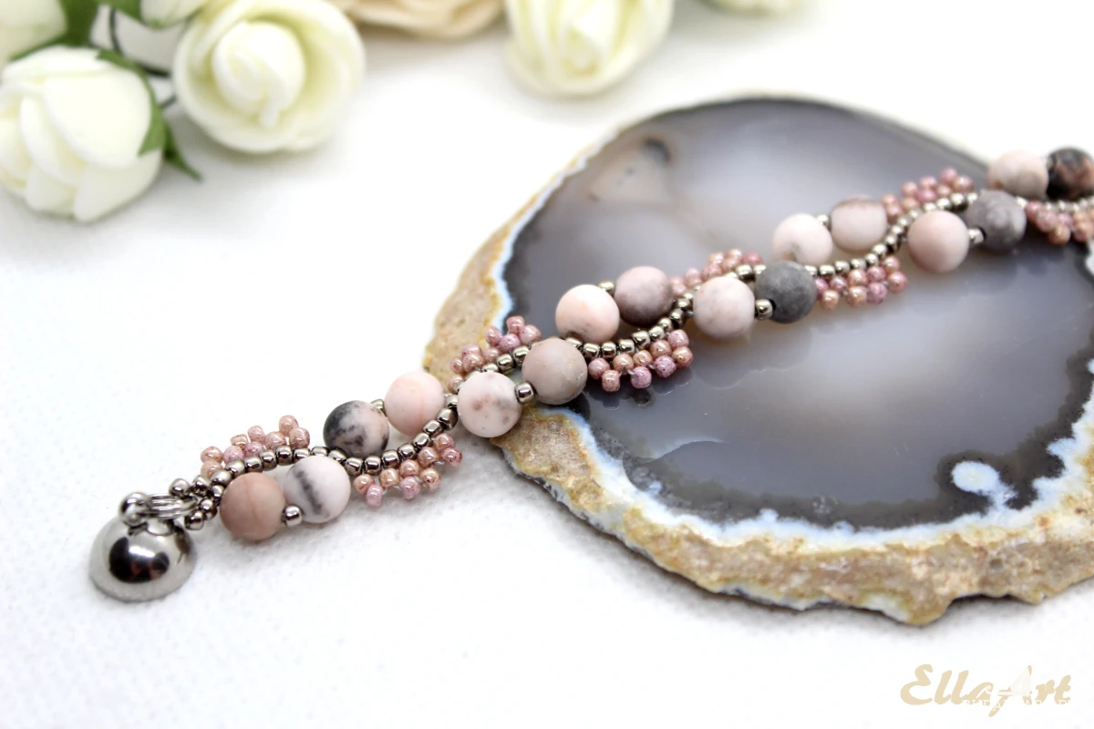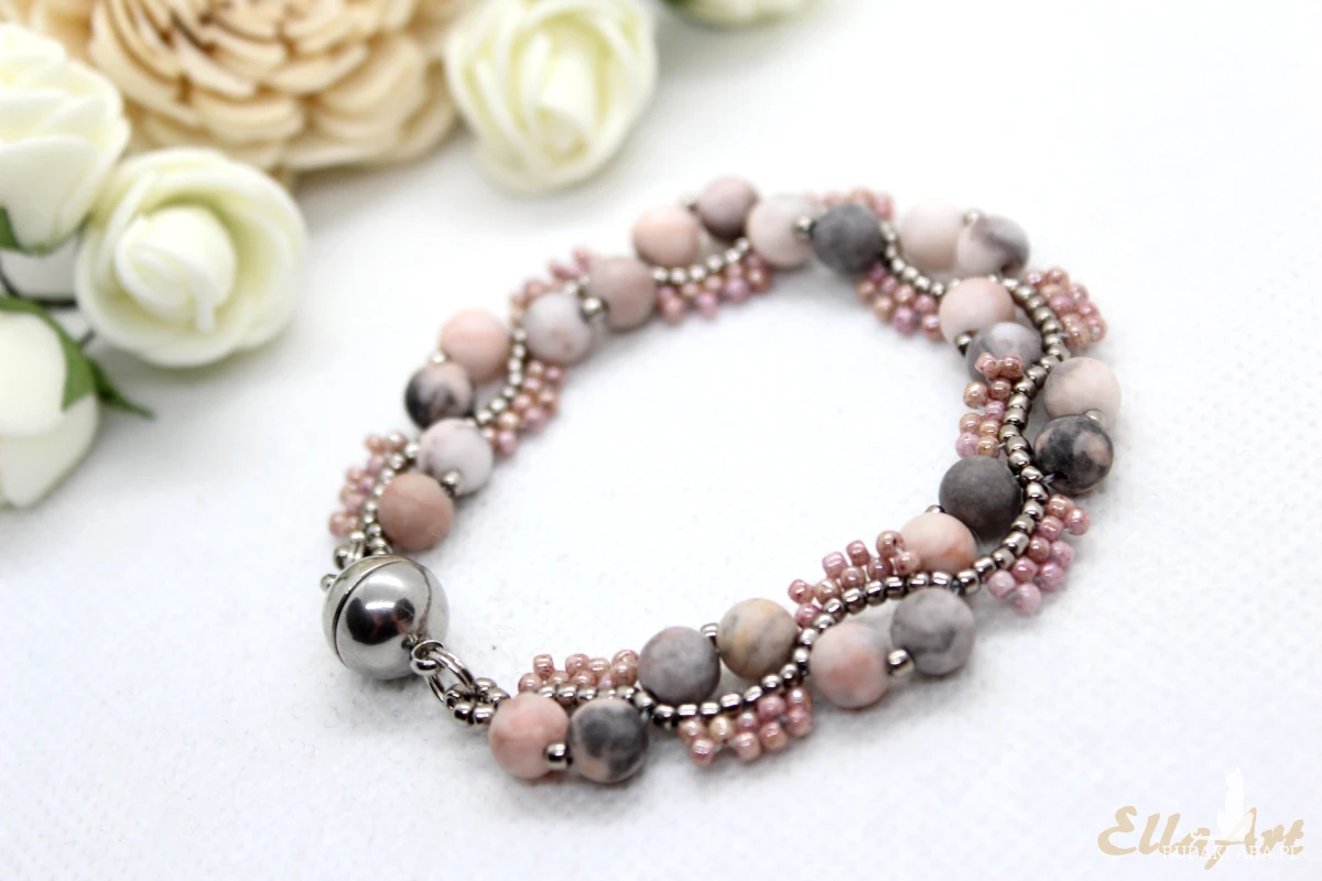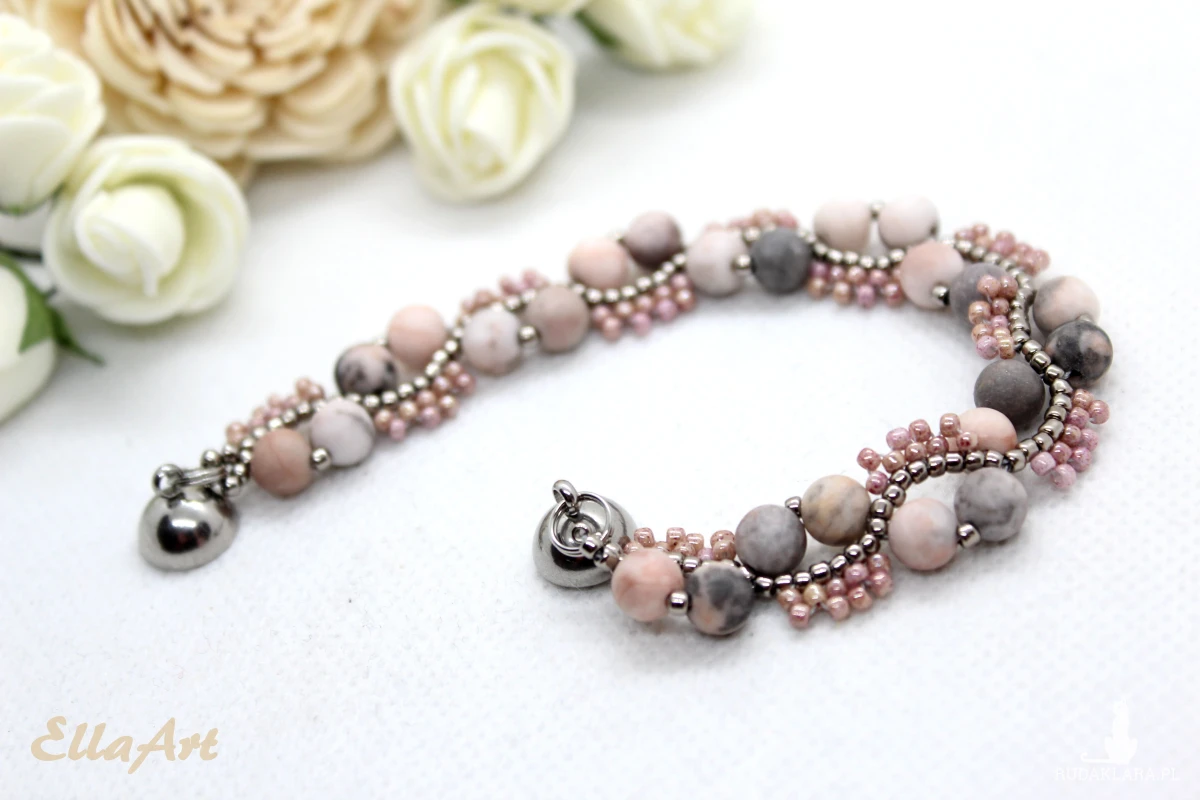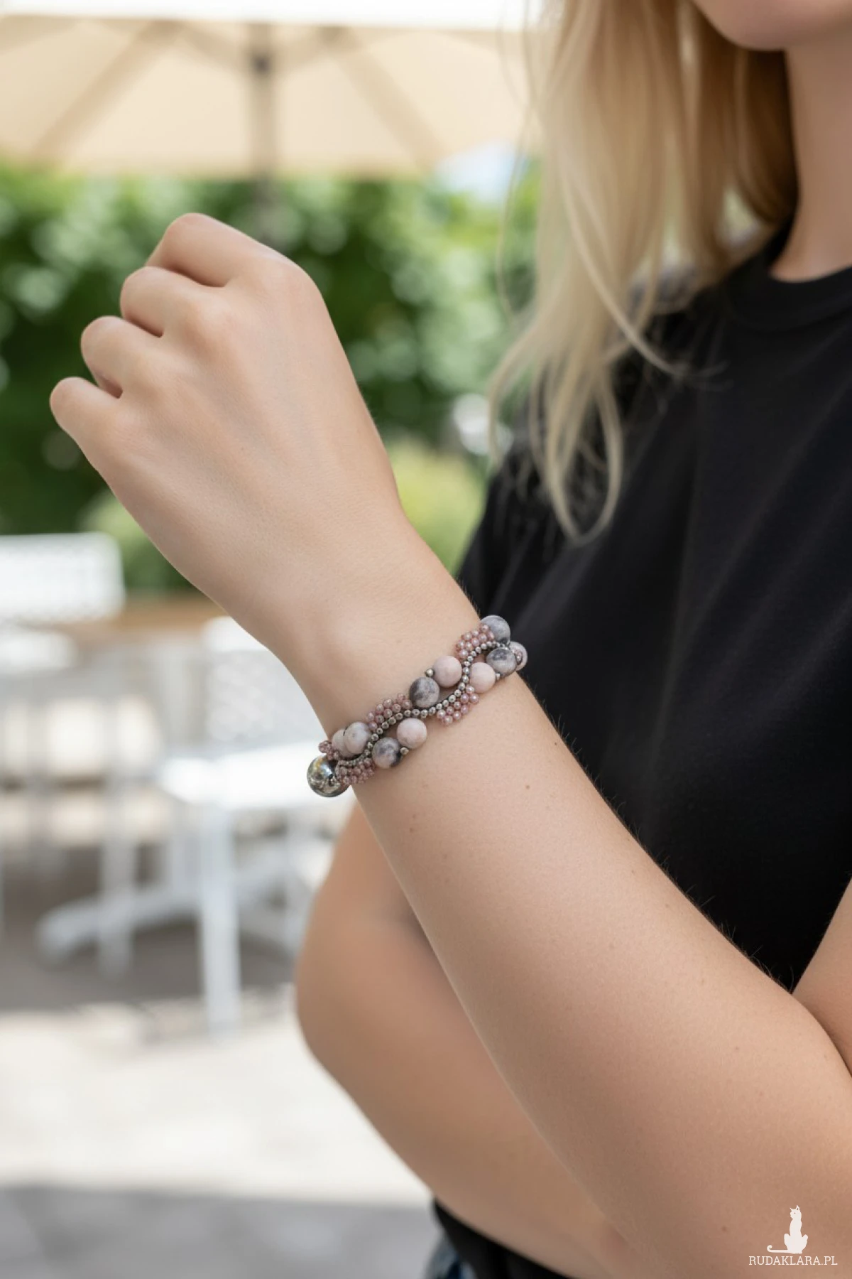 Bransoletka uszyta z kamieni naturalnych jaspisu "Pink zebra" oraz drobniutkich, szklanych koralików japońskiej firmy Toho.